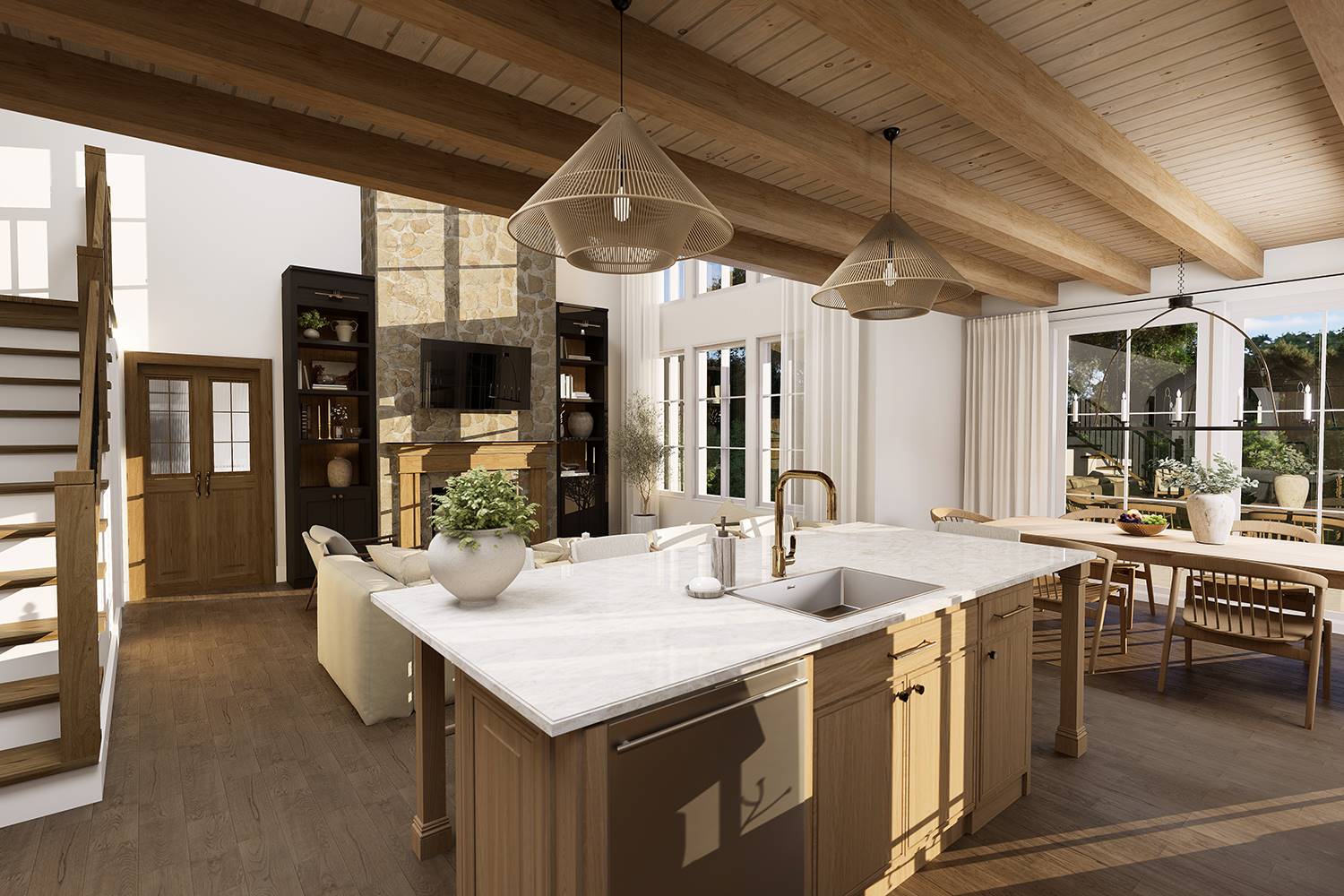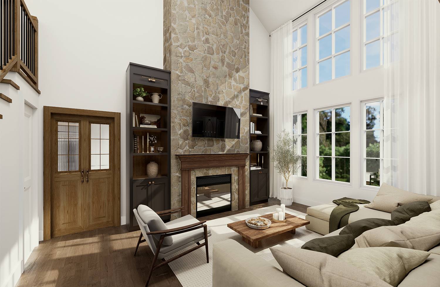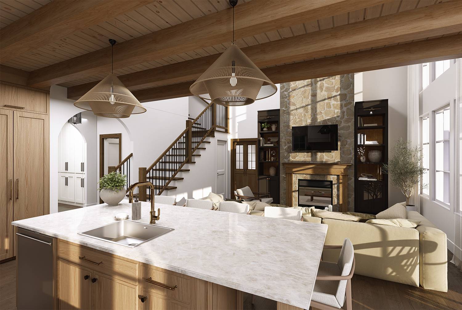 Designed for both beauty and livability, this home features 2,268 square feet of heated space with 3 bedrooms and 2.5 baths. An open main level connects the family room and dining space to a bright kitchen equipped with an island, breakfast nook, butler’s pantry, and generous walk-in pantry storage. The main-floor primary suite serves as a peaceful retreat with a sitting area, dual walk-in closets, and a well-appointed bath featuring a separate tub and shower. Arched openings and a two-story volume ceiling add character and openness to the central living areas. Secondary bedrooms are located upstairs, offering comfortable separation for family or guests. Outdoor living is a standout feature with a wraparound porch complemented by covered front and rear porches that extend the living space beyond the walls. Thoughtful details such as a home office, mud room, and first-floor laundry make this home as practical as it is inviting.