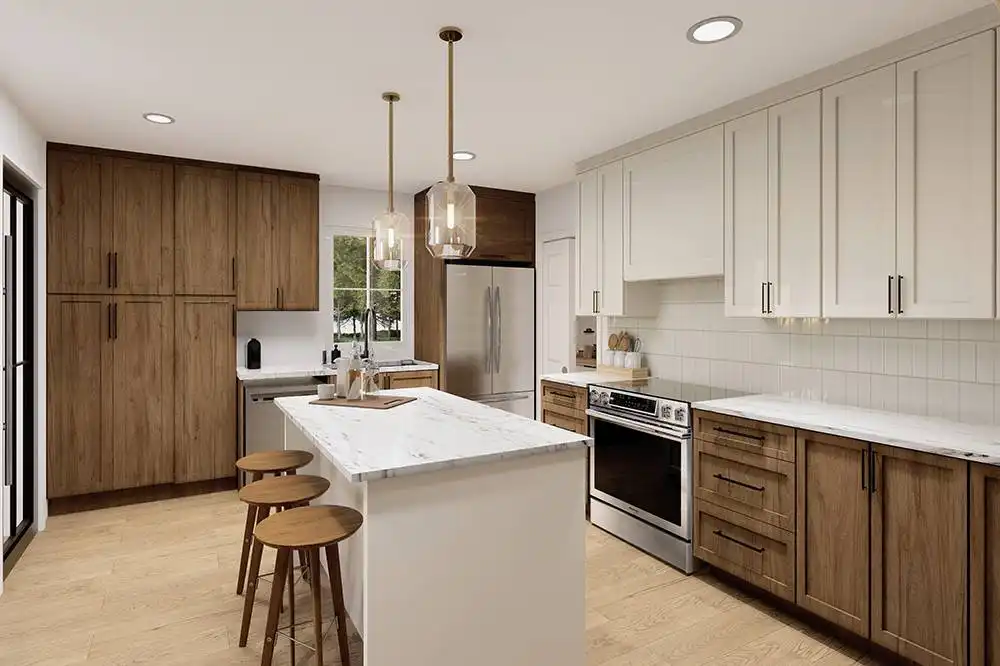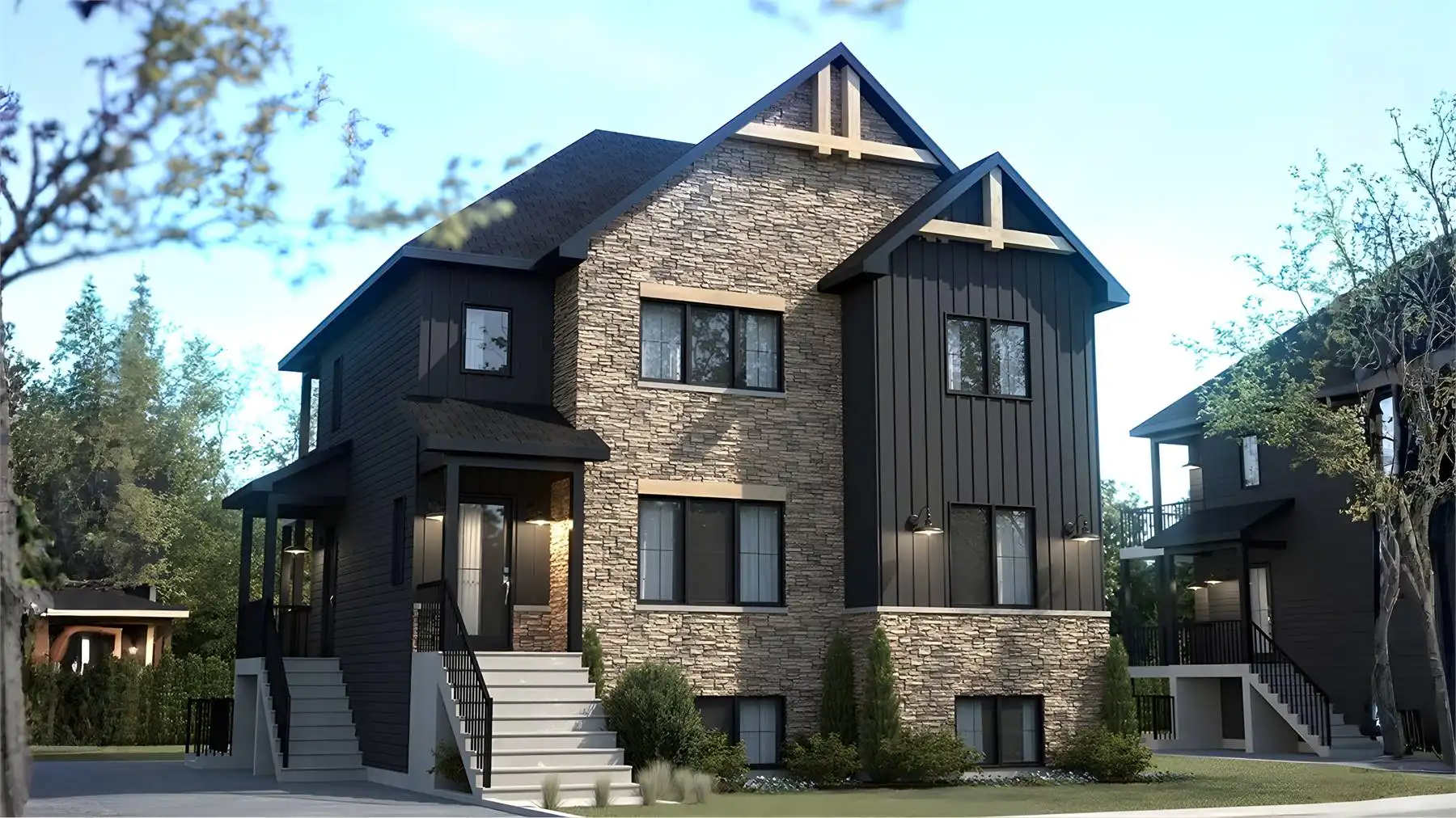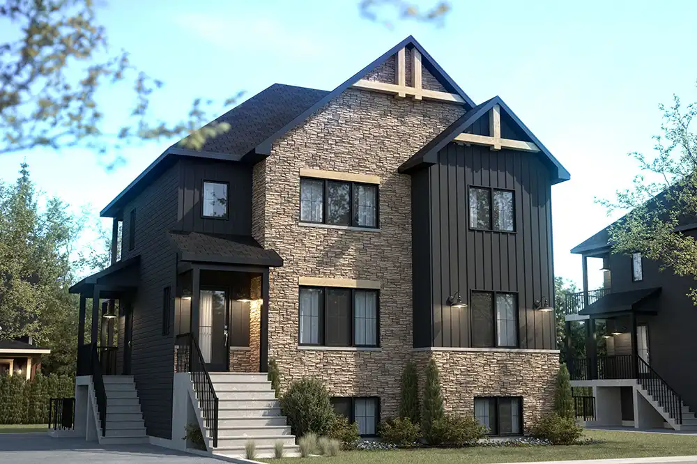 Need to maximize housing on your lot? Consider a triplex like House Plan 10694 that stacks its units from the finished basement through the second floor to keep its foundation small. This multi-family home offers 3,011 square feet in total, with 1,010 square feet in the first floor and basement units and 991 square feet in the second story unit. All three include open-concept living with an island kitchen and two bedrooms that share a hall bath between them. Make sure not to miss the thoughtful design details, like every unit having its own private entry and laundry!