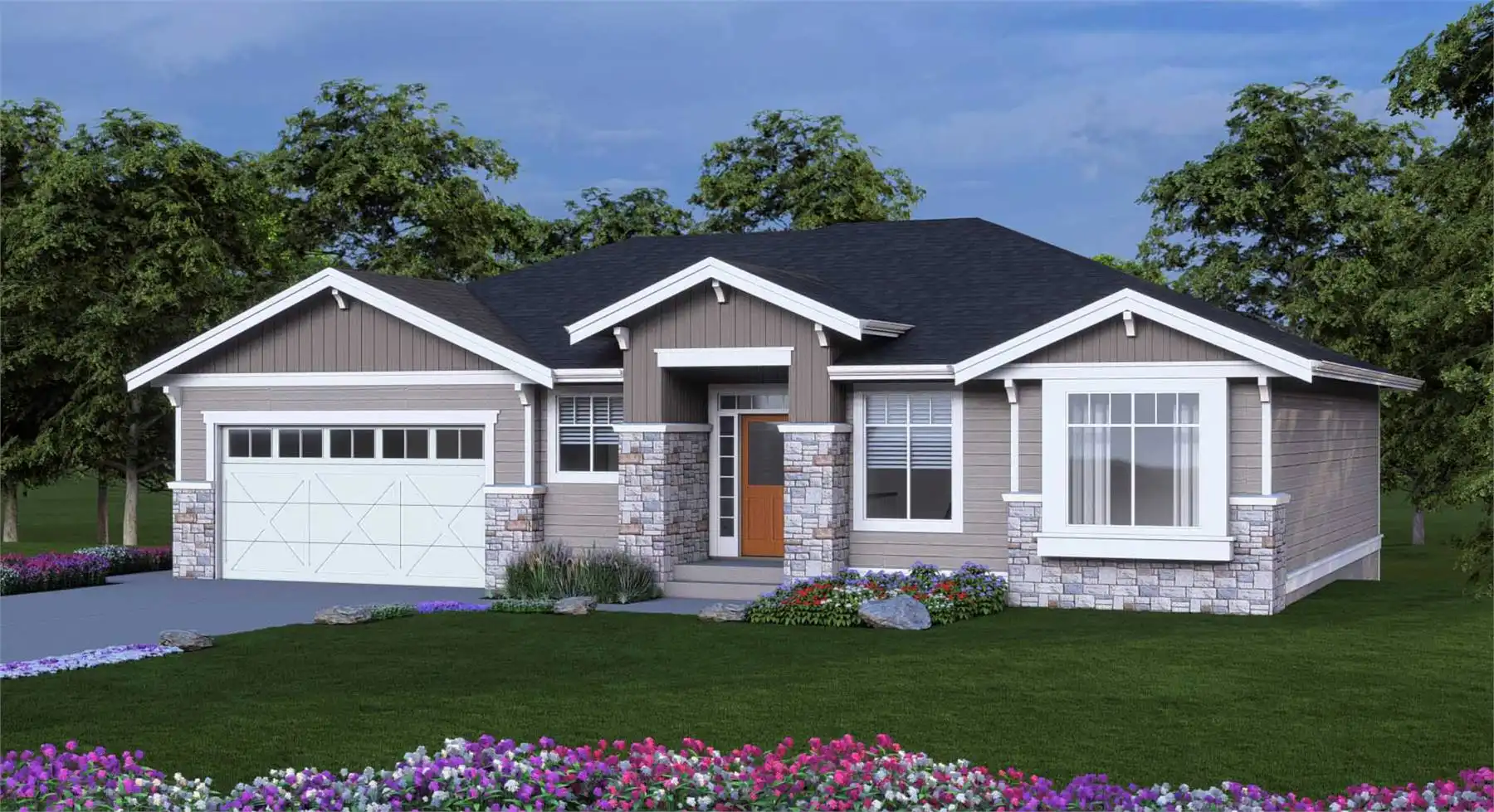 House Plan 10706 combines traditional charm with a smart, family-friendly layout across 1,576 square feet. The covered entry opens into a vaulted great room with a warm gas fireplace and easy access to a covered deck for year-round outdoor living. The open layout connects the great room and dining area, ideal for entertaining or family gatherings, while the kitchen features a six-seat breakfast bar and large corner pantry for added storage. The private master suite includes a spa-inspired ensuite with a soaker tub beneath a bright window, dual sinks, and a walk-in closet with built-in shelving. A second bedroom at the front of the home overlooks the garden, and a nearby full bath and linen closet ensure convenience. The laundry room offers direct access to the two-car garage and includes a storage cupboard for daily essentials. An unfinished basement provides future expansion opportunities, making this home both practical and flexible. With its gabled rooflines, decorative trim, and stone accents, Hathaway captures the best of comfort, craftsmanship, and enduring style.