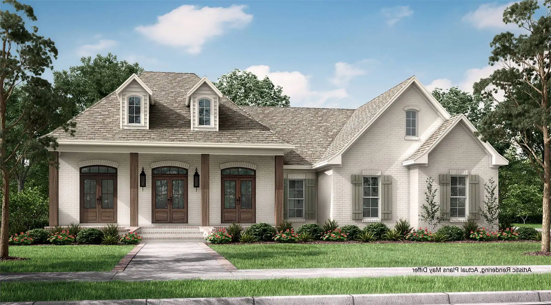 House Plan 10710 is an adorable French country home that offers 1,500 square feet, three bedrooms, and two bathrooms on one level. The floor plan places the open living in the center--with a cozy great room in front and the kitchen and dining in back--while the bedrooms are split across it for privacy. The primary suite boasts a five-piece bath and a large walk-in closet and the secondary bedrooms share a three-piece hall bath between them. Laundry by the entry from the two-car garage and a bonus room above complete this lovely little design!