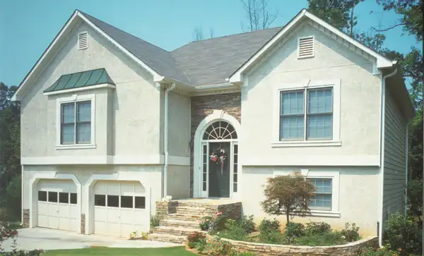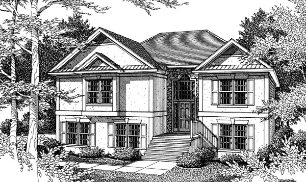 Elegant stone elements accent the dramatic Palladian entry minimizing the typical feel of a split foyer plan. The volume entry leads to a view of the vaulted living room ceiling framing the fireplace on the back wall. A beautiful master bath features dual vanities, separate shower and closeted commode. A separate formal dining room adds another touch of elegance. As a side-loaded garage, there is room for 3 cars. The front loaded garage option provides great storage and room for a workshop. With room to grow, the ground level allows for a 4th bedroom and playroom.
