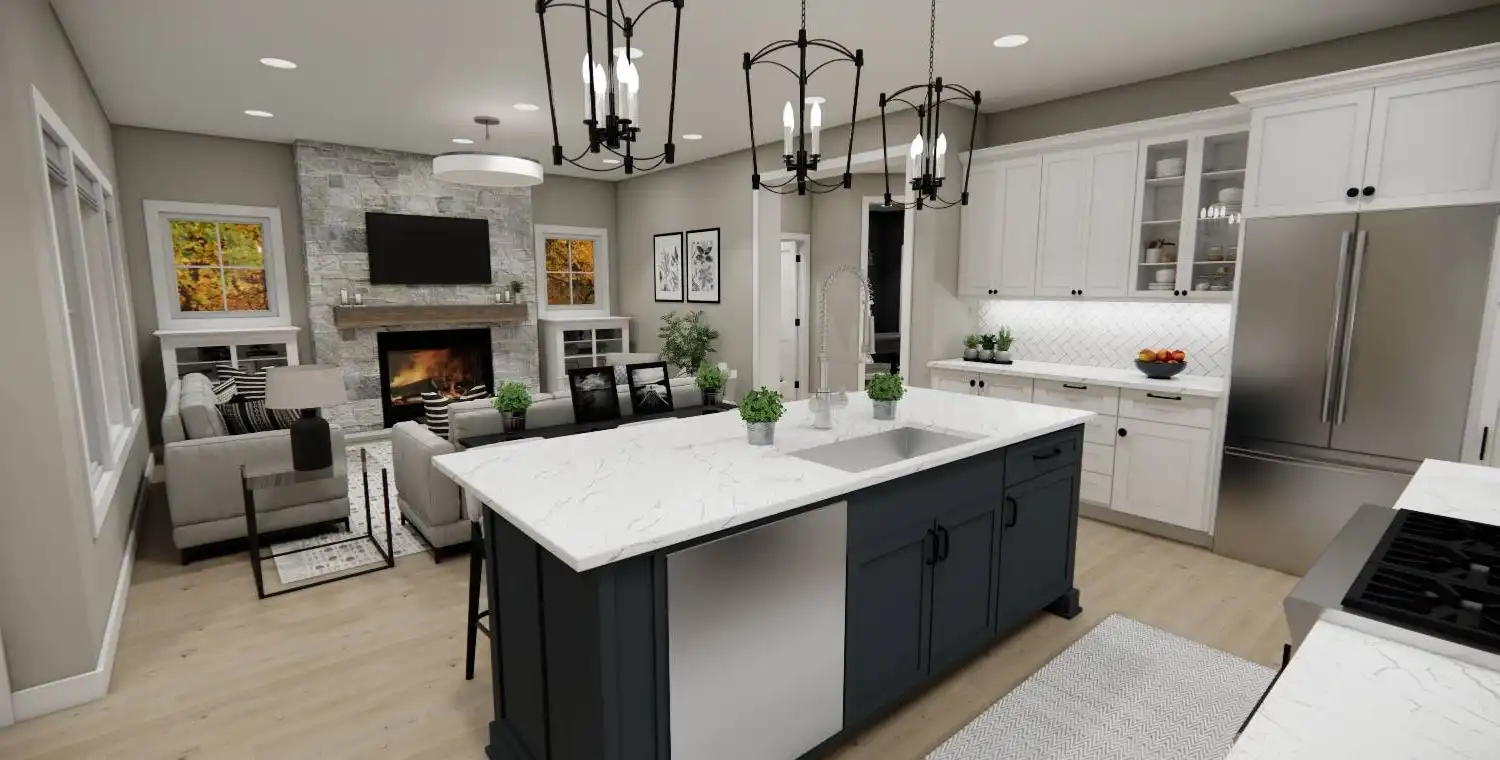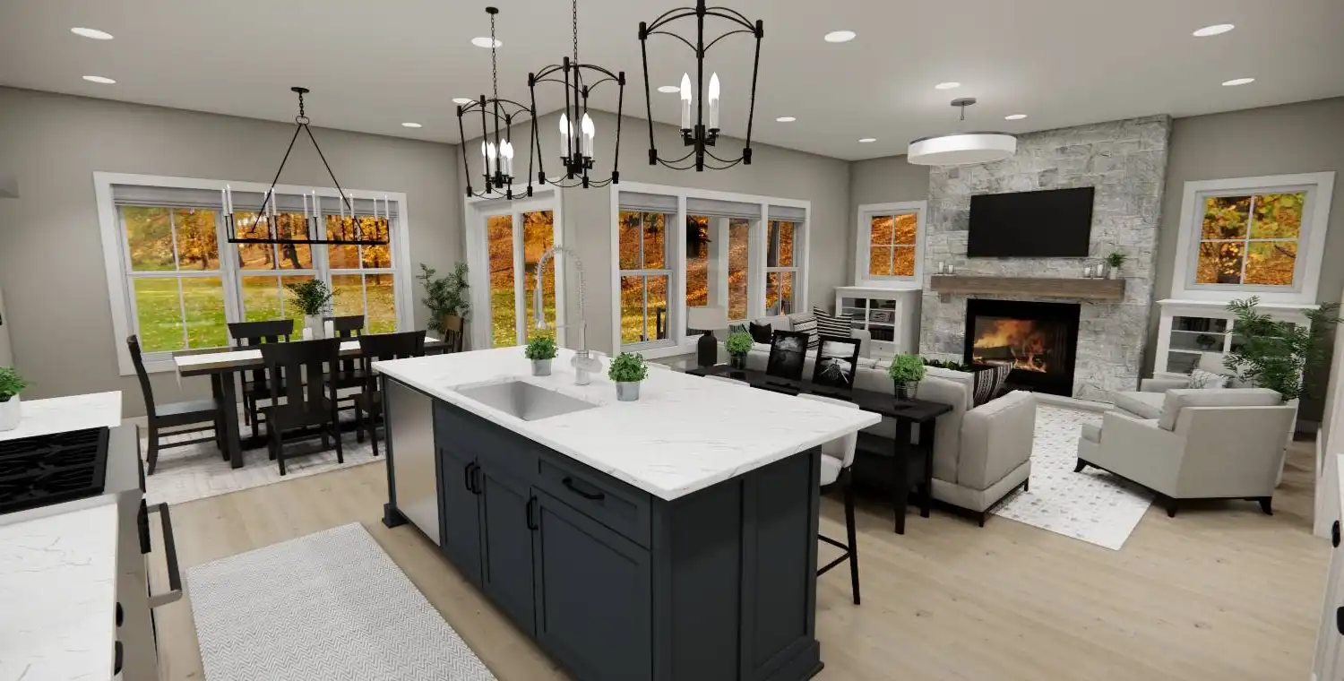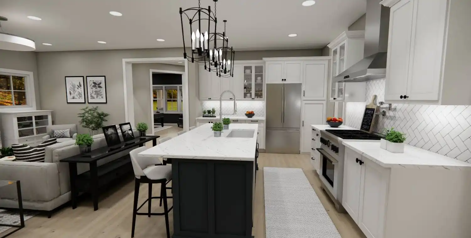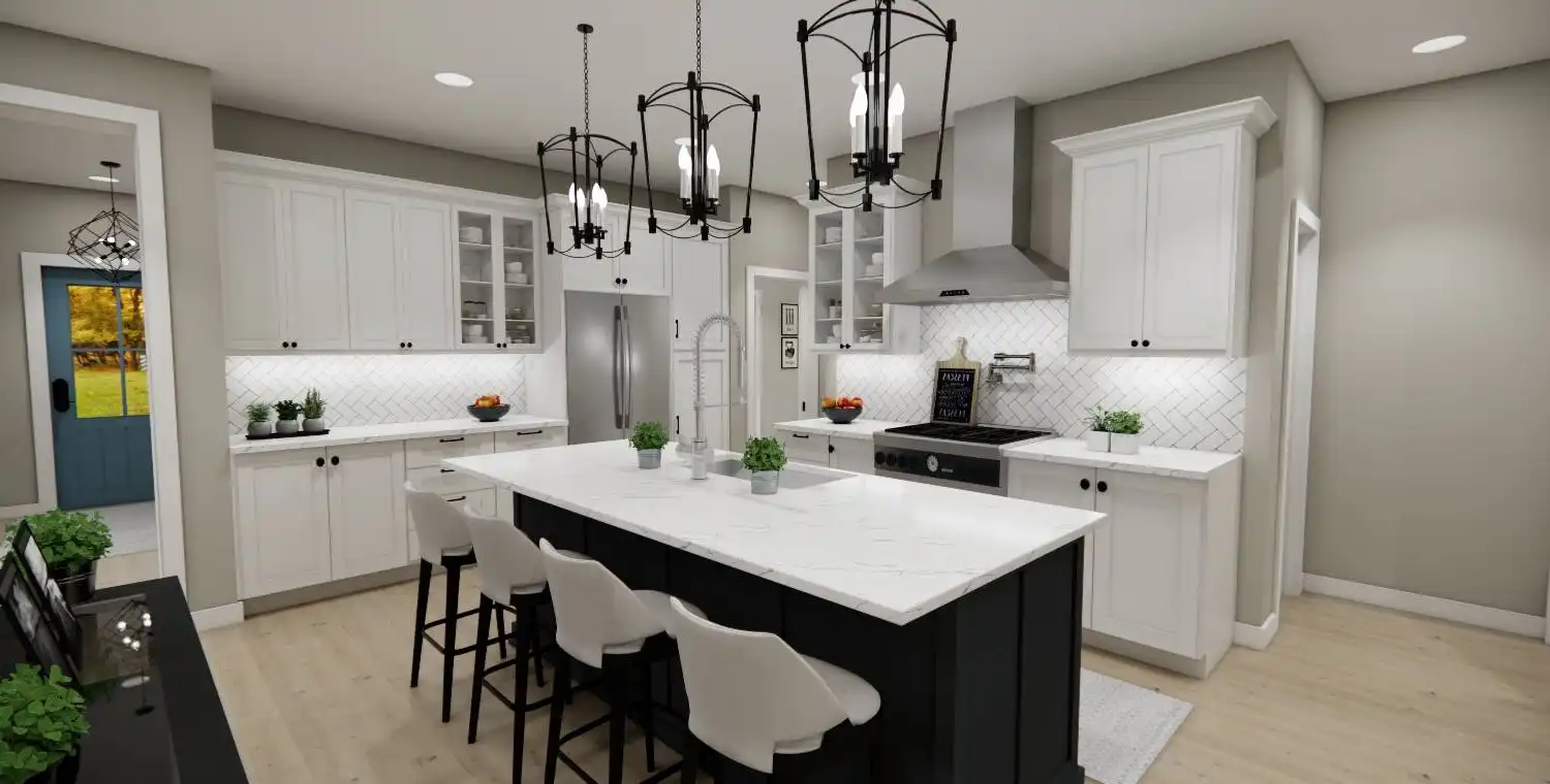House Plan 10738 delivers the perfect blend of farmhouse charm and modern functionality in a smart two-story design. This 3-bedroom, 2.5-bathroom home welcomes you with a classic front porch and a bright foyer with 9-foot ceilings throughout the main level. Just off the entry, a versatile office provides a comfortable work-from-home space. The kitchen is a true centerpiece, featuring a large 8-foot island, ample counter space, and seamless connection to the dining area and cozy great room with a fireplace—ideal for gatherings and everyday living. The main-floor primary suite serves as a private retreat with a spacious walk-in closet and a luxurious ensuite bath with double vanities, a soaking tub, and a separate shower. Upstairs, two additional bedrooms with walk-in closets share a full bath and surround a spacious loft that offers flexibility for a media room, game area, or lounge. Additional features include a mudroom with laundry off the 2-car garage and plenty of storage throughout, making House Plan 10738 perfect for families, entertainers, and those who value a warm and functional home.