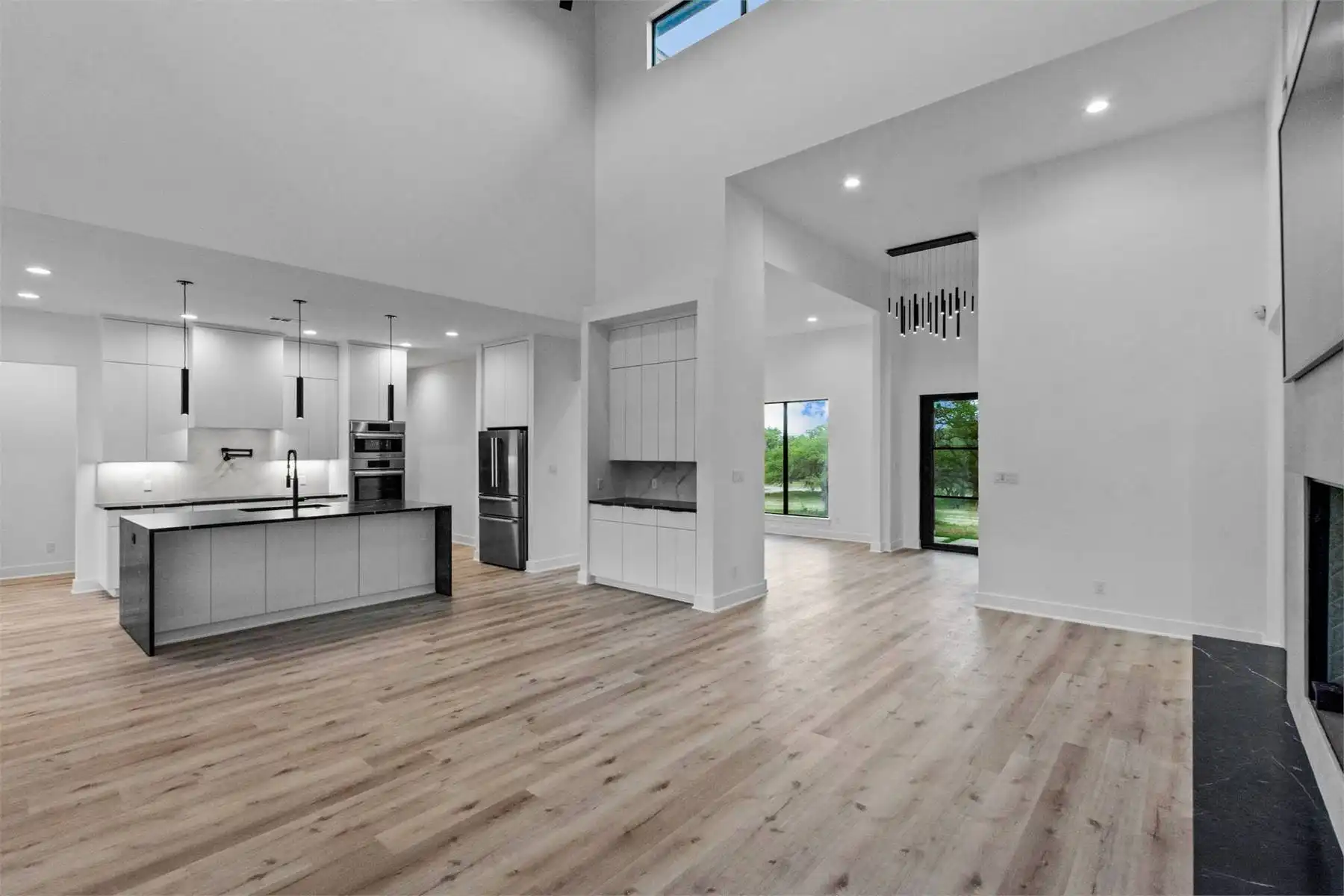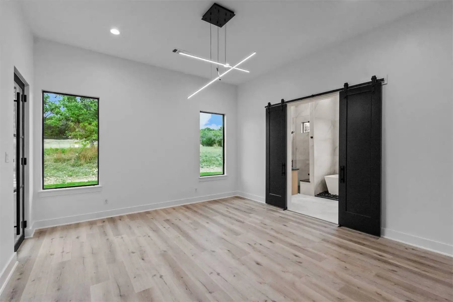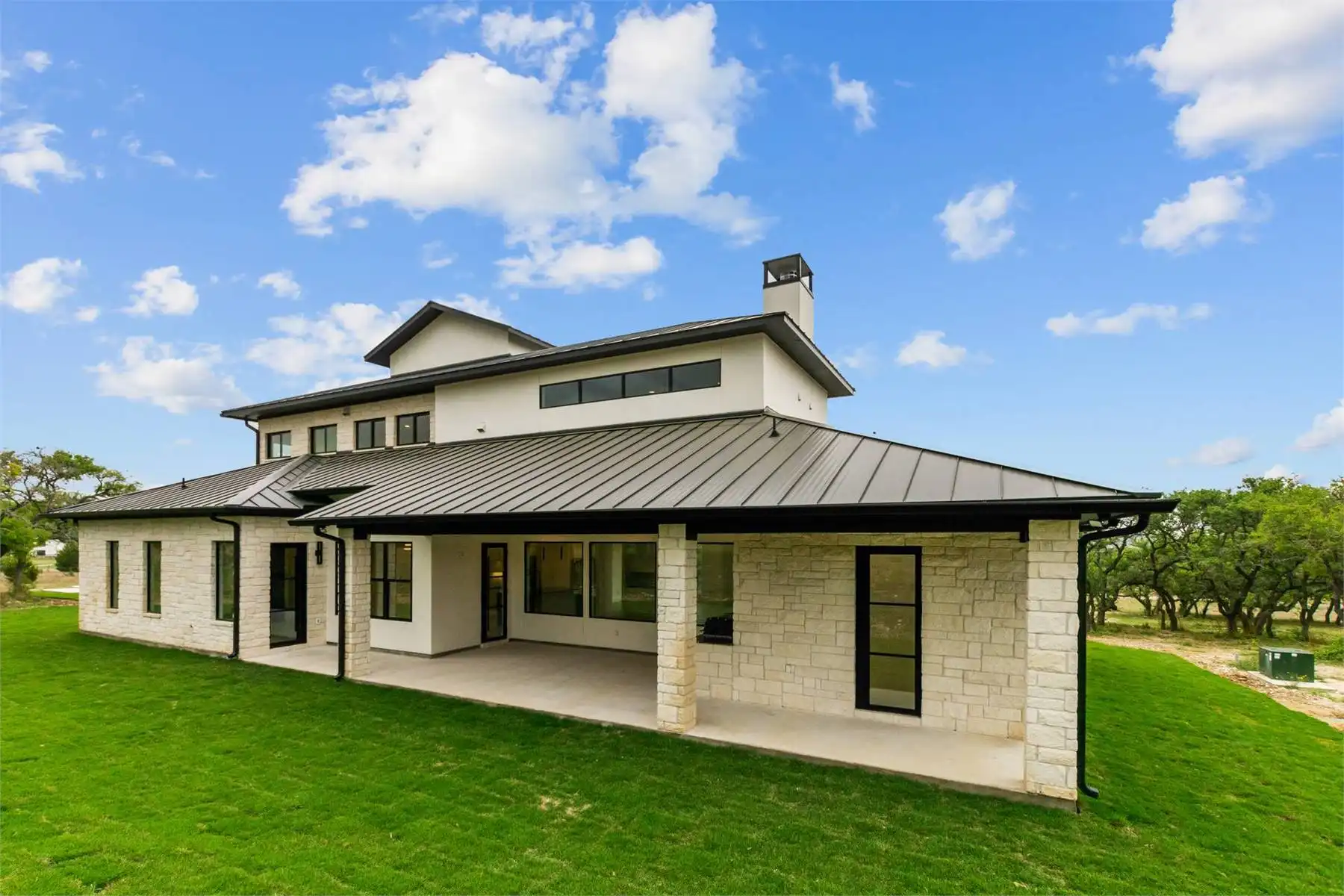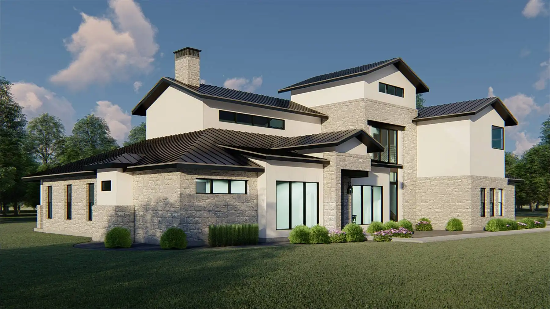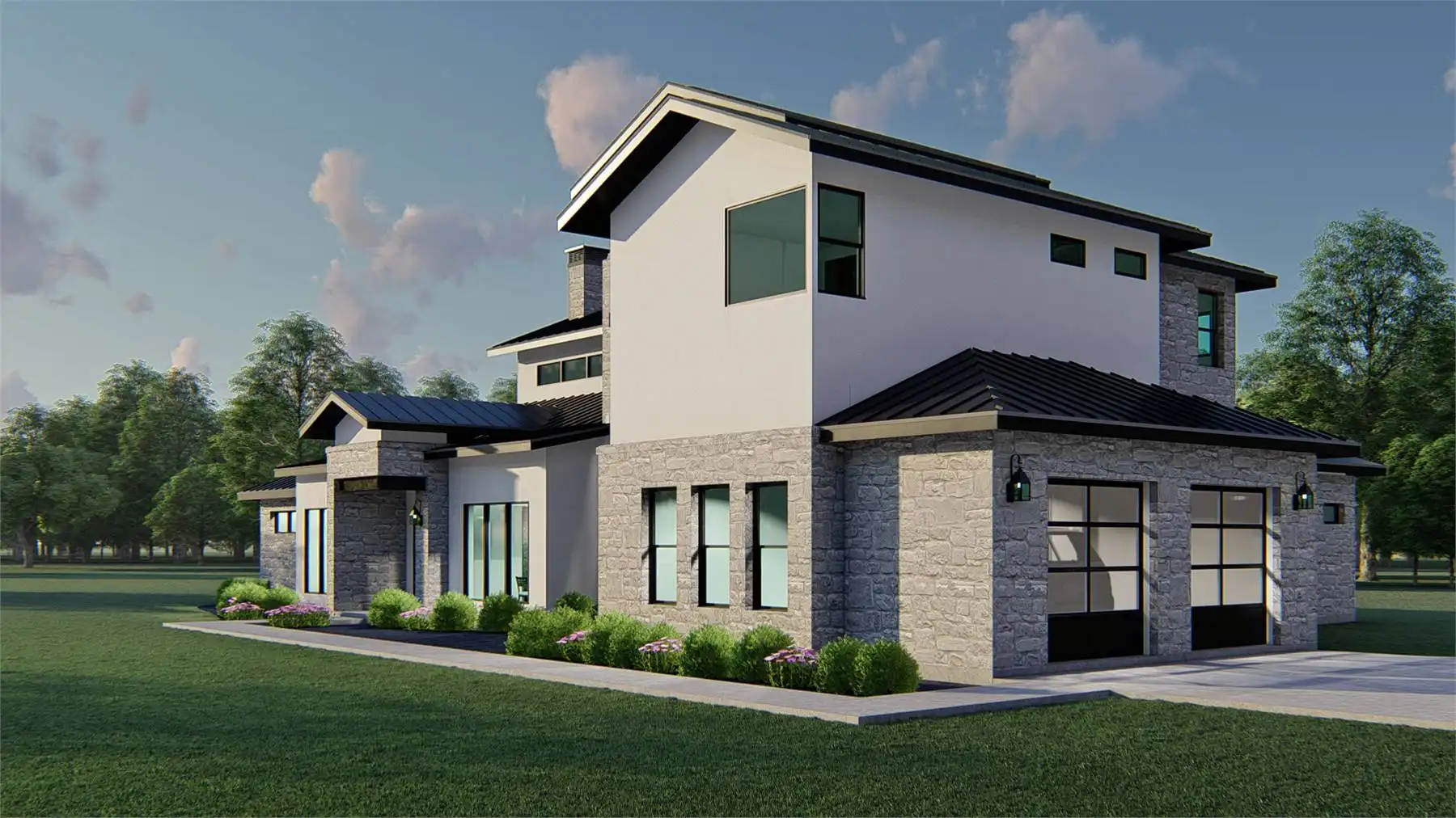 House Plan 10741 delivers over 4,000 square feet of elevated living across two levels, featuring 4 bedrooms, 5 bathrooms, and a flexible layout made for modern families. A formal dining room greets you off the foyer, while two private offices offer dedicated spaces for work or hobbies. The main level also includes a guest suite with an ensuite bath and a fitness room with its own full bath. The heart of the home is the vaulted great room with a statement fireplace, which opens to a sprawling covered patio and connects seamlessly to the contemporary kitchen with a large island and casual breakfast area. The private primary suite provides a peaceful retreat with a spa-inspired bath and a large walk-in closet. Upstairs, two bedrooms with private baths and a central bonus room offer plenty of space for kids, guests, or entertainment. A side-entry three-car garage adds convenience and curb appeal.