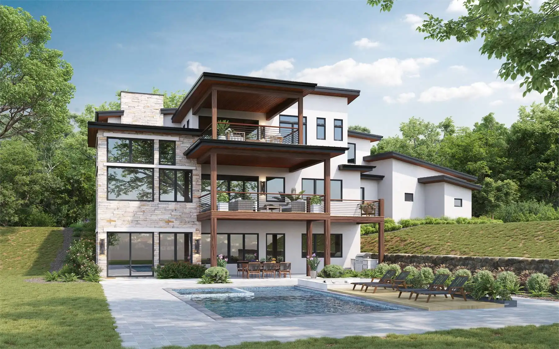 House Plan 10781 combines bold modern design with family-friendly functionality across 3,155 square feet. The two-story layout is perfect for sloped lots, with a walkout basement that adds 955 sq. ft. of finished space and access to a rear patio (see lower-level floor plan). Inside, the home showcases clean lines, expansive windows, and a seamless flow between the kitchen, dining room, and family room. A 2-car angled garage with rear storage connects through a large mudroom and pantry, ideal for daily routines. The main floor also includes a dedicated home office and a junior suite with an elevated loft nook—perfect for a creative retreat or reading space. Upstairs, the master suite enjoys covered deck access, while two more bedrooms offer ample room for family or guests. With 964 sq. ft. of unfinished basement space for storage or future customization, House Plan 10781 offers flexible living with modern appeal.