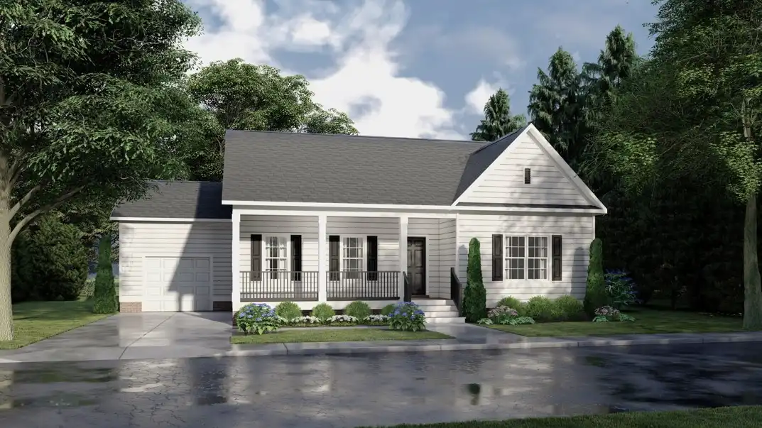 With its classic country curb appeal and ample yet modest interior, House Plan 10789 makes a wonderful family home. It offers 1,656 square feet with three bedrooms and two bathrooms, and there's a one-car garage set back on the side. Enter through the front door and the floor plan groups all the bedrooms and bathrooms with the laundry room in one hallway. On the opposite side, the great room spreads from the living space to the island kitchen. Check out that vaulted ceiling! There's also a mudroom in the very back that connects to the garage.