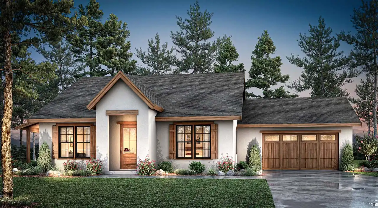 House Plan 10800 is a lovely little cottage with rustic style. It offers 1,755 square feet, three bedrooms, two bathrooms, and a two-car garage in a neat and affordable package. The floor plan is roughly split down the middle, with common areas on one side and the bedrooms on the other. The open-concept great room is anchored by a U-shaped island kitchen in back and a vaulted living area in front. The dining in the middle connects to the side covered patio. The front hallway has two bedrooms and a hall bath while the back hallway has the three-piece primary suite and the laundry room that connects to the front-entry garage on the side.
