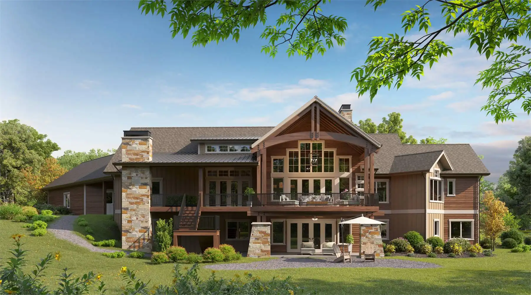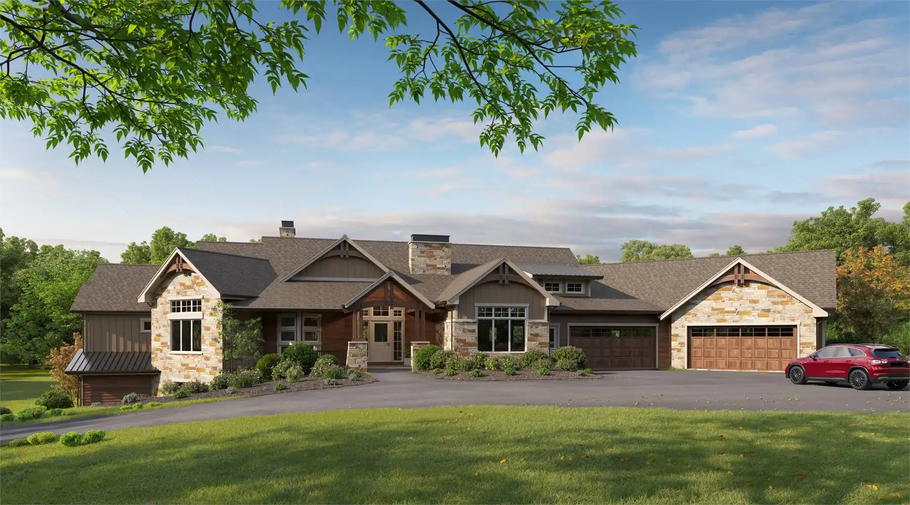House Plan 10808 is a striking Craftsman Ranch designed to embrace rear-view lots and mountain landscapes, with 3,985 square feet of main-level living and an optional lower level offering 3,621 more square feet for expanded living space and guest accommodations. The unique 4-car garage features both front-facing and angled bays with generous 16' by 8' overhead doors. Vaulted ceilings elevate every room, while a focus on outdoor living is evident in the rear deck, accessible from multiple rooms and equipped with its own fireplace and outdoor kitchen. The master suite offers a serene retreat with a vaulted sitting area and an oversized walk-in closet for two. A study placed at an angle adds architectural interest, while the vaulted guest suite is thoughtfully separated for privacy. Entertaining is seamless thanks to the combination of a large walk-in pantry and a separate service kitchen that keeps the main kitchen tidy and guest-ready.
