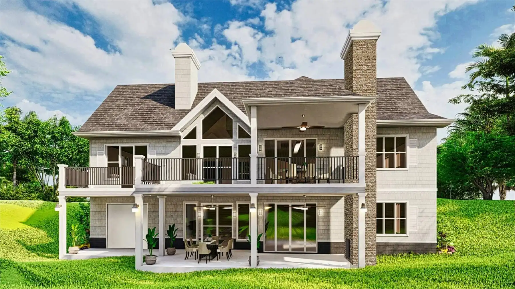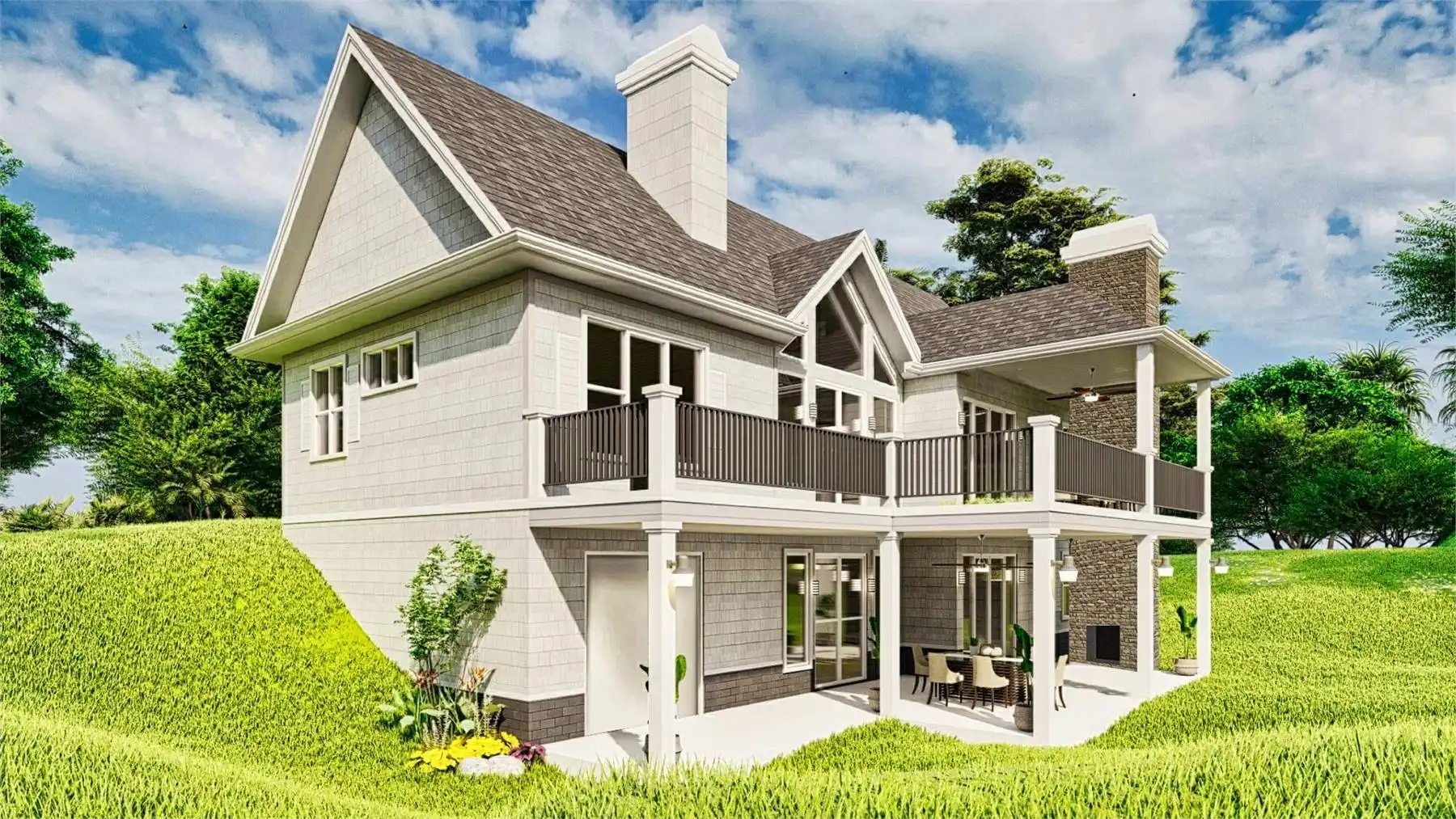 House Plan 10826 is a warm and inviting craftsman-style home with incredible spaces for both everyday living and entertaining. The heart of the home is the vaulted lodge room with a built-in fireplace, flowing into the kitchen and breakfast area to the right. A covered rear porch with its own fireplace invites outdoor gatherings in any season. The private master suite includes a spa-like bath with soaking tub, walk-in closet, and direct access to the rear deck and porch. Two more bedrooms, a shared bath, and laundry room complete the main floor. The terrace level is ideal for hosting and relaxing, offering a large social and game room, a full bar, two additional bedrooms, a bathroom, and walk-out access to a patio and backyard lawn.