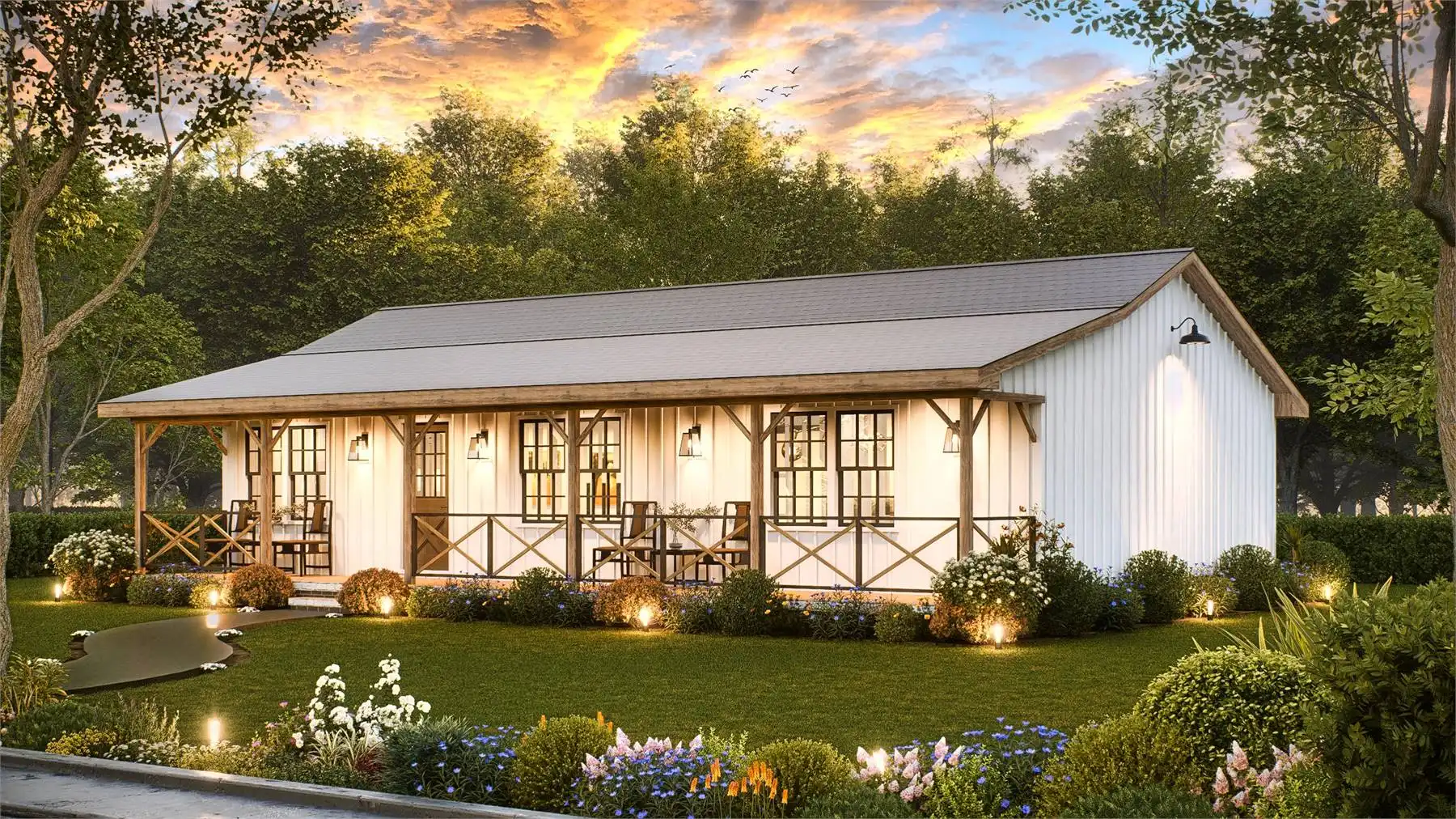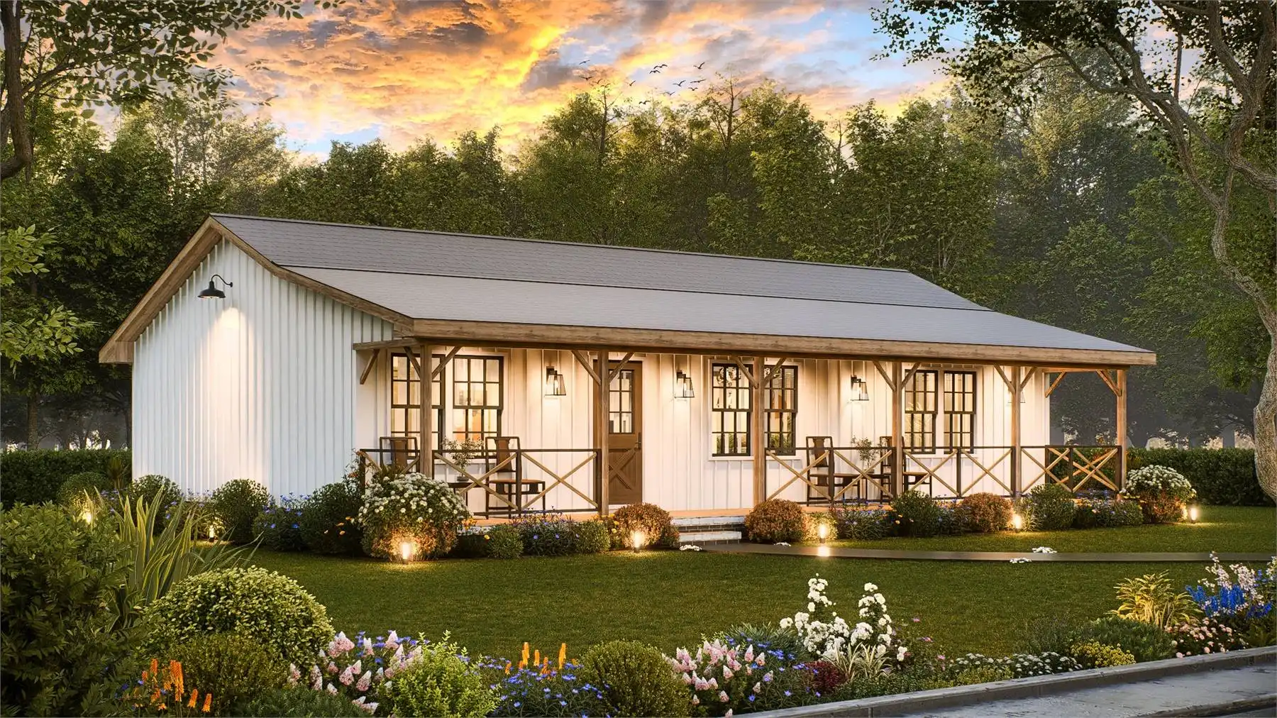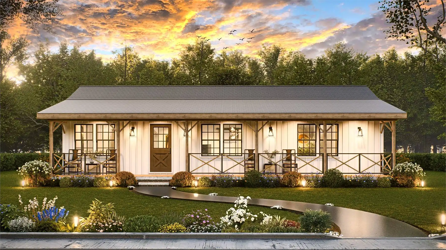 House Plan 10828 is a thoughtfully designed 3-bedroom, 2-bath country-style ranch home with cozy charm and an efficient footprint. The home features a functional open-concept layout in the main living area, making everyday living easy and comfortable. The split-bedroom floor plan ensures privacy, with the primary suite tucked away from the secondary bedrooms. A covered front porch adds inviting curb appeal, while a small back stoop provides easy access to the yard. Perfect for narrow lots or smaller properties, this 44' x 33' 4" design is well-suited for rural or suburban settings alike. With its timeless ranch design and no garage, House Plan 10828 offers affordability, style, and simplicity in one beautiful package.