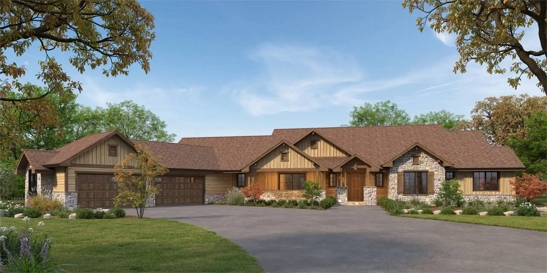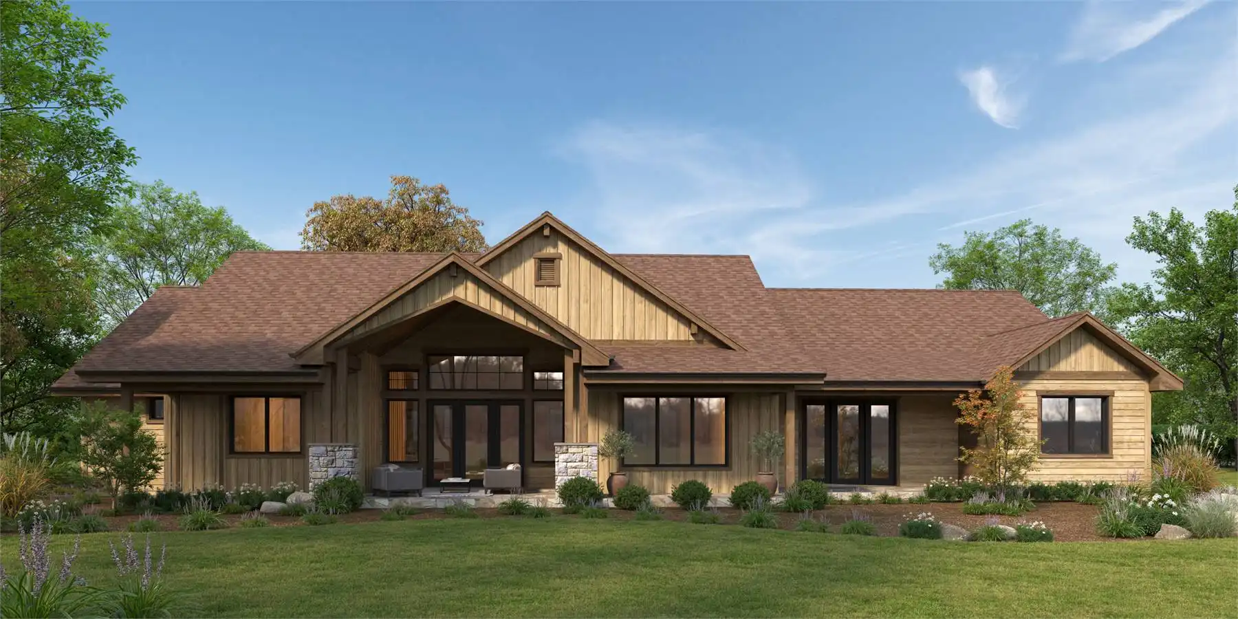 House Plan 10830 really checks the boxes for today's families! This rustic ranch boasts 3,526 square feet with four bedrooms and three-and-a-half baths in total, but they're smartly split between the main house and an in-law apartment to maximize privacy for multi-generational living. The great room is the heart of the house and includes a vaulted living area and a large island kitchen. The family bedrooms are grouped in the hallway to the side. The primary suite enjoys rear views while the secondary bedrooms look out the front. There's also an office off the foyer that connects to a courtyard to catch the breeze. Go through the mudroom to find the in-law apartment with a kitchenette, cozy living area, one bedroom, and one bathroom. Whether you're catering to aging parents or an adult child, they're sure to love this setup! A four-car garage and porches in front and back round out this home.