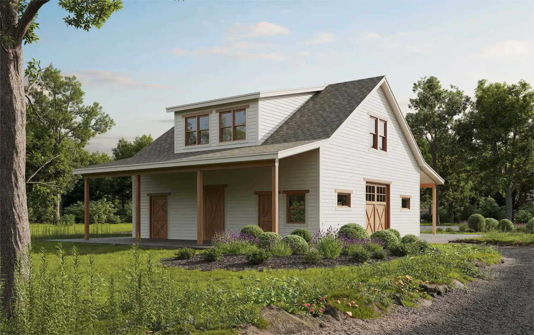 This multi-purpose country barn design is ideal for equestrian enthusiasts and property owners looking for functional living space. The main level includes four horse stalls, a dedicated tack room, and two covered porches—perfect for working with animals or enjoying quiet outdoor moments. Upstairs, a 1,026 sq. ft. apartment offers 2 bedrooms and 2 bathrooms, providing comfortable accommodations for guests, caretakers, or extended family. The living quarters are well-suited as an accessory dwelling unit (ADU) or rental opportunity. With a thoughtful layout and rustic appeal, this barn plan supports both daily animal care and modern living. Its efficient footprint and dual-purpose design make it a great addition to farms, ranches, or large residential lots. Blending country charm with practical features, this structure meets a variety of lifestyle needs.