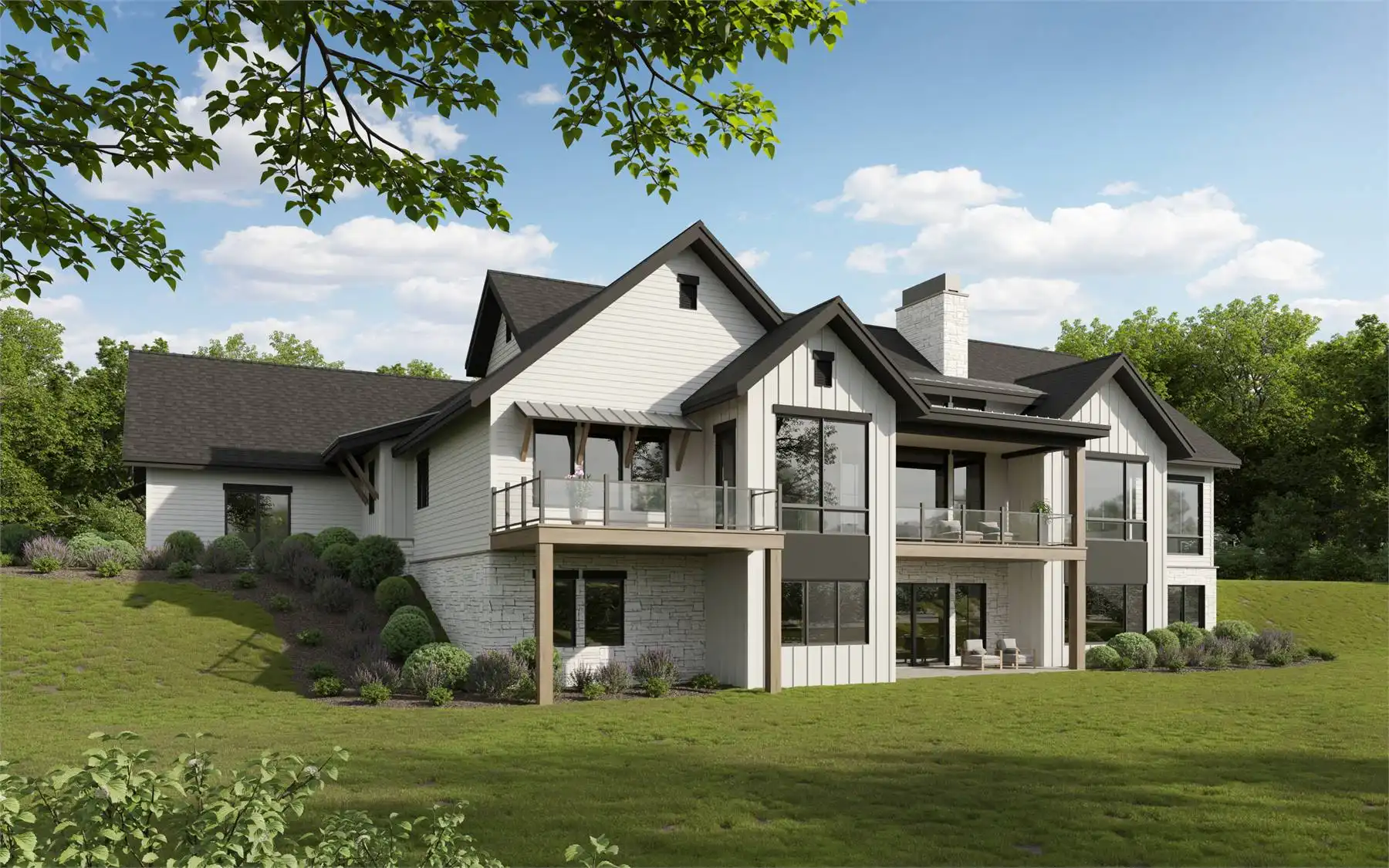 House Plan 10856 is a beautifully crafted transitional modern farmhouse that embraces open-concept living and smart functionality. The main floor boasts 2 bedrooms and 2.5 bathrooms spread across 3,250 square feet, with highlights like a vaulted great room, island kitchen, walk-in pantry, and an elegant home office. The primary suite is privately situated with a spa-like bathroom and generous walk-in closet, while Bedroom Two is ideal for family or overnight guests. A large covered deck off the dining area invites you to enjoy outdoor living in style. When finished, the lower level adds significant square footage with 3 additional bedrooms, a spacious family room, and a built-in bar—making this plan perfect for hosting or growing households. Thoughtful details like the large mudroom, ample storage, and a sprawling 3-car garage complete the design. Whether you're building in the suburbs or countryside, House Plan 10856 is a refined and flexible home for modern living.
