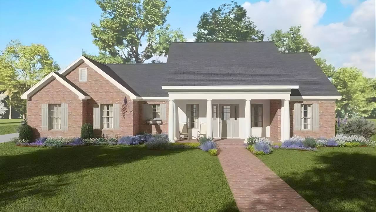 House Plan 10875 blends traditional brick styling with a warm and functional southern-style floor plan. The front porch provides a gracious welcome into the foyer and great room, where natural light and open spaces create an inviting atmosphere. The kitchen and dining area connect seamlessly to the living space and include a center island and walk-in pantry for everyday ease. The primary suite offers privacy and comfort with its walk-in closet and well-appointed bathroom, while the additional two bedrooms share a full hall bath on the opposite side of the home. A rear-entry attached garage keeps vehicles tucked away out of view, preserving a clean and elegant front elevation. The covered rear porch adds valuable outdoor living space and is perfect for meals, gathering, or simply relaxing. With one-floor convenience and timeless southern charm, this home is both practical and welcoming.