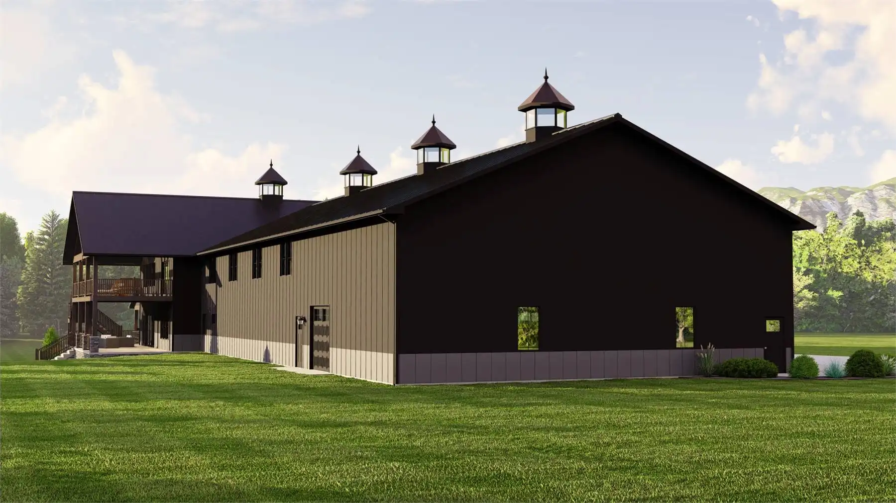 House Plan 10896 offers 4,601 square feet of modern farmhouse living with expansive wraparound porches, soaring ceilings, and flexible multi-use spaces. The main floor features an open-concept living and dining area with two-story ceilings and a central fireplace, complemented by a spacious L-shaped kitchen and island. A front den provides options for a home office or guest suite, while the private rear primary suite includes a spa-inspired bath with a soaking tub, separate shower, and a large walk-in closet. A built-in safe room adds an extra layer of security. Upstairs, two more bedrooms, a full bath, and a loft provide versatile living space for family or guests. The attached 4-car garage includes RV storage, a workshop, kitchenette, and full bathroom—perfect for those who work from home or need space for tools, gear, or creative projects. This home balances classic charm with highly functional features built for today’s lifestyle.