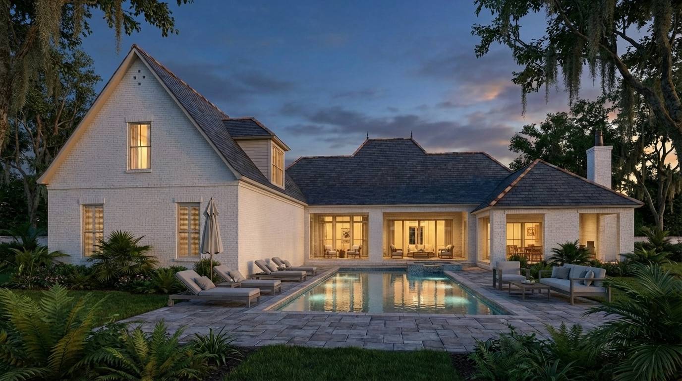 House Plan 1094 is a beautiful Louisiana style home with 4,464 square feet of living space. This spacious floor plan features a home office, four spacious bedrooms, a three-car garage and beautiful outdoor living space. Also, this plan has a bonus room above the garage that can be easily converted into a family game room, home theater, or additional bedroom! Enjoy outdoor living with a wood burning fireplace, grilling and bar area, and outdoor pool bathroom! The master bedroom features a massive walk-in his and her closet, gas burning fireplace, and separate bath and shower! Additional features include wine cellar, open floor plan, 1