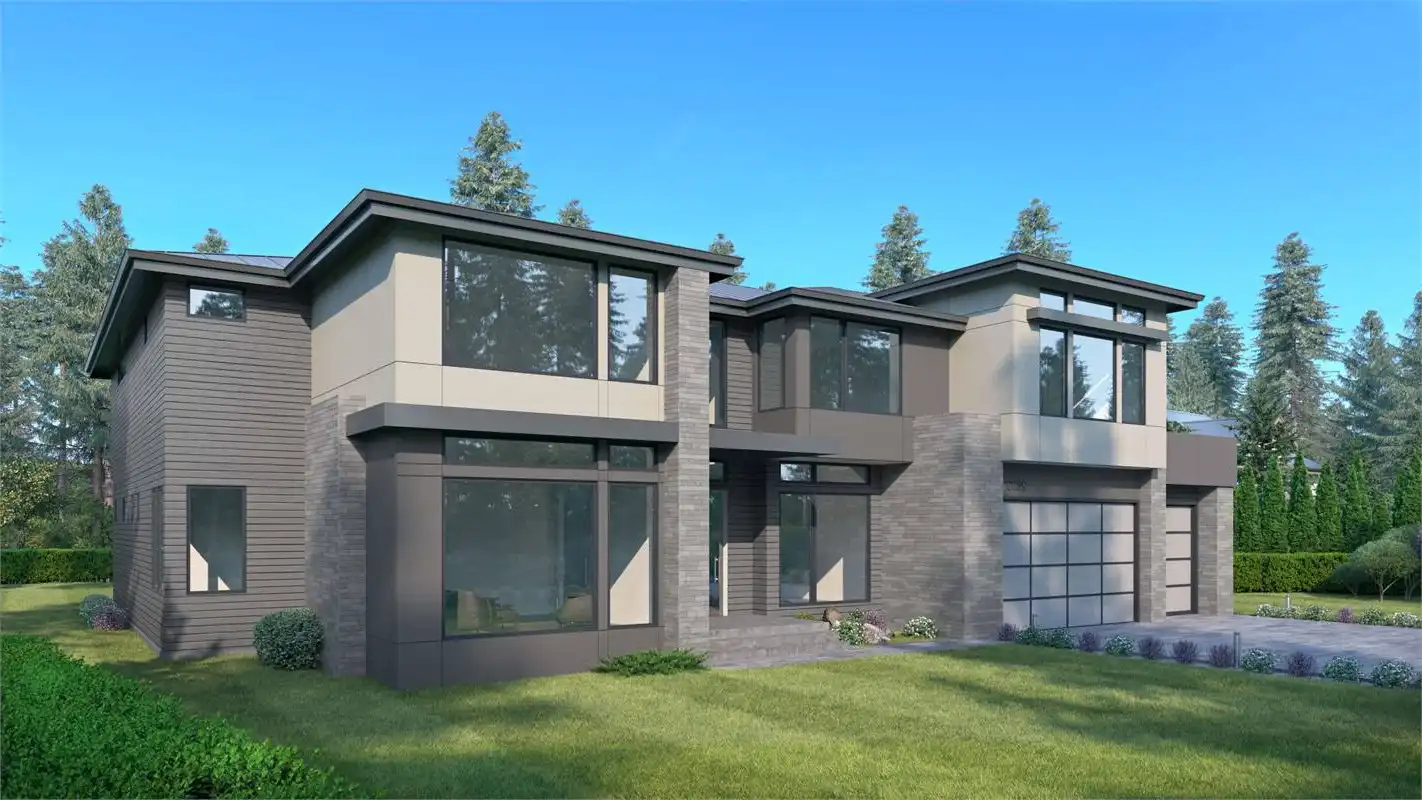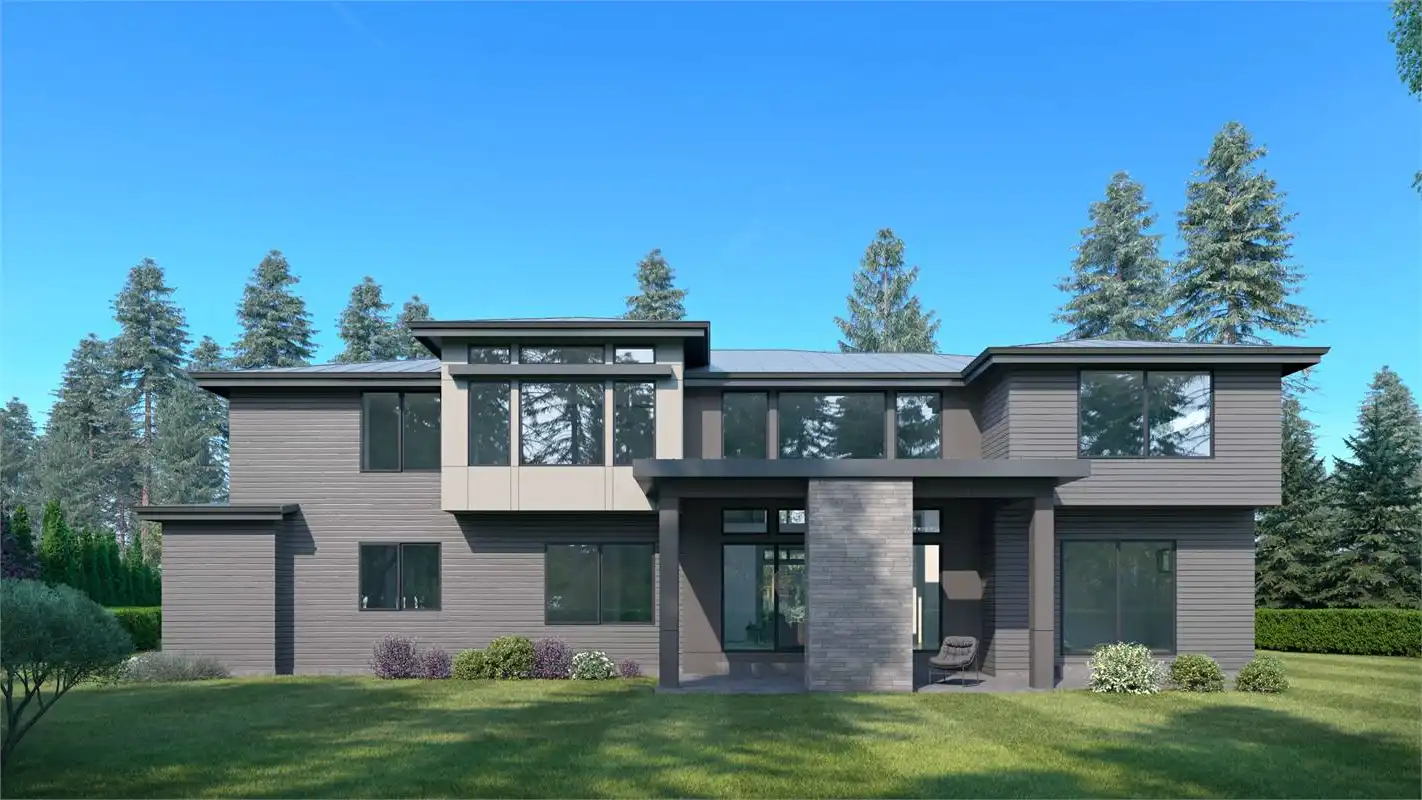 Where to begin with this outstanding luxury modern home! House Plan 1096 offers 5,900 square feet with five bedrooms and five-and-a-half baths across two stories. The main level is where you'll find a great mix of formal and informal living areas. There are formal dining and living rooms in front, across the foyer, while the amazing U-shaped island kitchen is open to the two-story great room in back. There's also a den, a guest suite, a powder room, a mudroom, and a separate prep kitchen inside and a lovely covered back patio with a fireplace outside. Upstairs, you'll appreciate a luxe five-piece primary suite, two more three-piece suites, a final bedroom by a hall bath, the laundry room, and a bonus room.