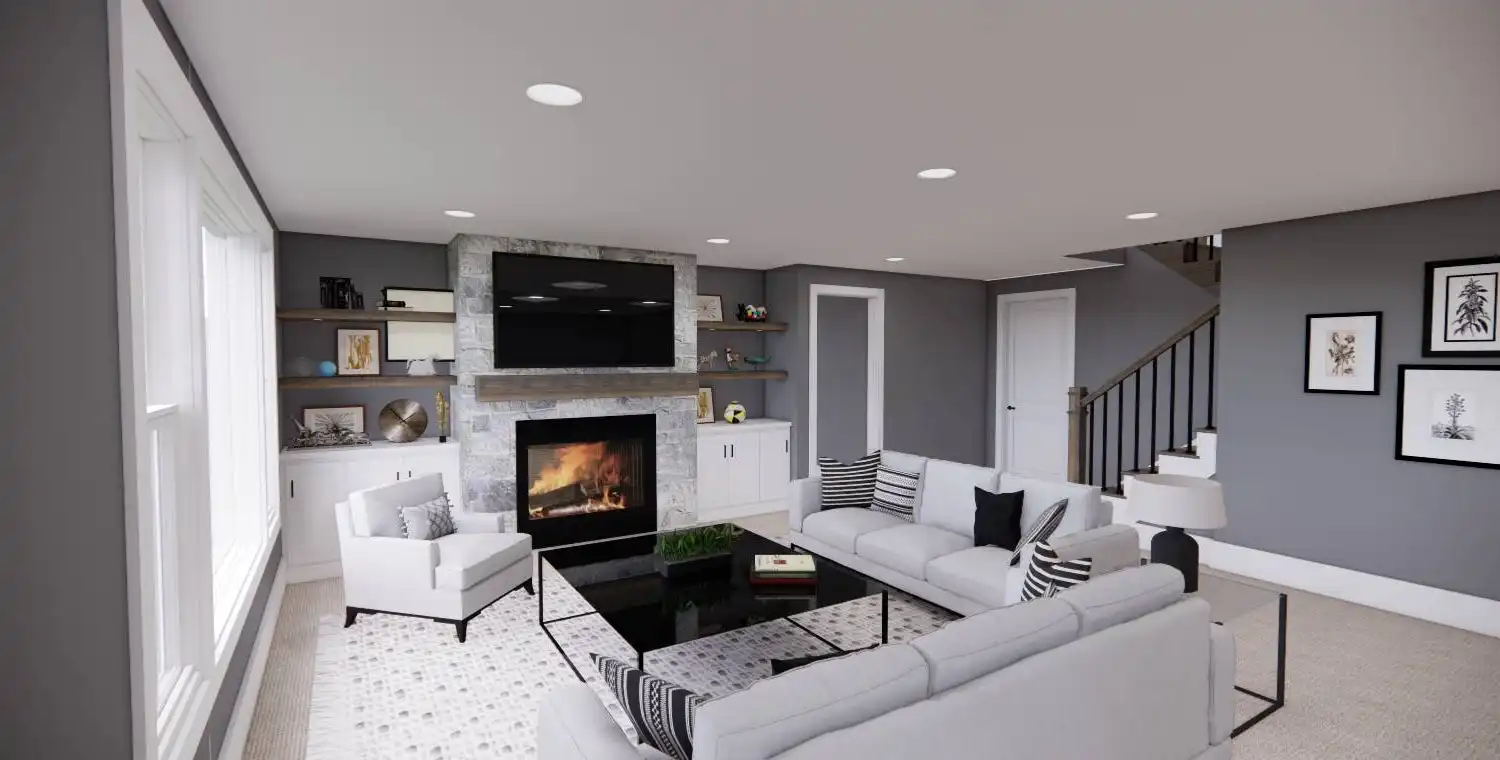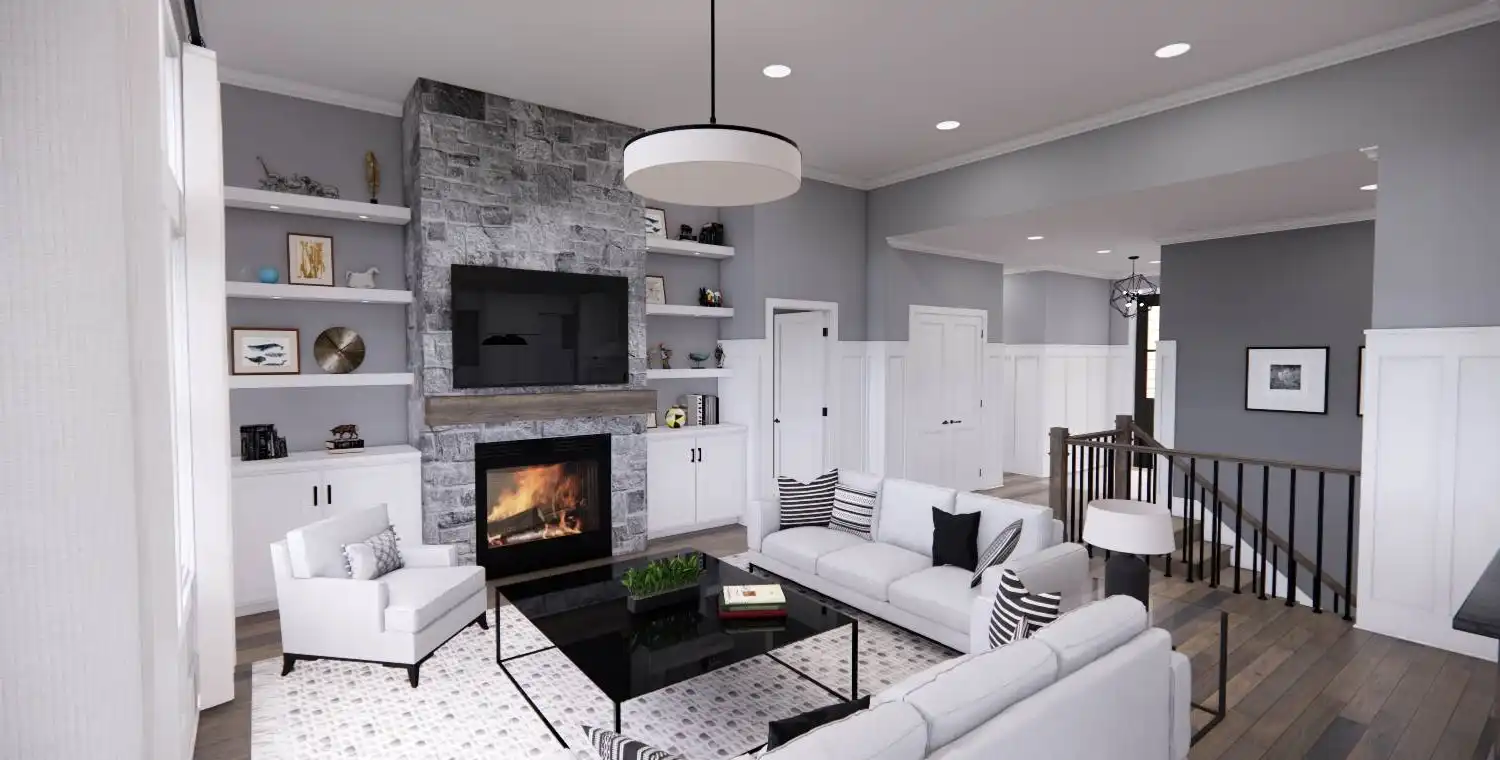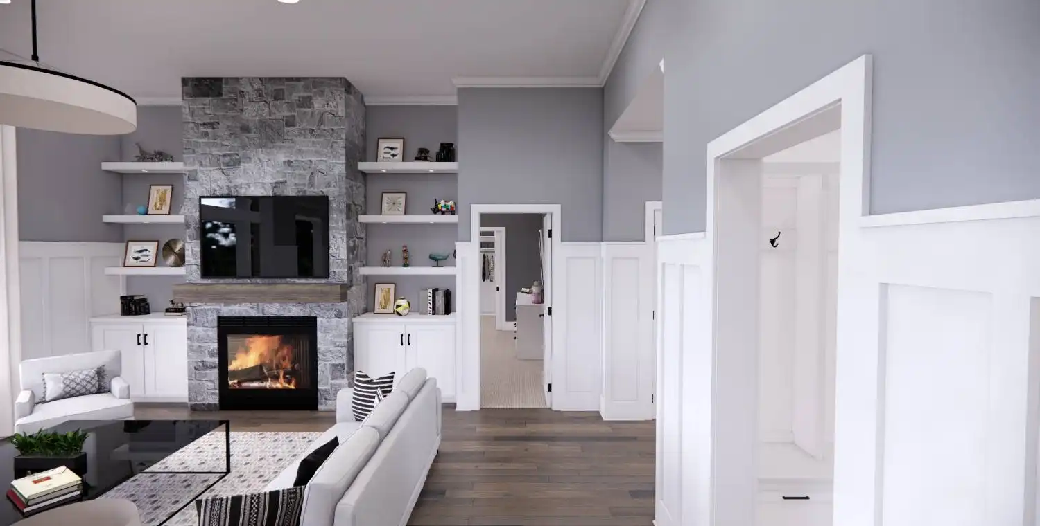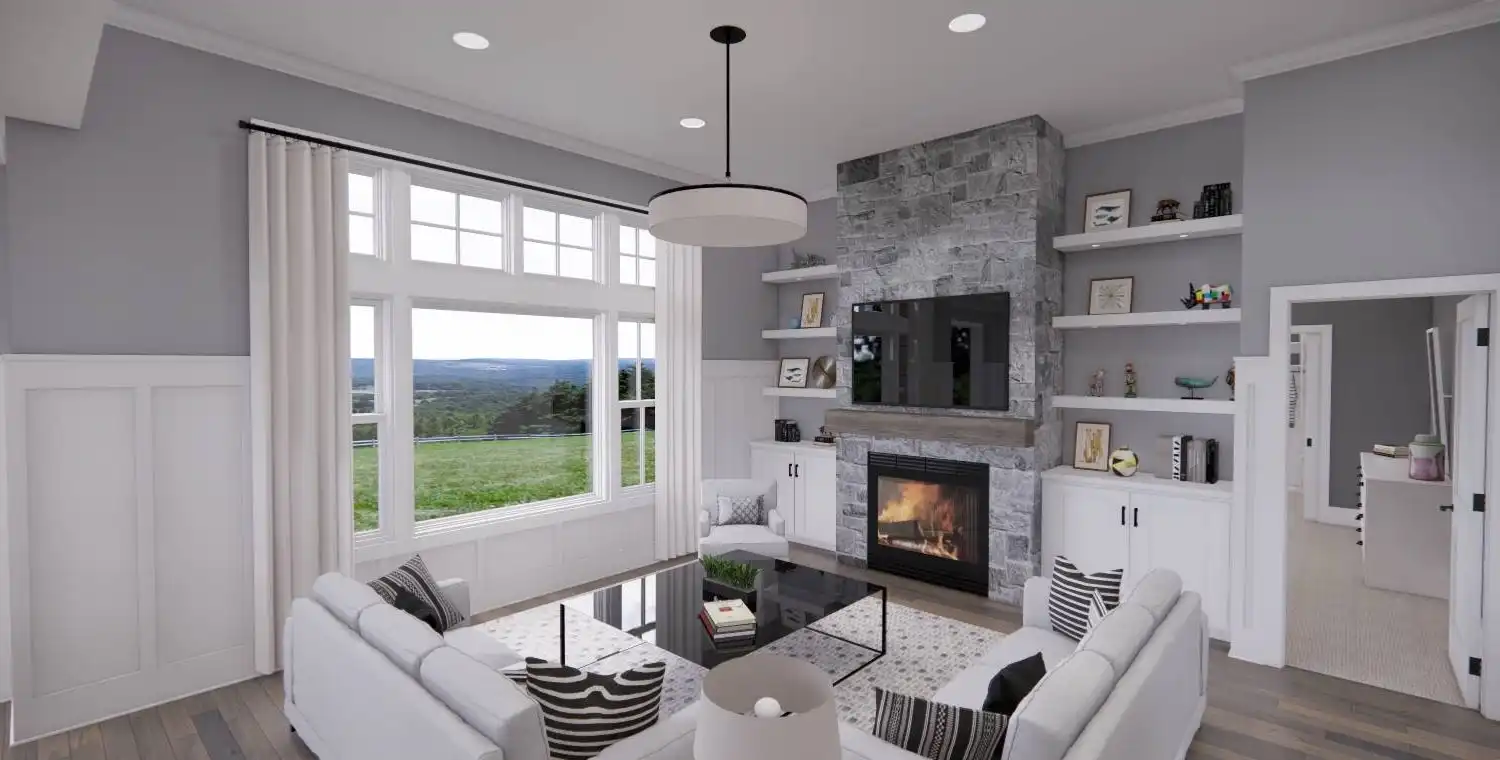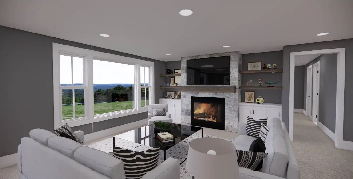 House Plan 11022 delivers 1,762 square feet of Traditional charm, offering 3 bedrooms, 2 bathrooms, and a 2-car garage in a family-friendly design perfect for modest lots. From the covered porch, step into a formal entryway that opens to a bright and airy living space with vaulted ceilings, a picture window, and a fireplace surrounded by built-ins. The kitchen features an oversized island with bar seating, plentiful storage, and sliding door access to the backyard from the adjacent dining area. A barn-doored office, mudroom, and dedicated laundry add convenience, while the private primary suite includes a serene bedroom with reading nook potential, a walk-in closet, and a well-appointed bath with step-in shower and linen storage. Expand your living space with the optional 1,027-square-foot basement featuring two bedrooms, a bath, storage areas, and a family/game room with built-ins and a fireplace—ideal for entertaining or multi-generational living.