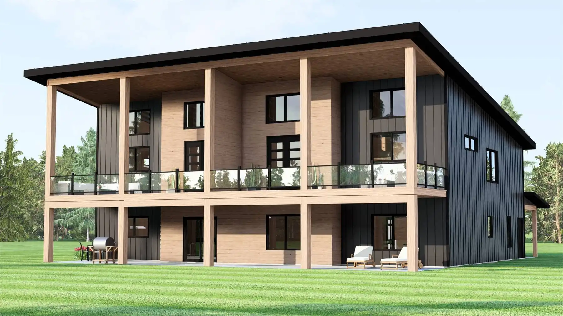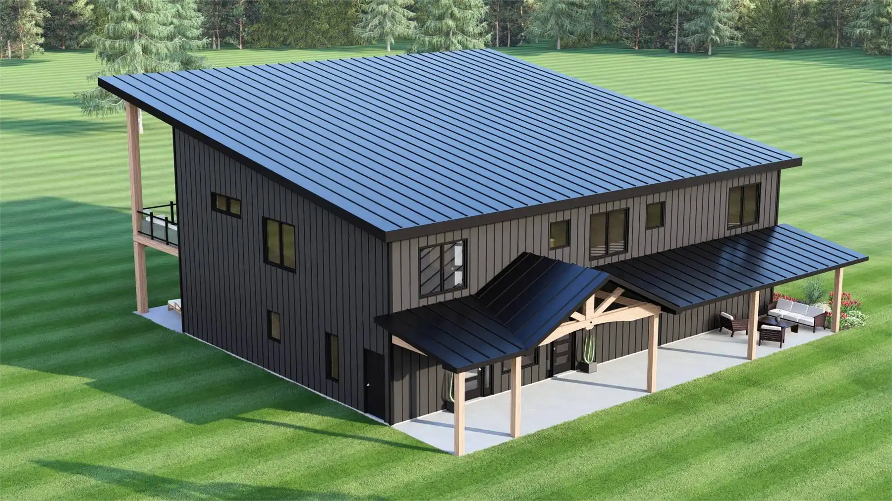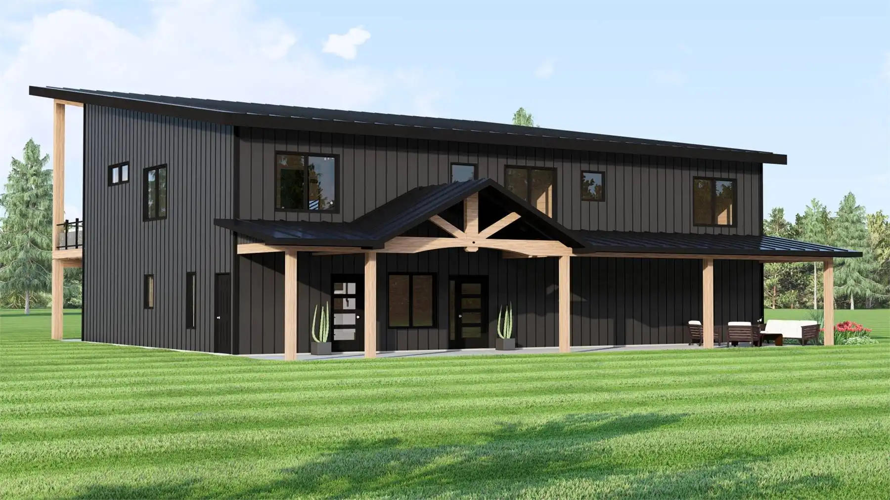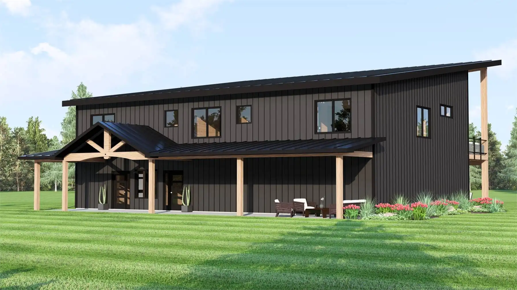 House Plan 11062 is a 4,892 square foot two-story home where modern meets Barndominium charm. Offering 6 bedrooms and 5.5 bathrooms, this design is tailored for multi-generational families. A dramatic cathedral ceiling welcomes you onto the expansive front covered porch, while the interior opens to a layout built for flexibility. On the main floor, the right wing features a complete in-law suite with a private living room, L-shaped kitchen with island seating, and a rear bedroom with ensuite bath. The remainder of the main level includes a theatre room (or optional office), a spacious U-shaped kitchen with walk-in pantry and central island, a flex room, and a great room that extends to a large rear covered patio for outdoor entertaining. Upstairs, the design is split into two mirrored wings—each with its own primary suite featuring a luxury ensuite bath and covered deck access. Two additional bedrooms and a shared bath on each side, along with laundry, complete the upper floor. This home is a perfect solution for families seeking independence and togetherness in one stylish plan.