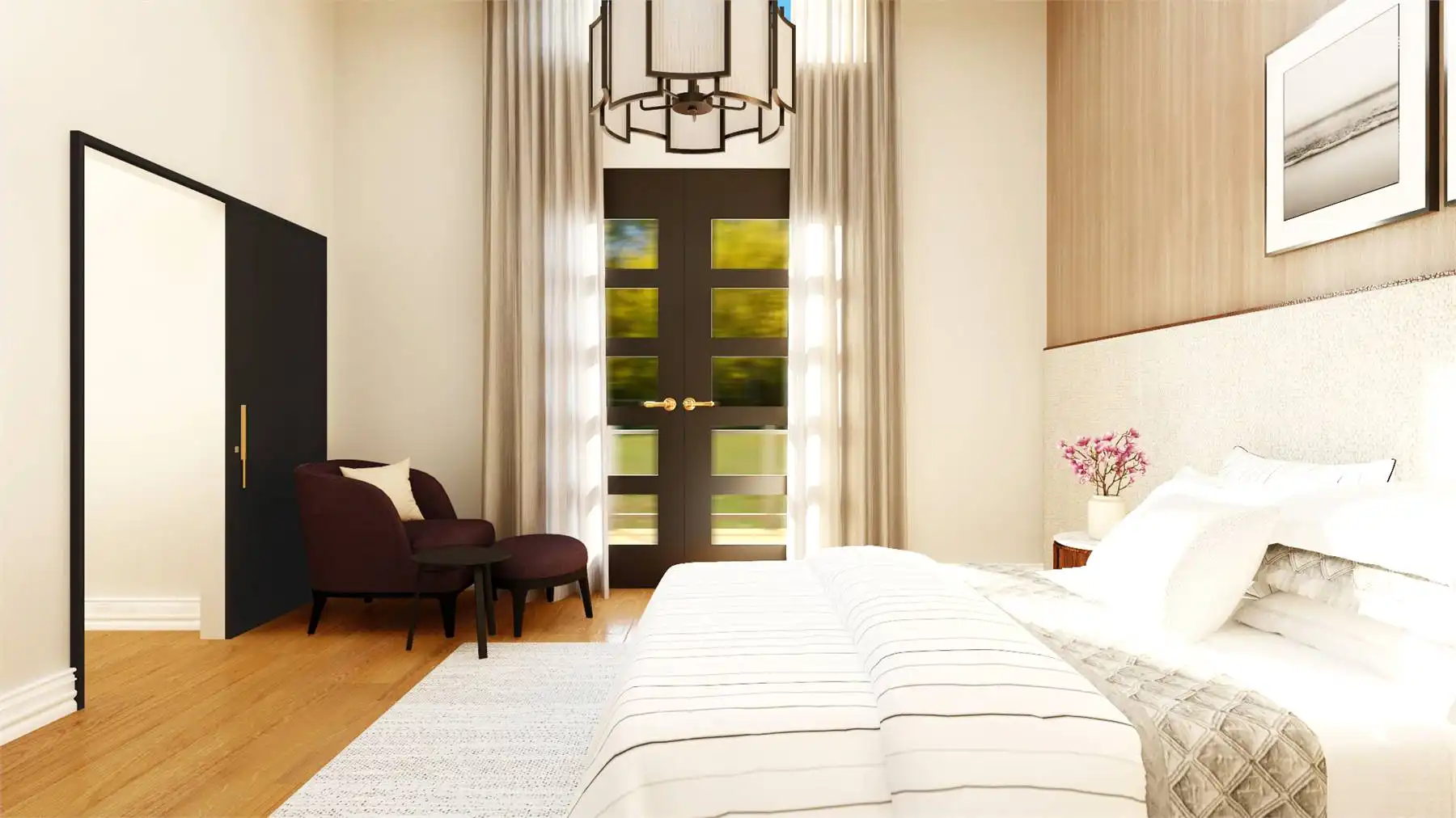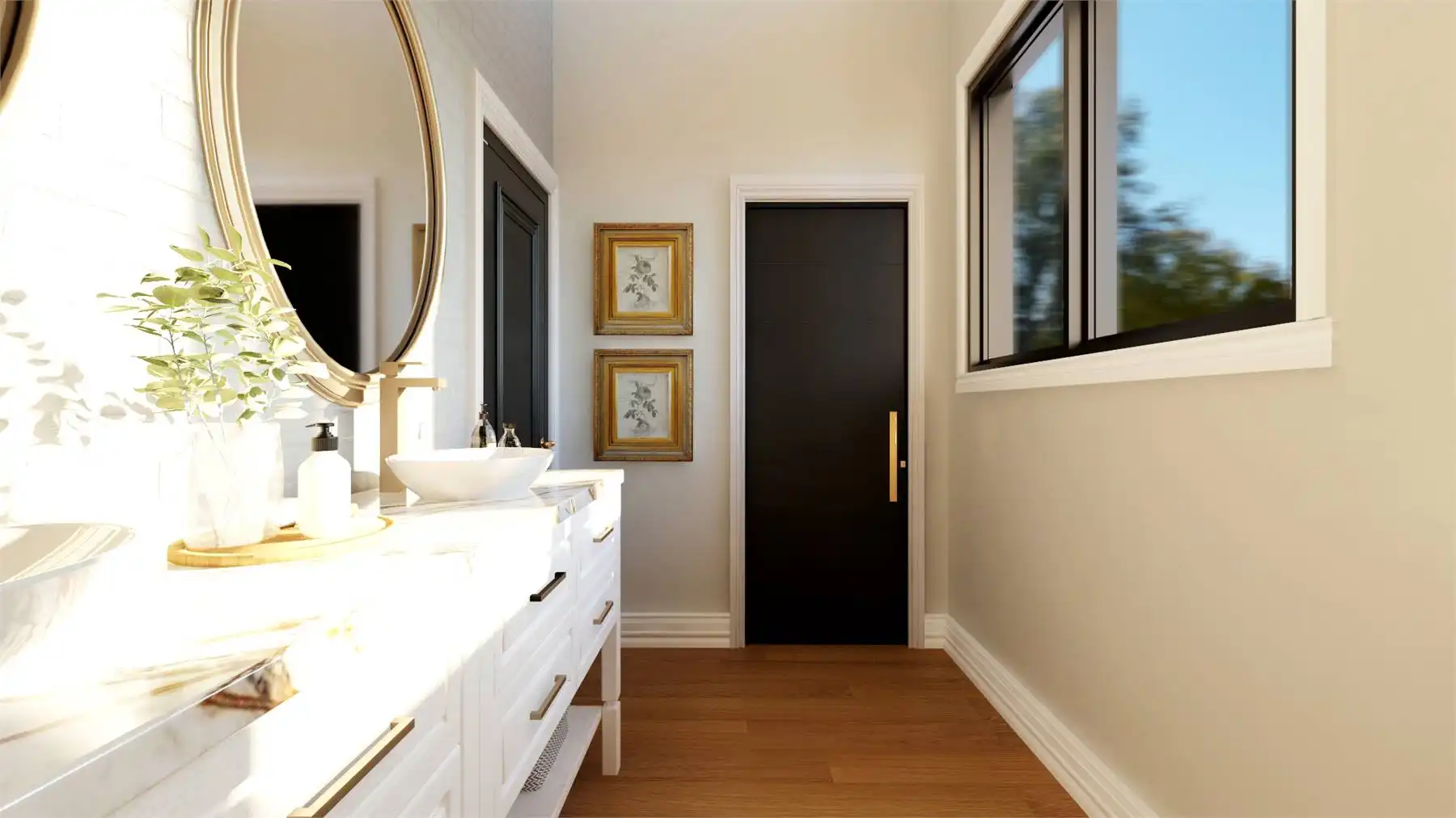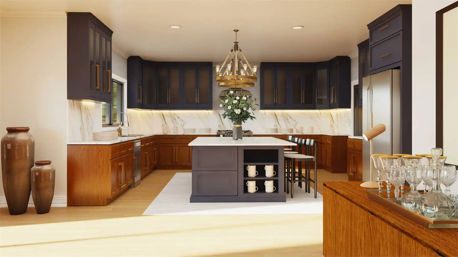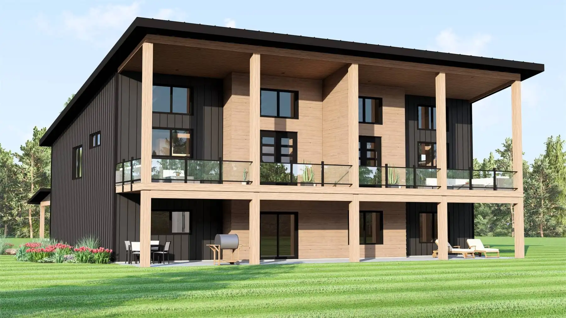 House Plan 11062 is a 4,892 square foot two-story home where modern meets Barndominium charm. Offering 6 bedrooms and 5.5 bathrooms, this design is tailored for multi-generational families. A dramatic cathedral ceiling welcomes you onto the expansive front covered porch, while the interior opens to a layout built for flexibility. On the main floor, the right wing features a complete in-law suite with a private living room, L-shaped kitchen with island seating, and a rear bedroom with ensuite bath. The remainder of the main level includes a theatre room (or optional office), a spacious U-shaped kitchen with walk-in pantry and central island, a flex room, and a great room that extends to a large rear covered patio for outdoor entertaining. Upstairs, the design is split into two mirrored wings—each with its own primary suite featuring a luxury ensuite bath and covered deck access. Two additional bedrooms and a shared bath on each side, along with laundry, complete the upper floor. This home is a perfect solution for families seeking independence and togetherness in one stylish plan.