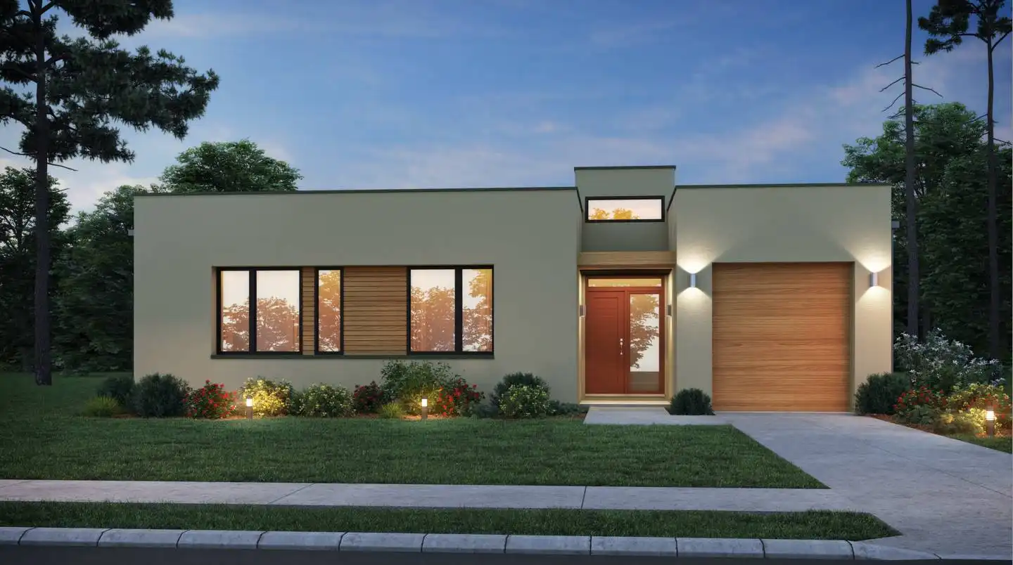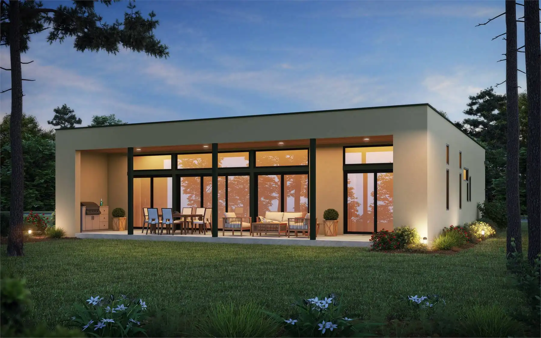 House Plan 1107 offers 1,944 square feet, three bedrooms, and three-and-a-half bathrooms in a chic modern Southwestern package. The classic ranch layout places the one-car garage in front, all the bedrooms grouped in one hallway, and the open-concept living in back. The master suite has a four-piece bath while the other two bedrooms have their own private three-piece baths. The common areas spread from the island kitchen to the fireplace, all beside a wall of glass and a rear porch ideal for views. The layout also includes a pocket office ideal for the at-home worker or homework!