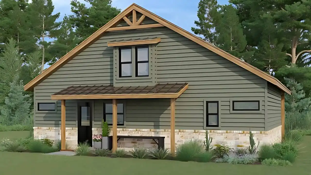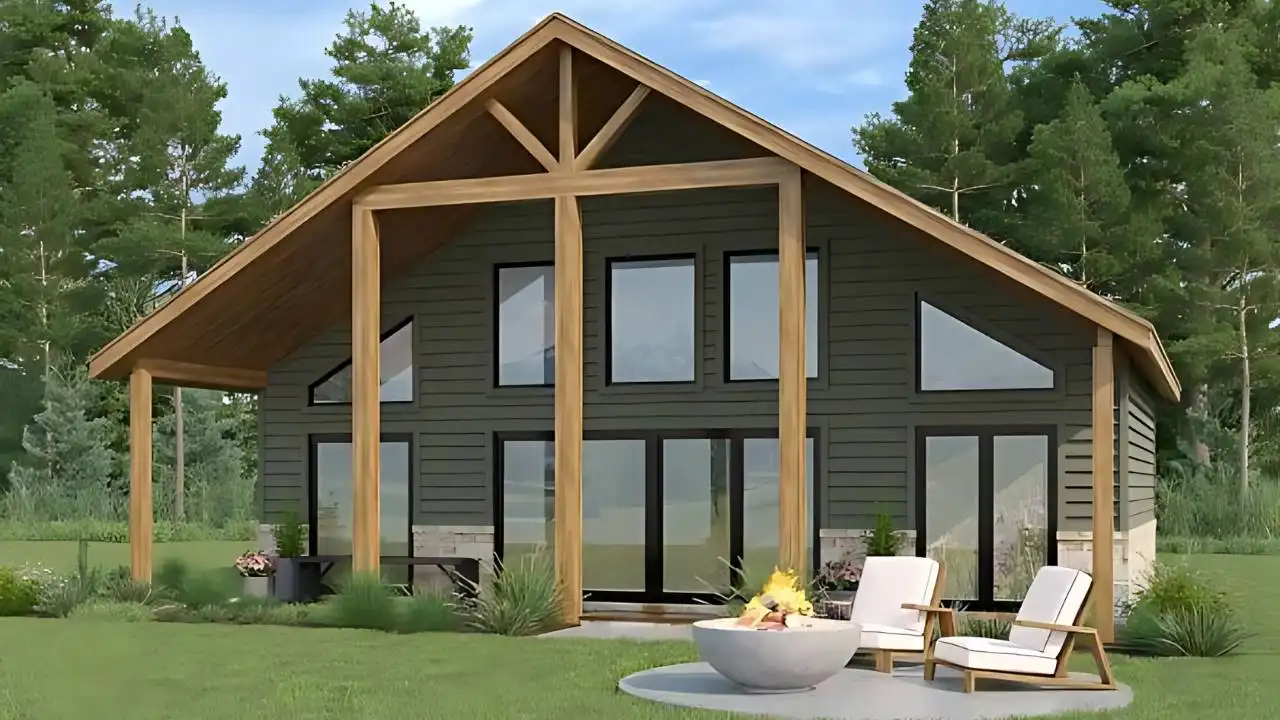 House Plan 11070 is a striking modern A-Frame cabin spanning 1,363 sq ft with an open-plan layout that maximizes natural light and space. Anchored by a 42-foot vaulted covered porch, this design invites outdoor relaxation and entertaining. Inside, the soaring 18-plus-foot ceiling and expansive great-room windows create a bright, airy atmosphere. The two main-floor bedrooms each include their own baths, offering comfortable and convenient living. A 210 sq ft loft above adds functional flexibility—ideal as an office, guest suite, or lounge. Sleek yet warm, this plan blends minimalist modern elegance with cozy cabin charm.