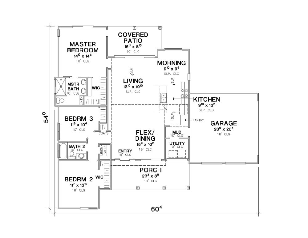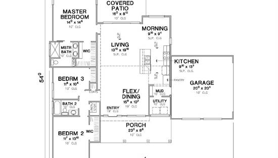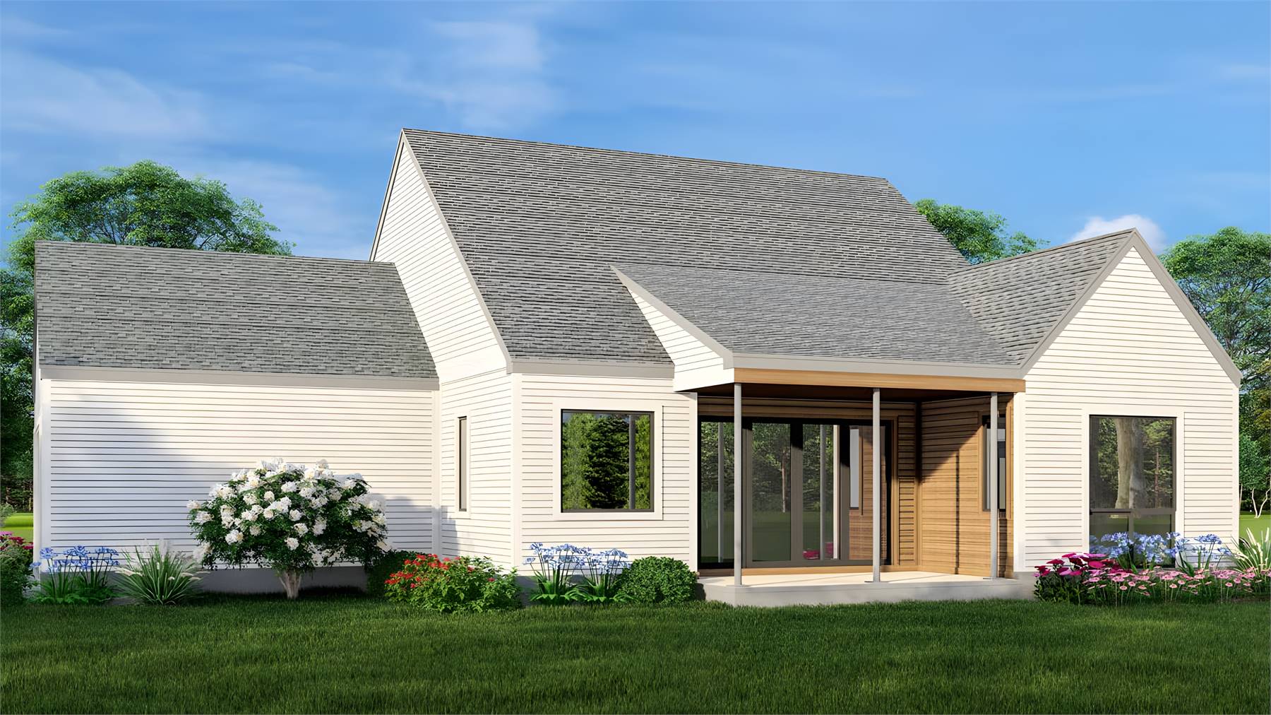 Make sure to look at the floor plan carefully, because House Plan 11077 definitely packs a design punch you might not expect! It offers 1,568 square feet with three bedrooms and two bathrooms in addition to a totally open-concept great room. There's a 19' ceiling over the entry and flex/dining area in front while the ceiling vaults over the kitchen, living area, and nook in back. Talk about impact! On one side of this, you'll find two bedrooms and a hall bath in the front hallway while the four-piece primary suite is in back. On the other side, the mudroom connects to the laundry and the two-car side-entry garage.