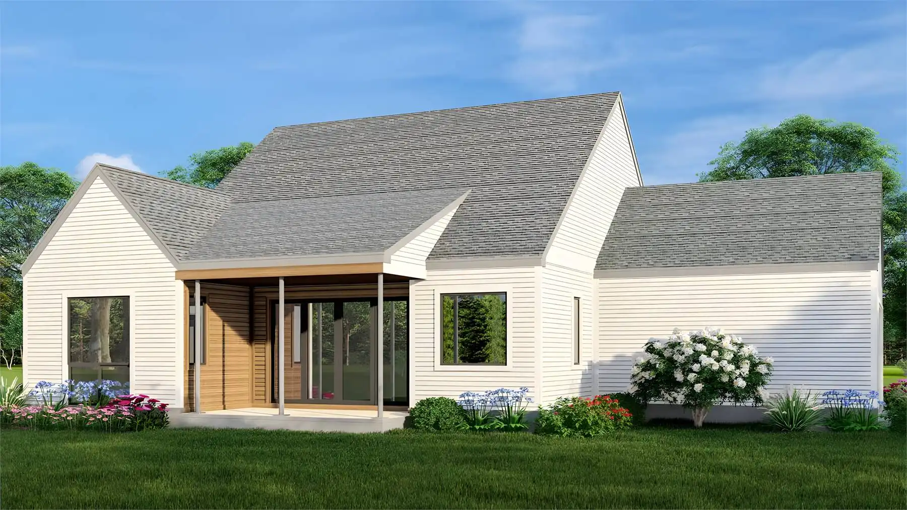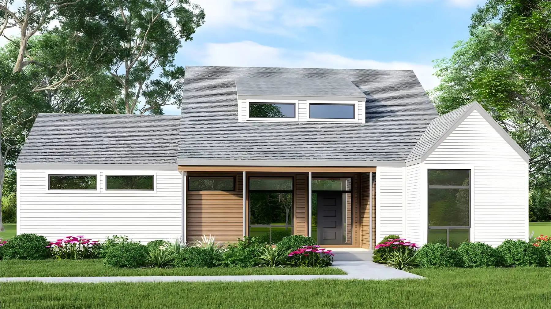 Make sure to look at the floor plan carefully, because House Plan 11077 definitely packs a design punch you might not expect! It offers 1,568 square feet with three bedrooms and two bathrooms in addition to a totally open-concept great room. There's a 19' ceiling over the entry and flex/dining area in front while the ceiling vaults over the kitchen, living area, and nook in back. Talk about impact! On one side of this, you'll find two bedrooms and a hall bath in the front hallway while the four-piece primary suite is in back. On the other side, the mudroom connects to the laundry and the two-car side-entry garage.
