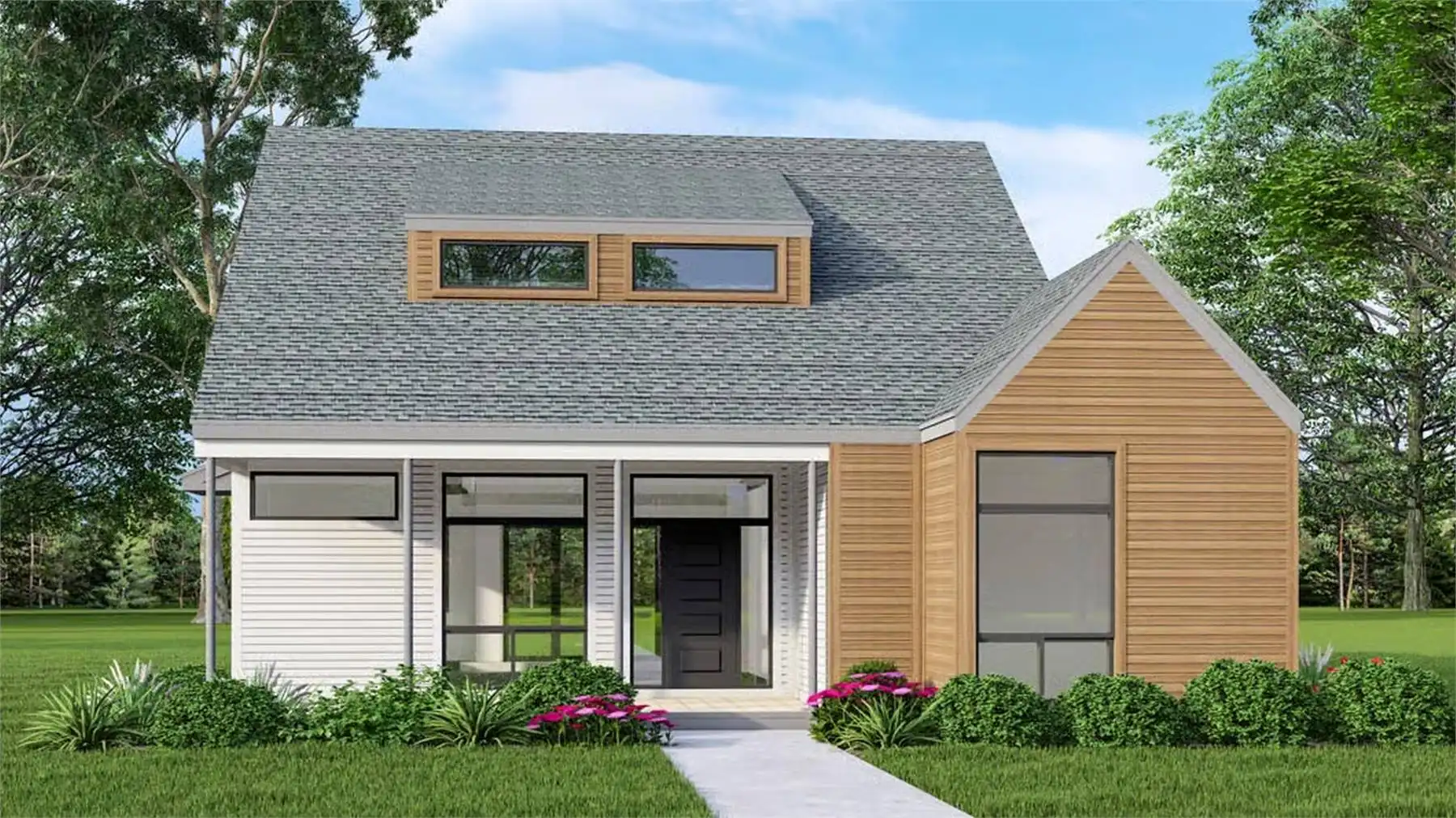 House Plan 11078 is a striking contemporary cottage with a great room like you won't believe! This home offers a modest 1,568 square feet with three bedrooms and two bathrooms on one side while the expansive great room spreads out on the other. It's bright, open, and spacious with no partitions between the island kitchen and the other areas and a soaring 19' ceiling in front that vaults down toward the back. What a unique feature to find in a home of this size!