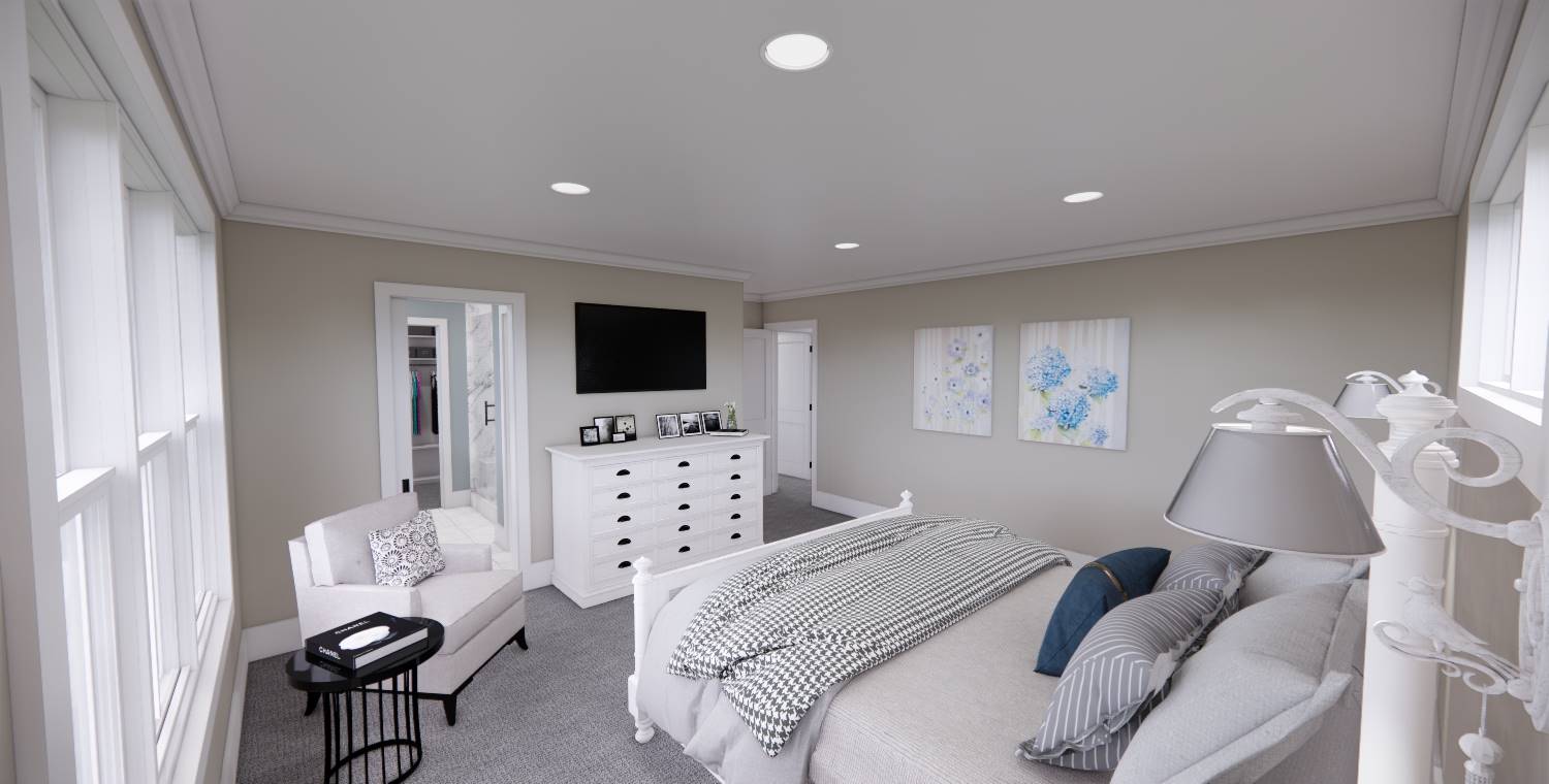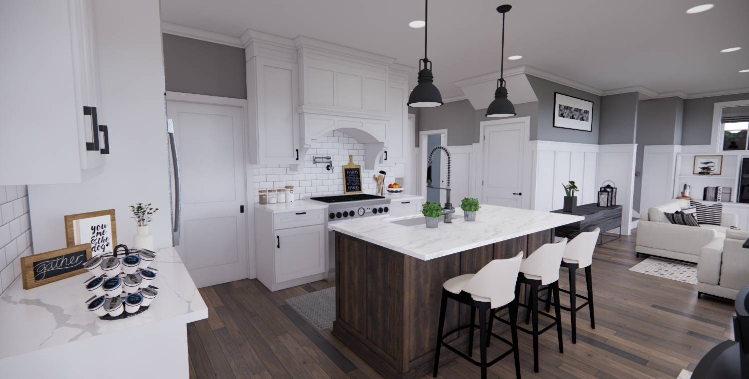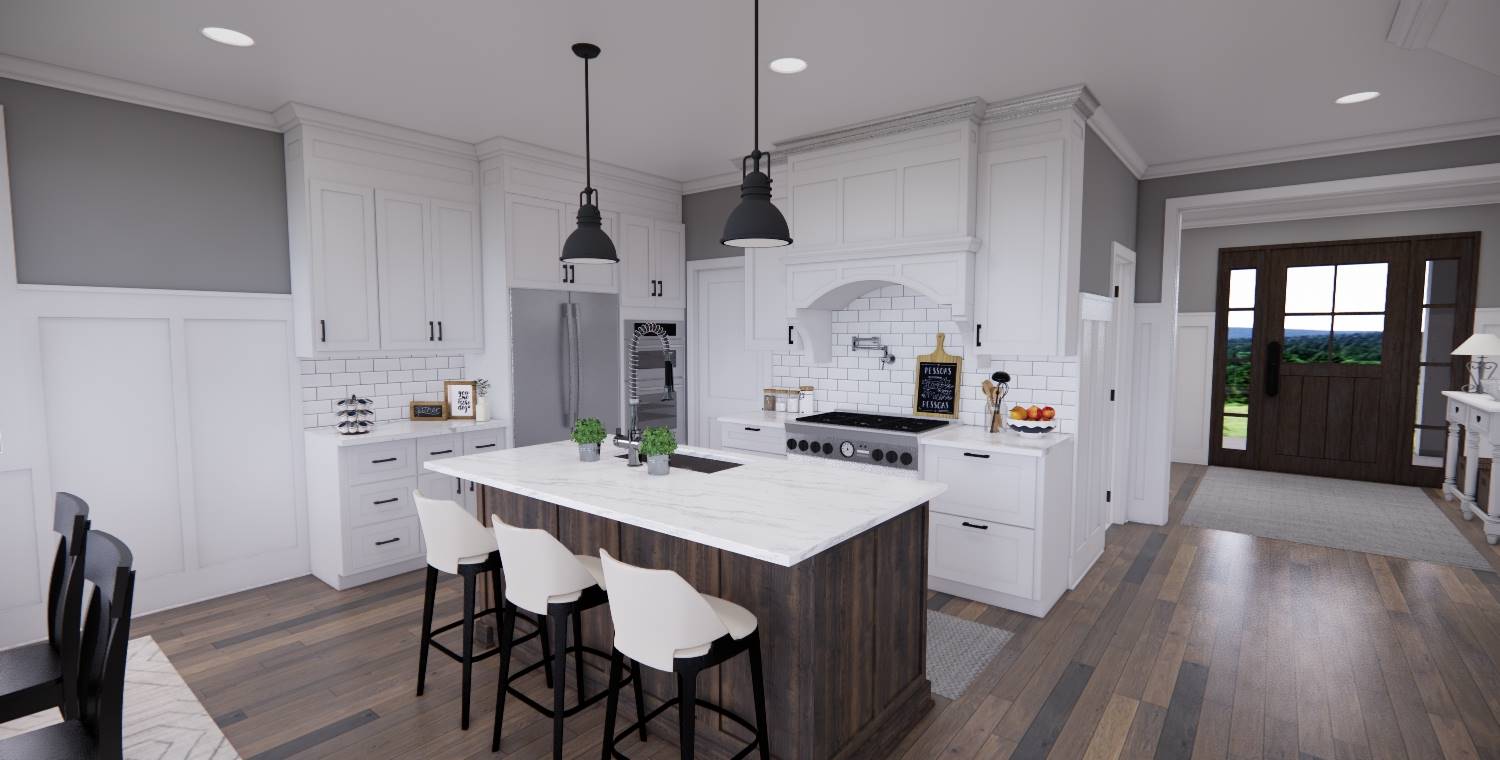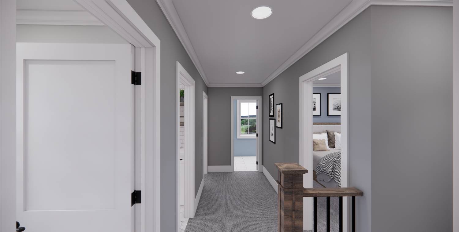 This 2,172 square foot, two-story Traditional design combines timeless curb appeal with a functional family layout, offering 4 bedrooms, 2½ bathrooms, and a 2-car garage. Inside, the first floor showcases an open living space with the kitchen, dining area, and great room flowing together, enhanced by abundant windows. The kitchen features a generous island with seating for three, built-in sink, dishwasher, ample cabinetry, and a walk-in pantry with pocket door. The dining area is perfectly placed for mealtime convenience, and the great room offers a wall of built-ins for both style and storage. Off the foyer, a barn-door enclosed den provides a cozy escape. The second floor holds the private primary suite at the rear with a large bedroom, dual vanities, step-in shower, private toilet, and walk-in closet. Three more bedrooms, a full bathroom, and an upstairs laundry room add practicality to this beautiful home.