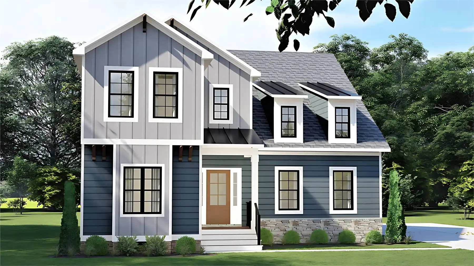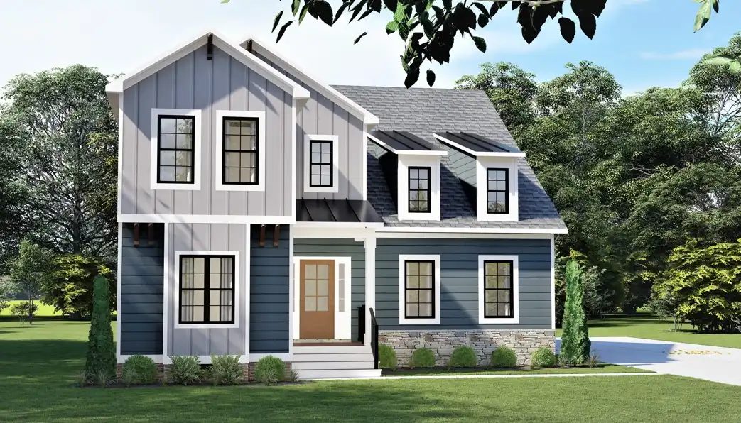 Need a farmhouse for a growing family that spreads up and back rather than out? That's what you'll get with House Plan 11096! This 3,097-square-foot home with four bedrooms and two-and-a-half bathrooms offers a neat narrow shape and bedrooms split on two stories for privacy. The main level includes the open-concept great room with an island kitchen and open dormers in the living area, the five-piece primary suite, the office, the laundry/mudroom, and powder room. Upstairs, three bedrooms that share a divided hall bath are spread across a loft. What a thoughtful home for today's buyers who want design impact and flexibility!