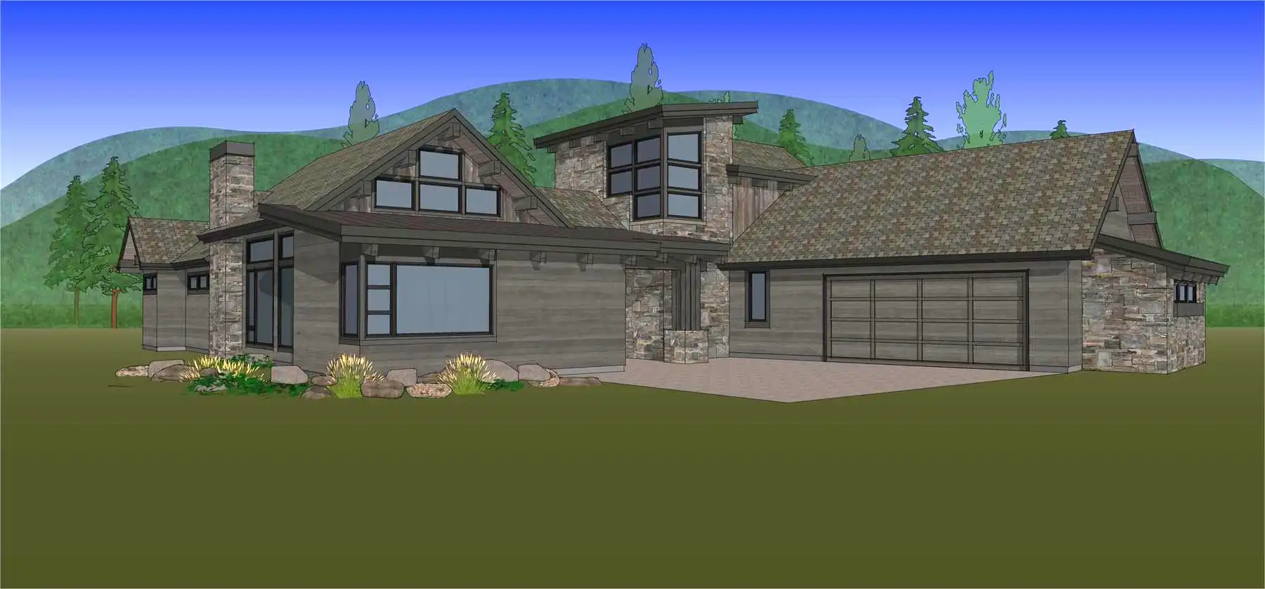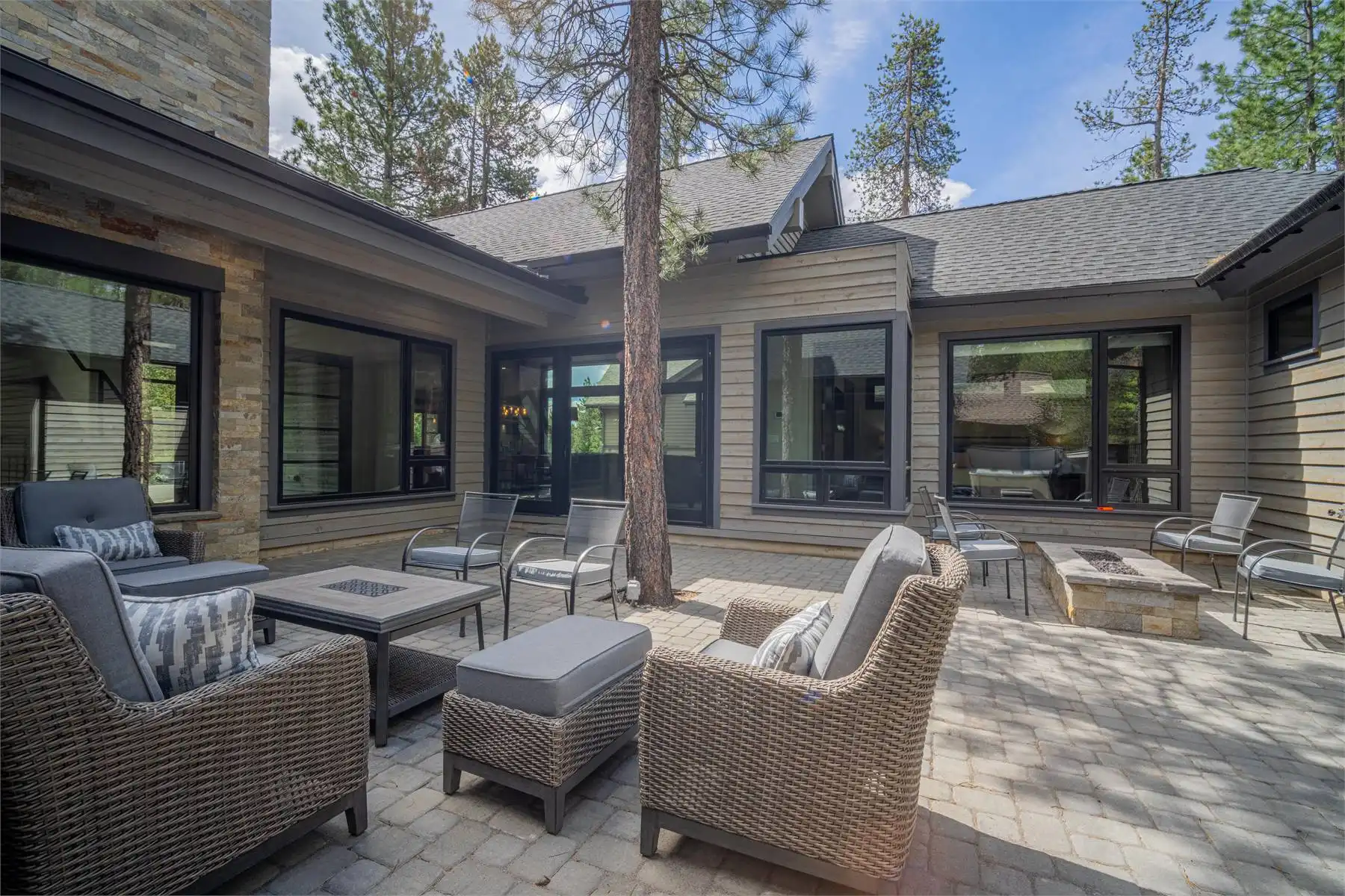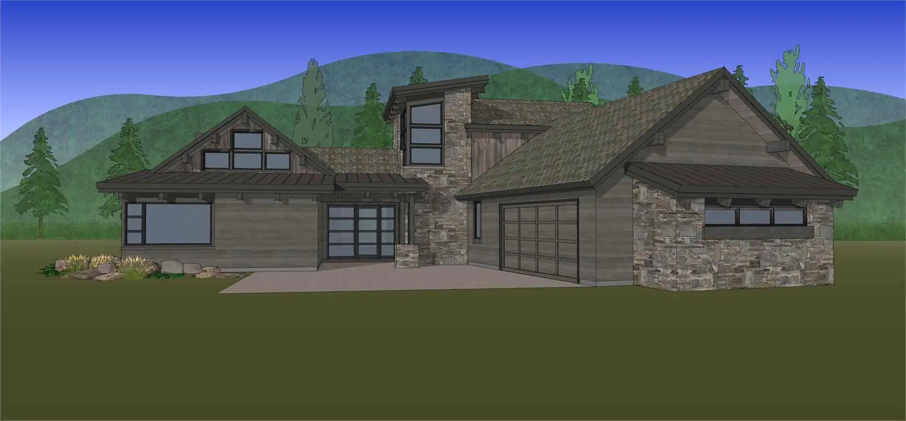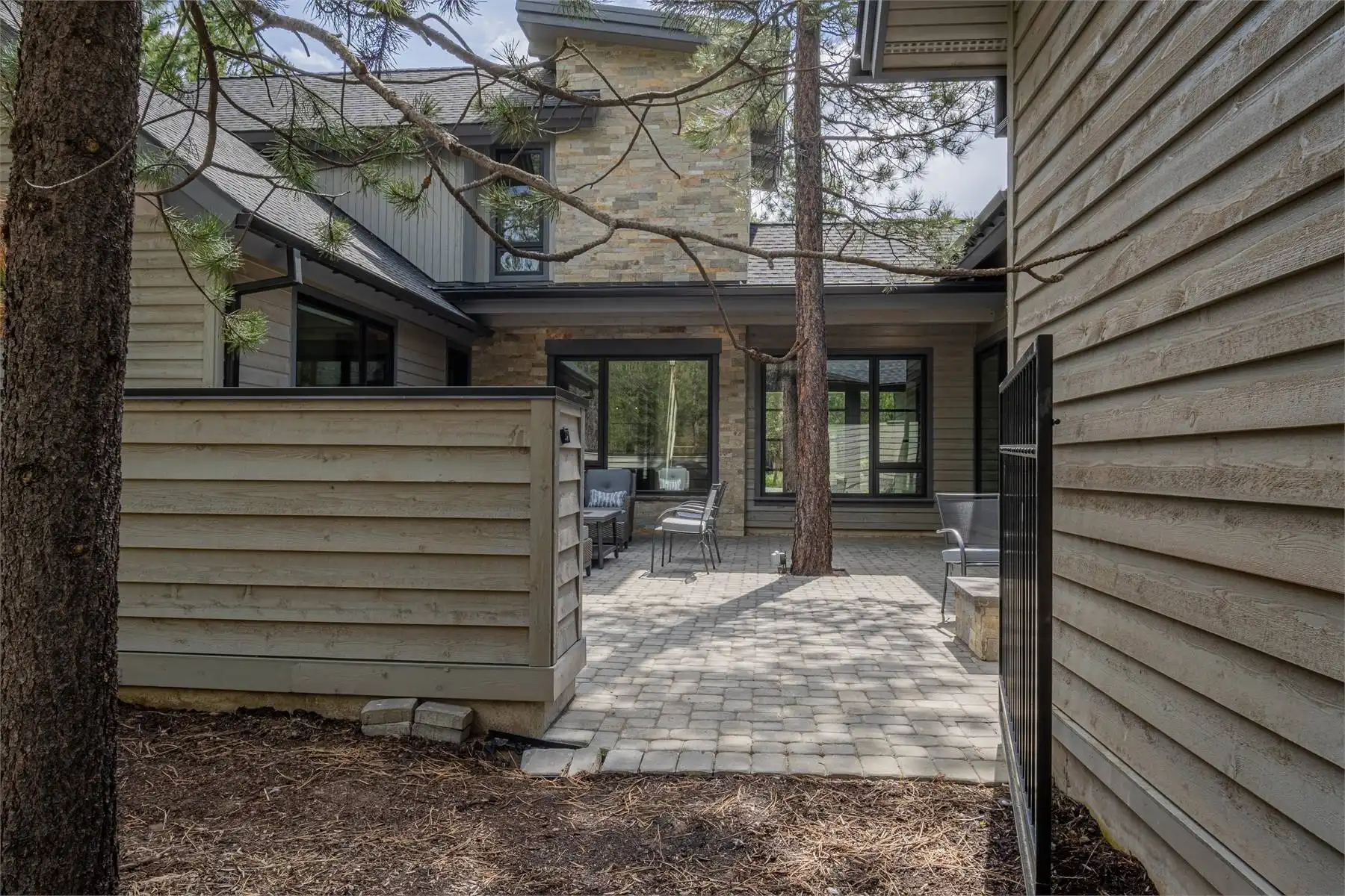 House Plan 11098 is a stunning modern mountain home with 2,979 square feet, four bedrooms, four-and-a-half baths, and a two-car garage. This unique layout places the foyer and the courtyard in the center of the floor plan. The U-shaped kitchen, vaulted great room, and primary suite are located on one side. On the other, you'll find two smaller bedroom suites, the powder room, the mudroom, and the laundry room. The final bedroom and hall bath are privately located upstairs. Make sure to appreciate all the brightening windows this design has to offer!