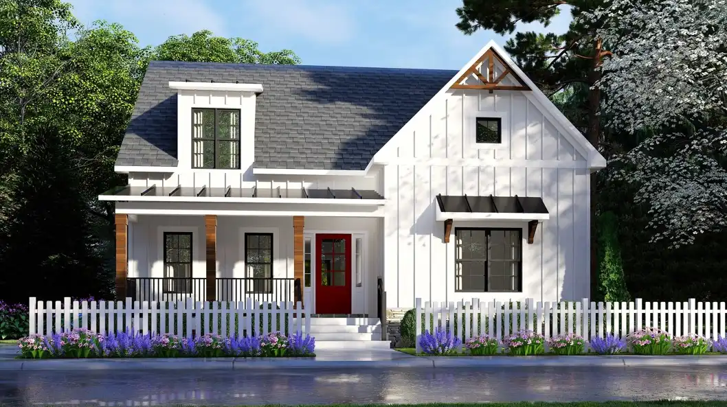 This cottage farmhouse delivers 3 bedrooms, 2.5 bathrooms, and an inviting open floor plan across 2,345 square feet. The kitchen offers an island and walk-in pantry to simplify meal prep and storage. The main-level primary suite features a double vanity plus a separate tub and shower. Upstairs, a flexible loft and home office complement two secondary bedrooms, and laundry on the second floor streamlines routines. Outdoor spaces include a welcoming front porch and a generous rear deck. With its efficient 2-story footprint, this plan fits beautifully on modest lots.