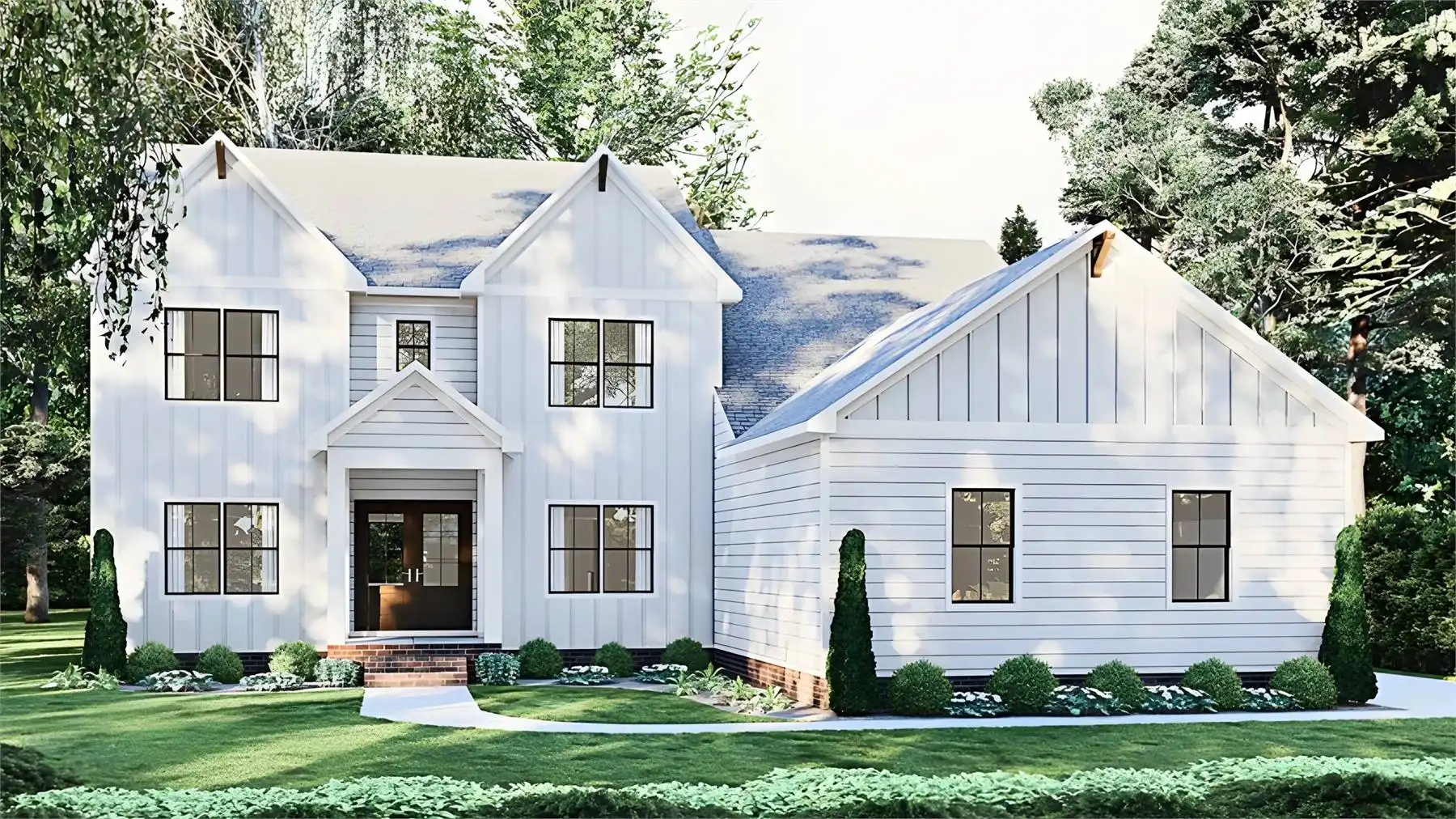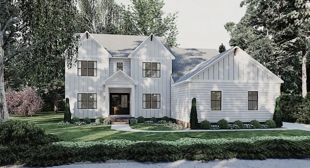 House Plan 11104 is a stunning farmhouse design with 3,644 square feet, four bedrooms, and three-and-a-half baths across two stories. The main level is where you'll find the common spaces including the two-story great room, island kitchen, breakfast nook, and flex room. There's also an office, a powder room, the laundry room, and the primary suite, of course. With a large bedroom, a grand five-piece bath, and a walk-in closet, this bedroom is sure to please! The other bedrooms are located upstairs, around the loft that provides additional living space and overlooks the great room. One of these bedrooms is a three-piece suite while the other two share a buddy bath.