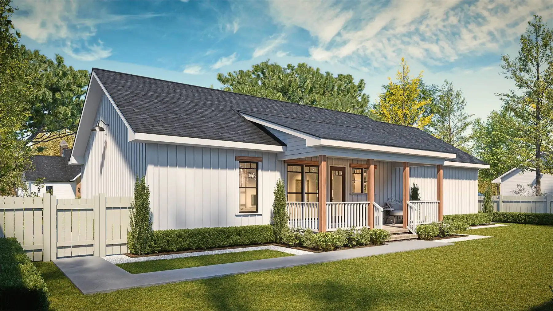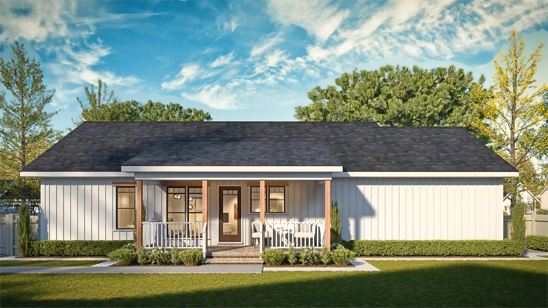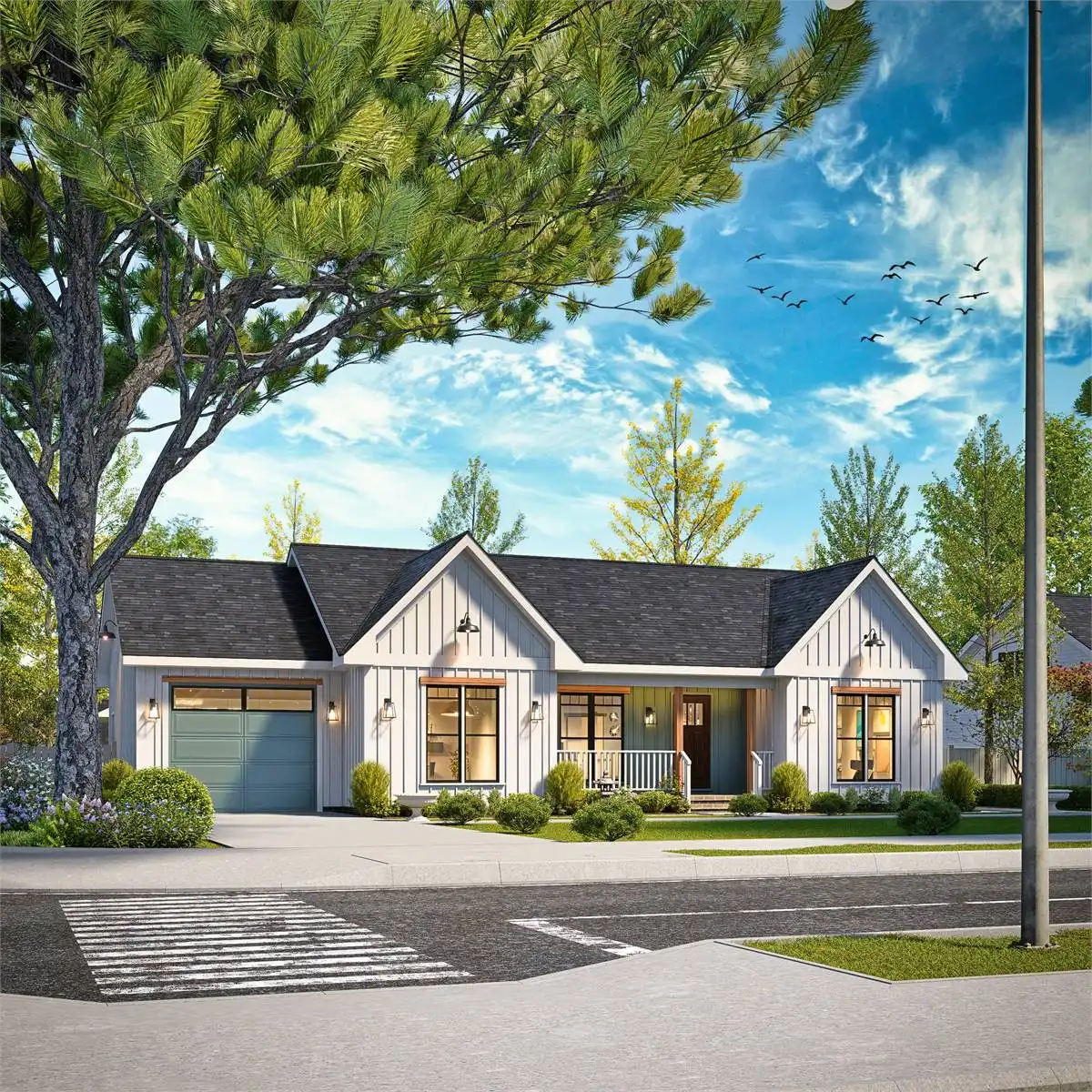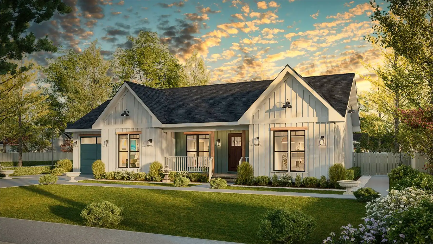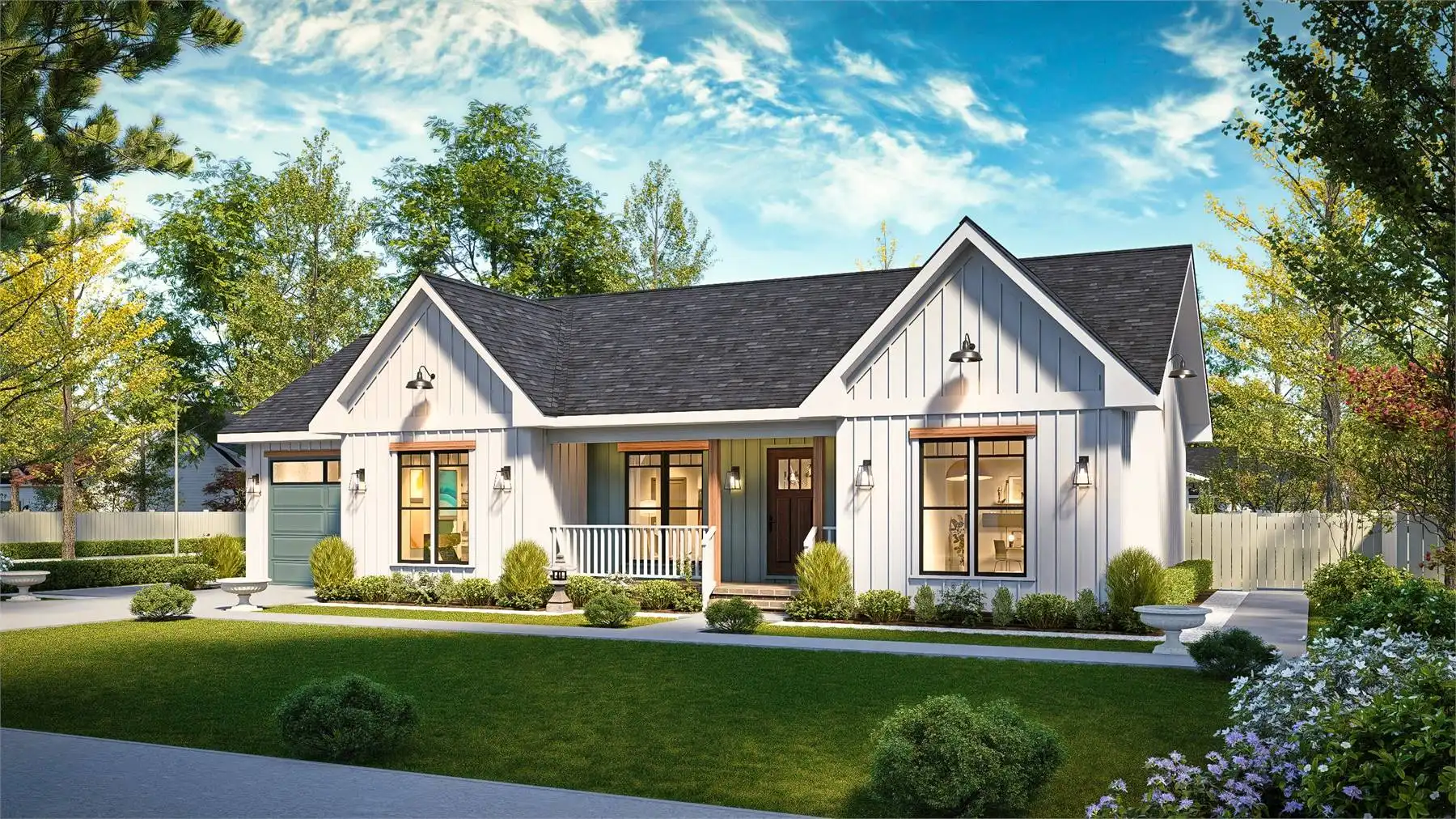House Plan 11111 combines the simplicity of ranch living with modern farmhouse style. A front porch welcomes you into the home, where an open family room anchors the design and connects naturally to the dining area and kitchen. The kitchen features a U-shaped layout with efficient storage and a direct connection to the utility space and garage. The private primary bedroom suite includes closet space and nearby access to a full bath. Two secondary bedrooms with a shared bathroom sit on the opposite side, creating a functional split-bedroom design. With porches in both the front and rear, this home makes outdoor enjoyment part of everyday living. Compact yet versatile, House Plan 11111 is an ideal plan for those seeking farmhouse charm in a smart single-level design.