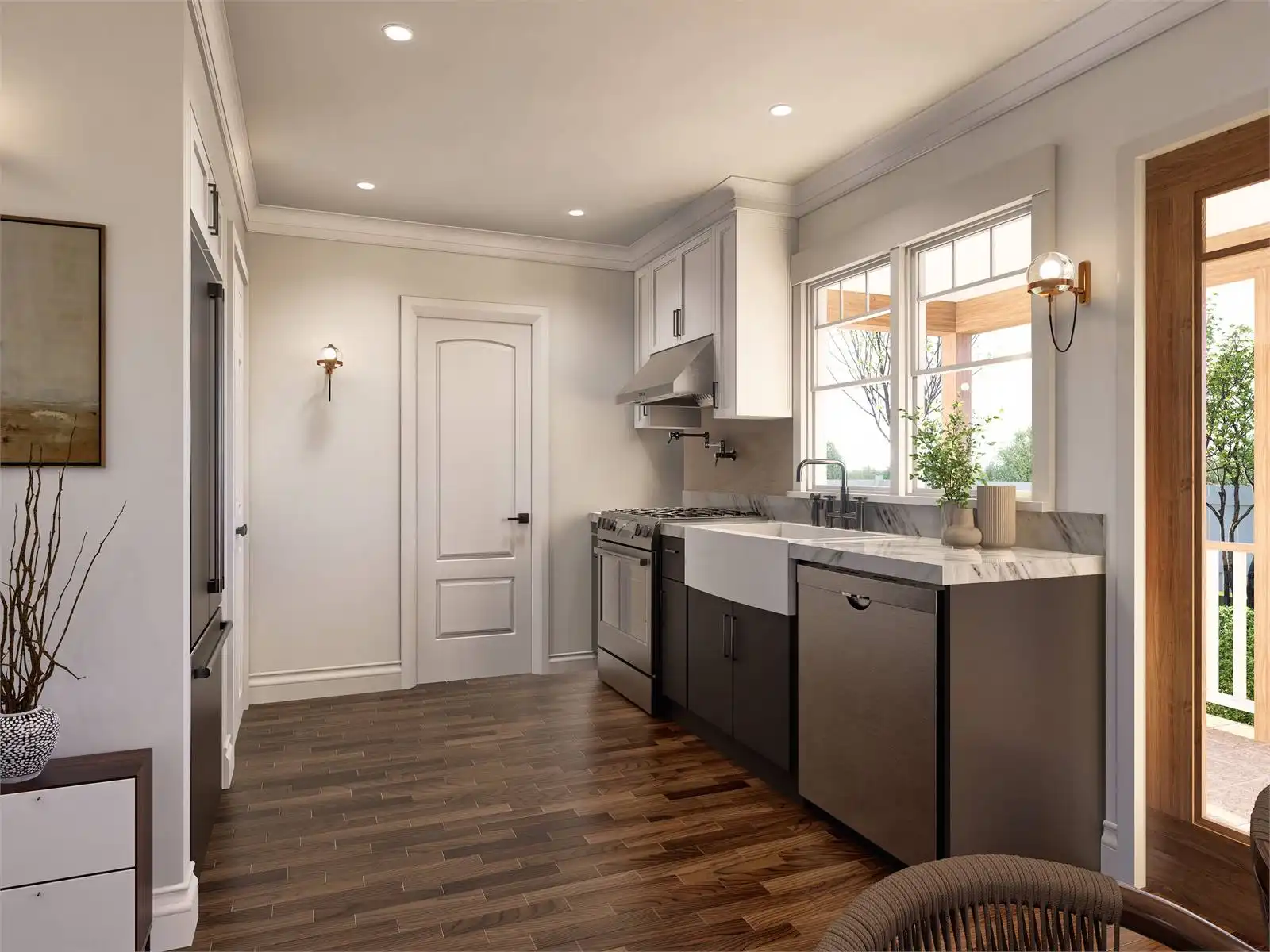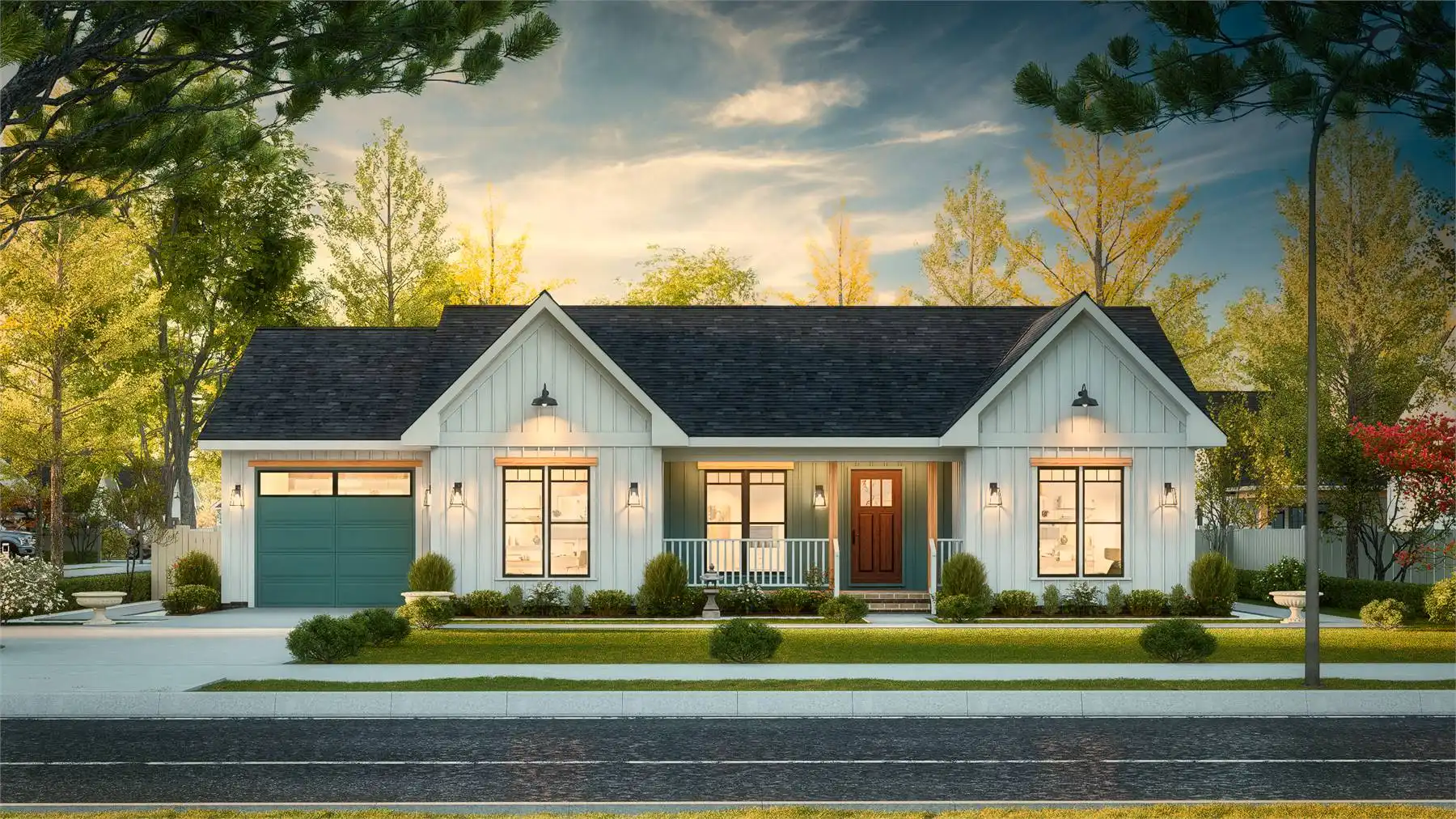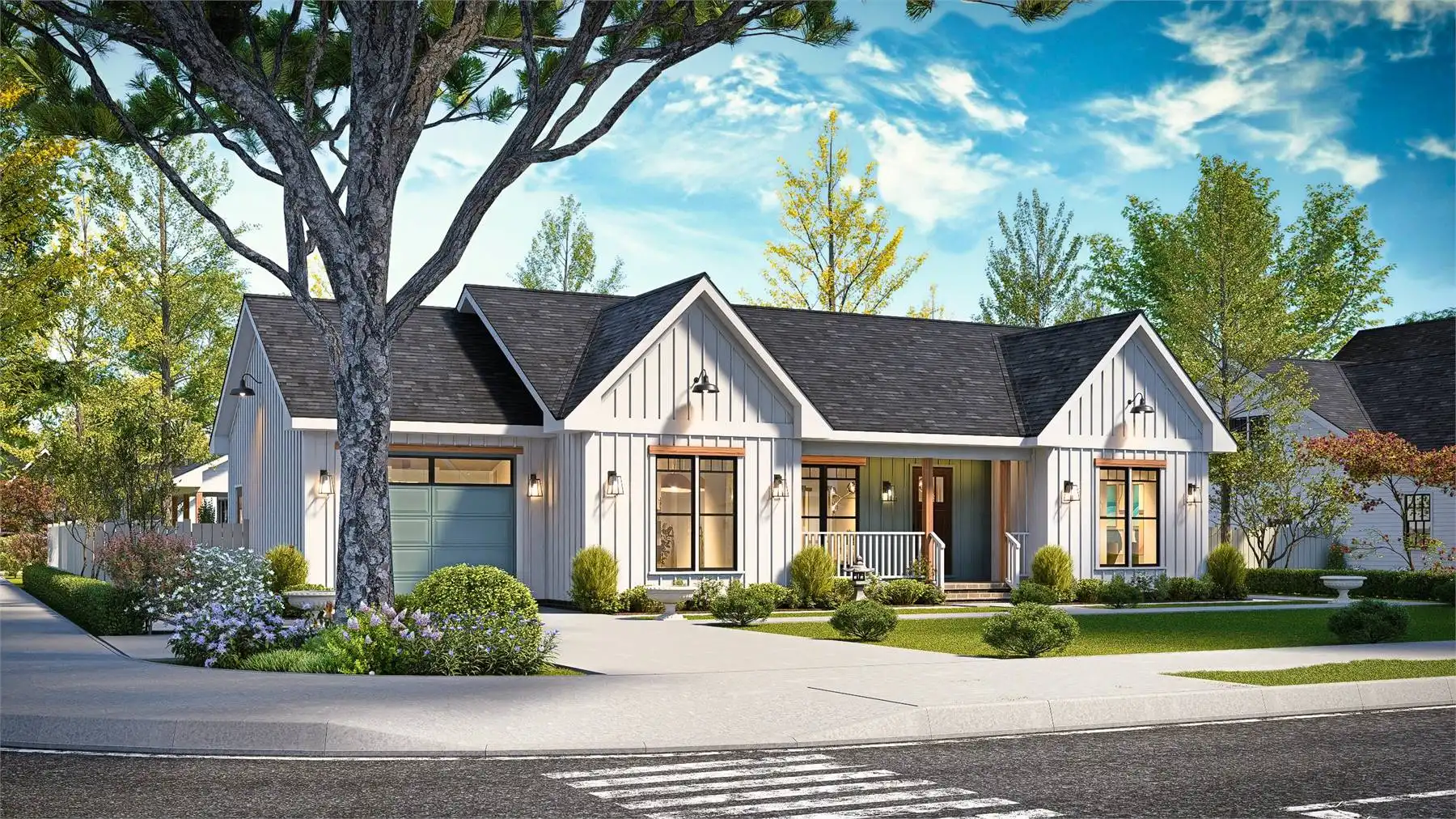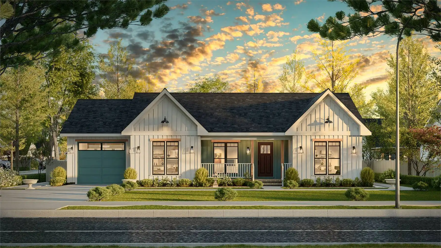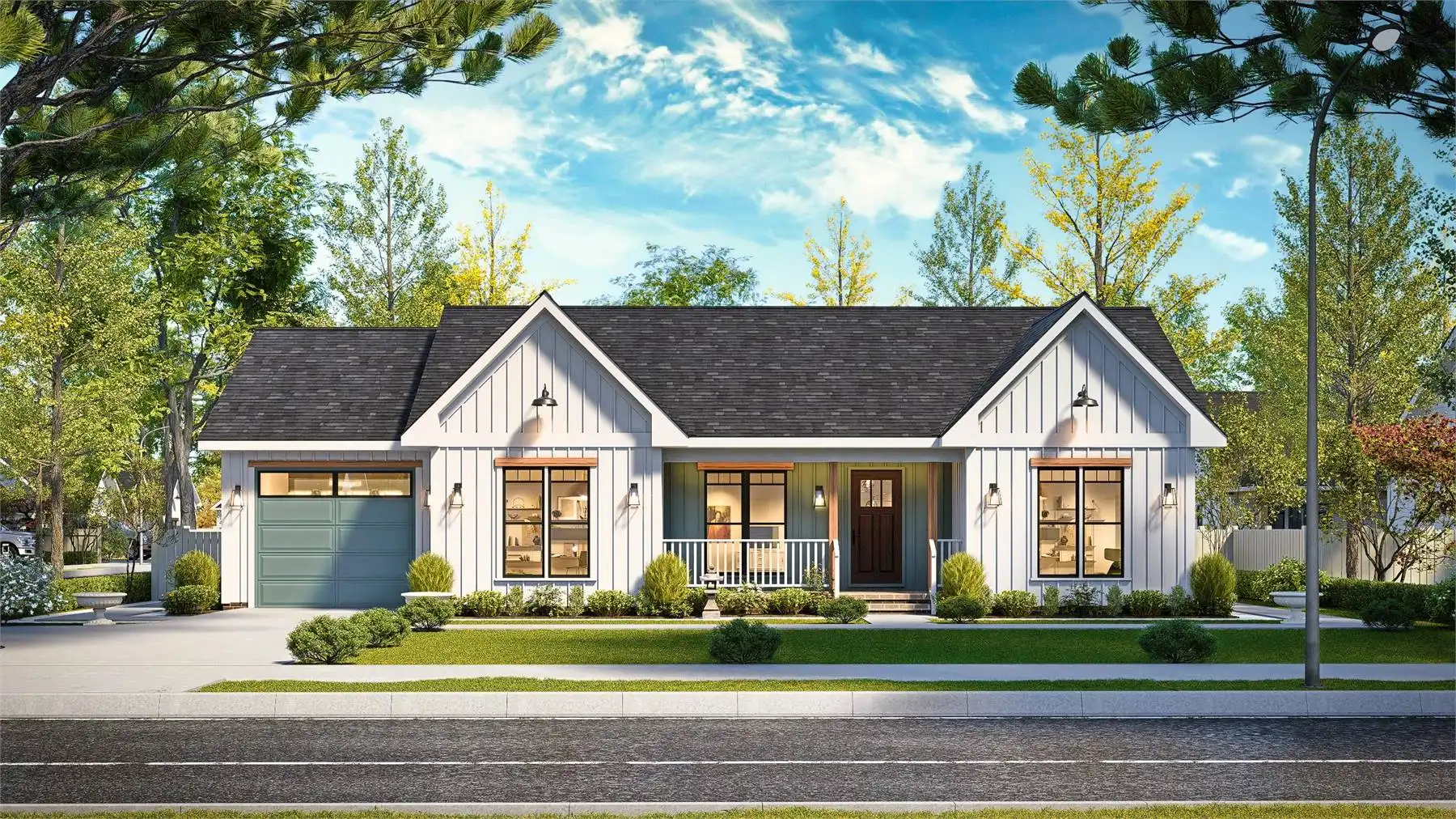 House Plan 11111 combines the simplicity of ranch living with modern farmhouse style. A front porch welcomes you into the home, where an open family room anchors the design and connects naturally to the dining area and kitchen. The kitchen features a U-shaped layout with efficient storage and a direct connection to the utility space and garage. The private primary bedroom suite includes closet space and nearby access to a full bath. Two secondary bedrooms with a shared bathroom sit on the opposite side, creating a functional split-bedroom design. With porches in both the front and rear, this home makes outdoor enjoyment part of everyday living. Compact yet versatile, House Plan 11111 is an ideal plan for those seeking farmhouse charm in a smart single-level design.