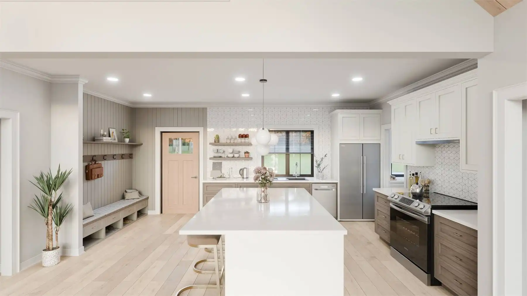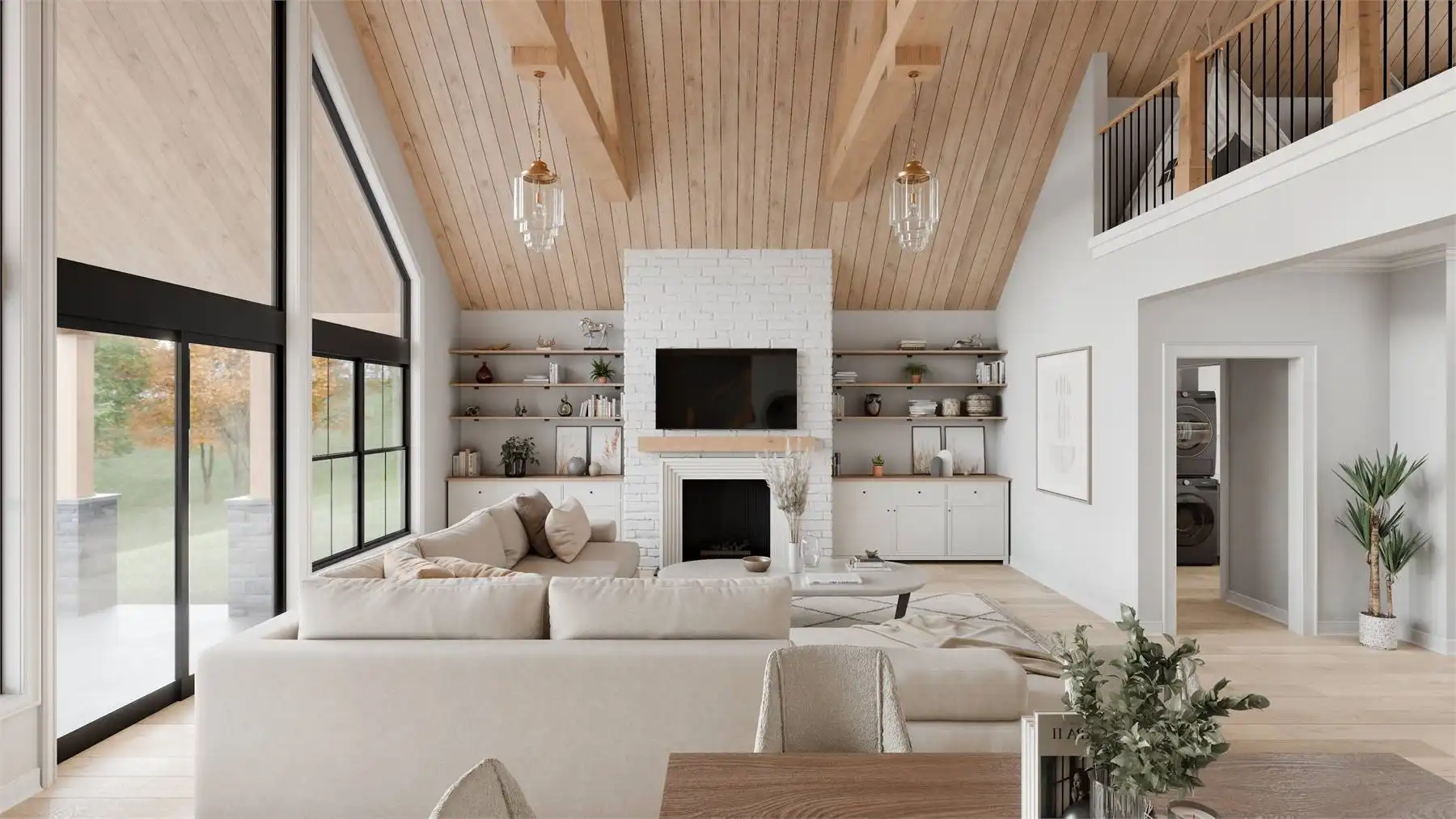 House Plan 11116 is a lovely country ranch with the right kind of design to make it a lake house! Offering 2,202 square feet with two bedrooms and two bathrooms on one level, you'll find additional flexibility in the loft above and the three-car tandem garage on the side. The layout places the great room in the center, with the L-shaped island kitchen by the entry and the vaulted living and dining space beside a wall of windows to take in views. The four-piece primary suite with a walk-in closet is on one side with the laundry room while the second bedroom and a hall bath are placed off the mudroom across the house. Make sure to appreciate all the storage space built into this home!