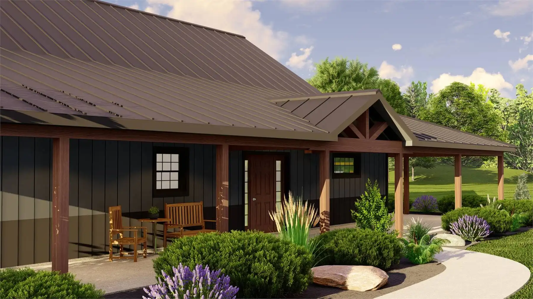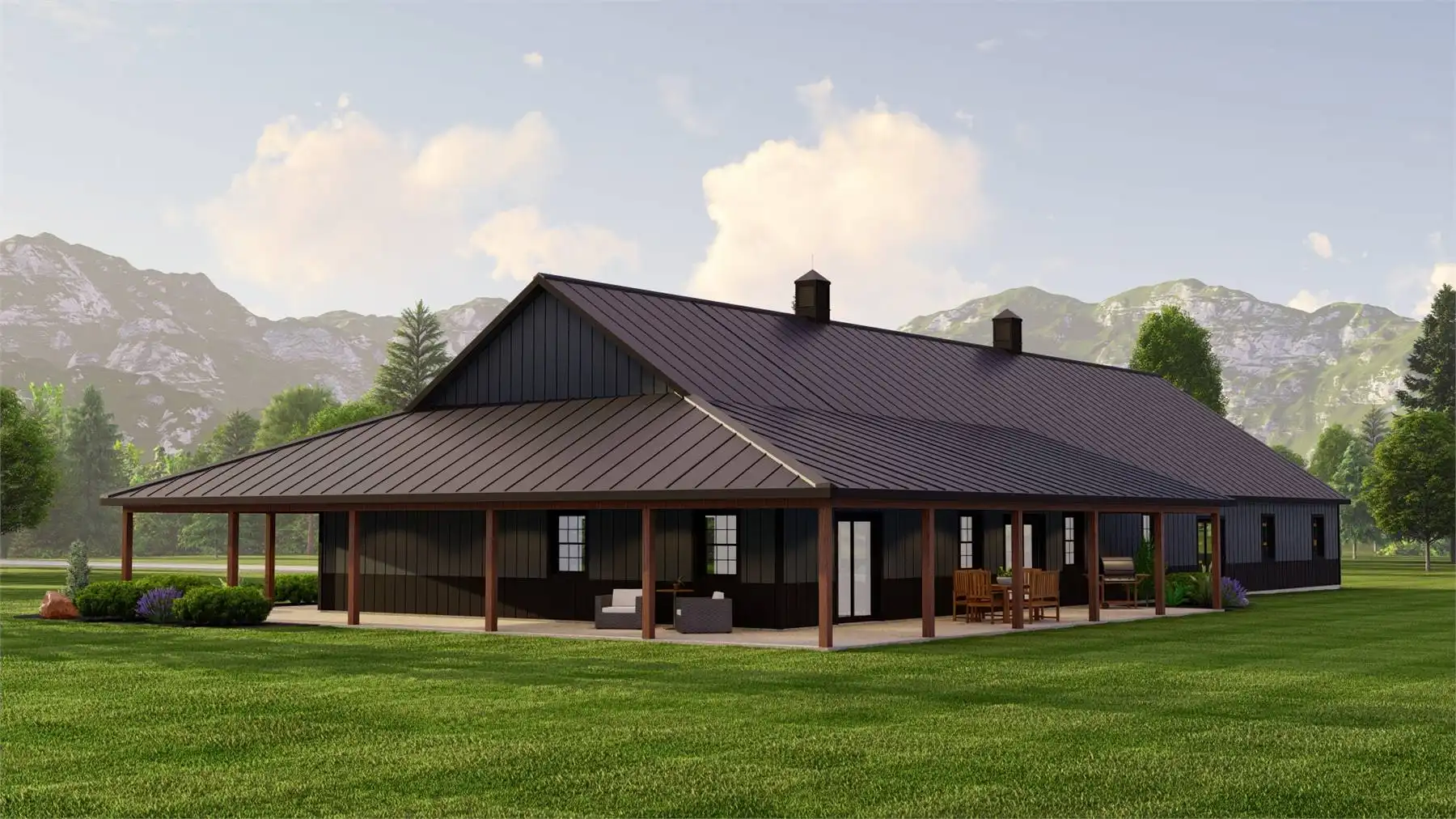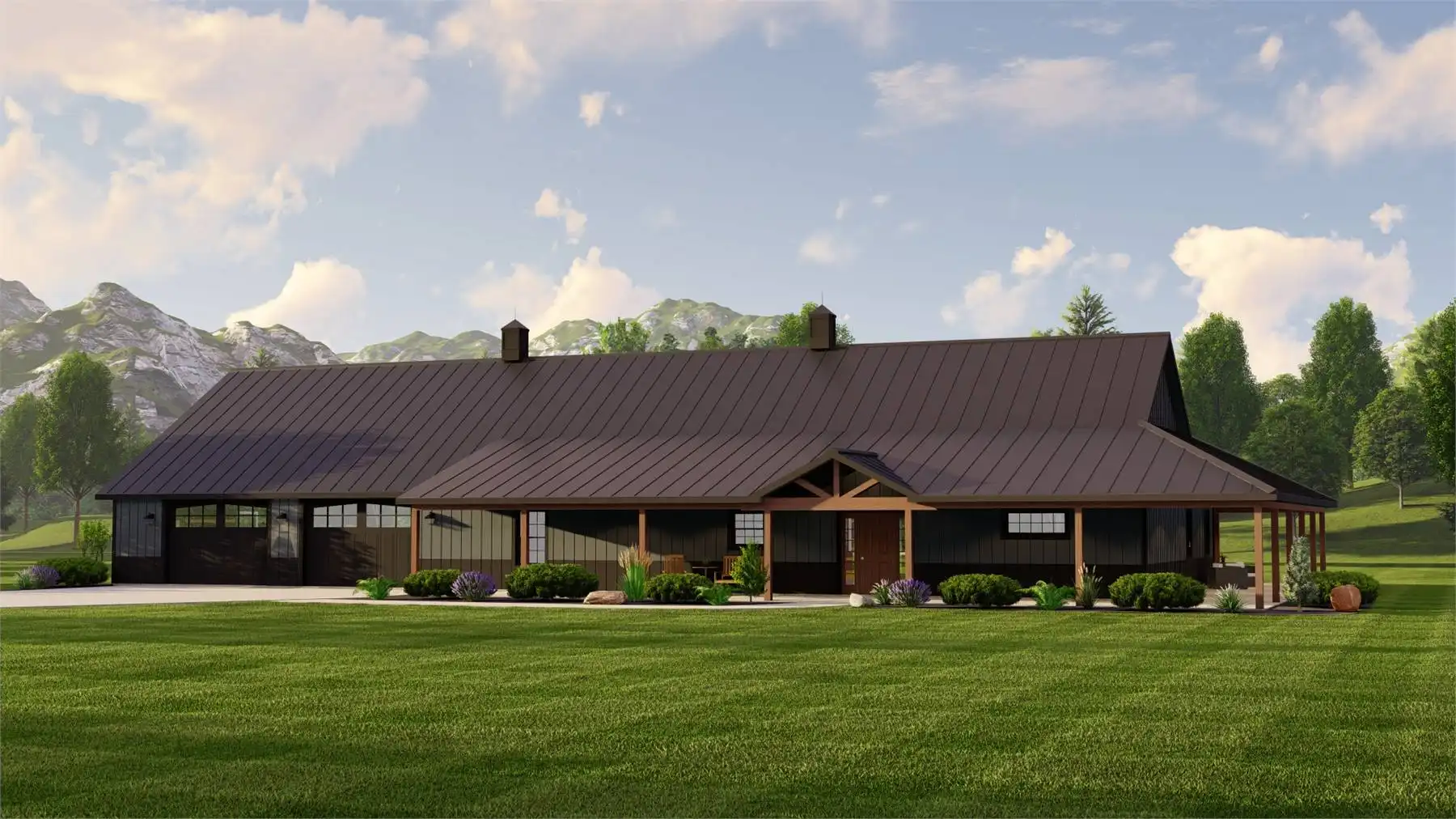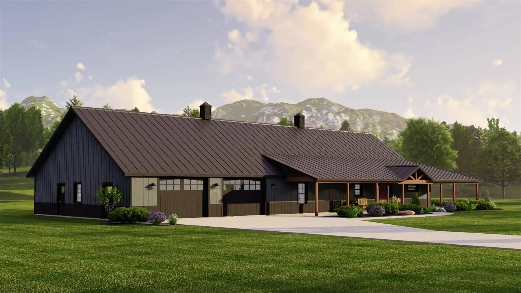 House Plan 11119 is an amazing barndominium with more than meets the eye! it packs 2,400 square feet, three bedrooms, three-and-a-half baths, and a two-car garage into a rectangular footprint for affordable building. Step inside and the open-concept great room welcomes you home with the island kitchen and dining space up front and the living area in back. The bedrooms are split across this and include a five-piece primary suite with two walk-in closets and two secondary bedrooms that share a hall bath. The laundry/mudroom and powder room round out this living areas, but there's more flexibility to be found in the garage, where there's a large storage room with a full bath that's waiting to be made into your home studio or gym!