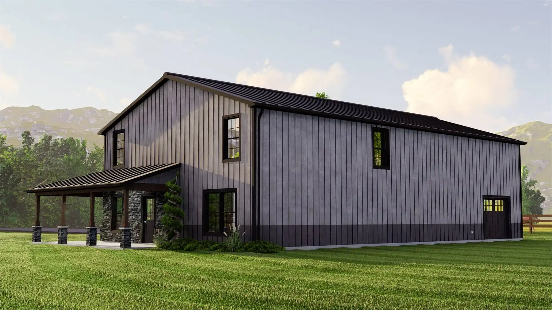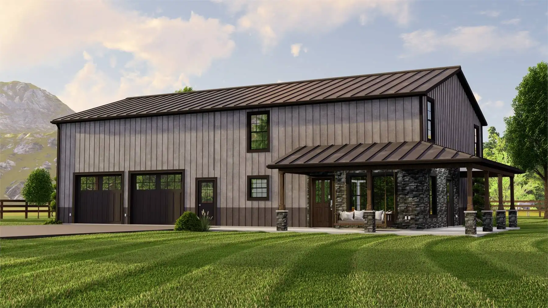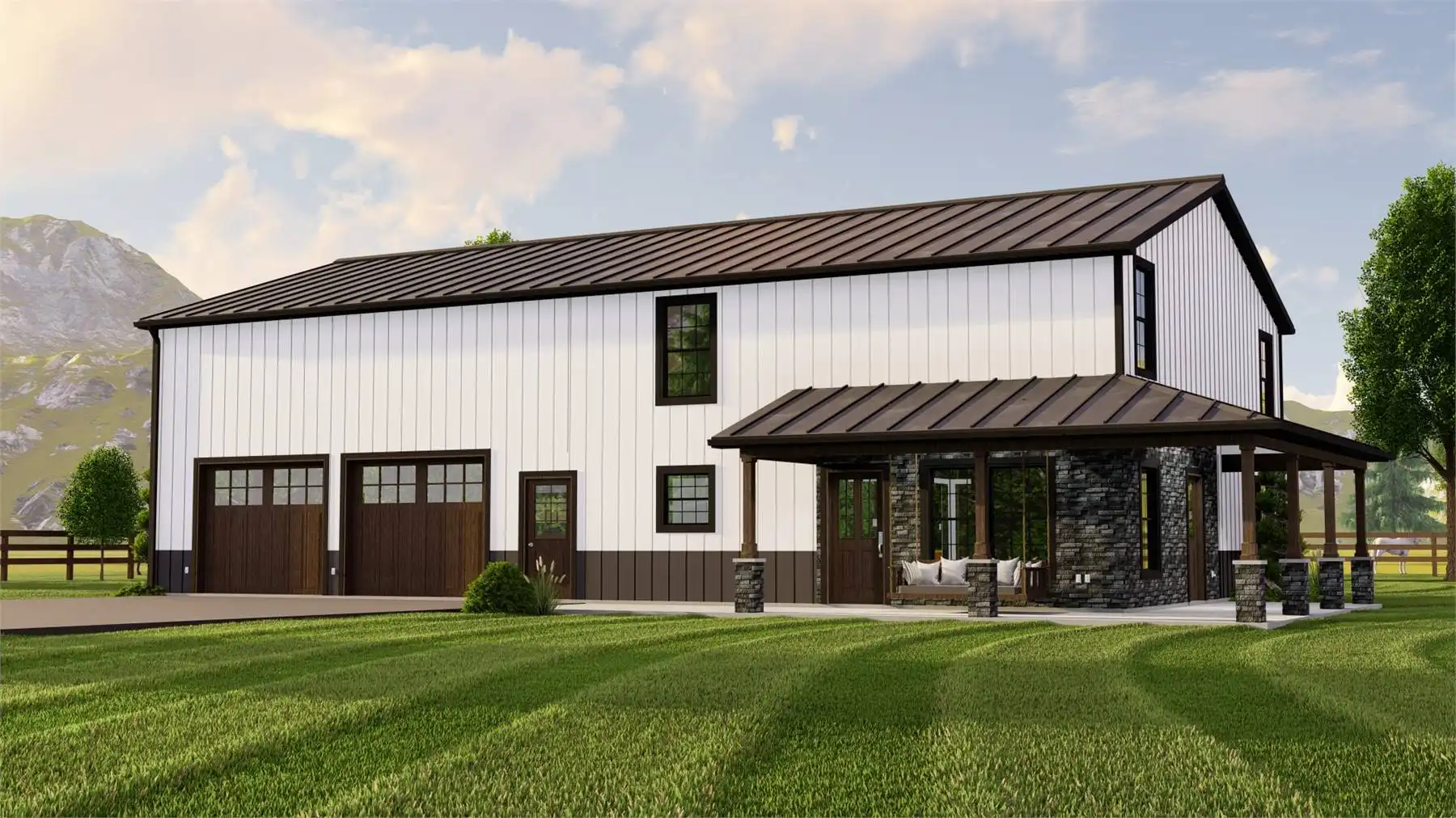 House Plan 11123 is an affordable family barndominium with 2,160 square feet, four bedrooms, and two-and-a-half bathrooms across two stories. The main level offers the open-concept kitchen and living area, the three-piece primary suite with a walk-in closet, the laundry room that connects to the mudroom with access to the three-car garage, and the powder room, of course. Upstairs, three bedrooms share a hall bath and plenty of common loft space. Whether your kids want to use this area for homework or play, they'll appreciate the flexibility!