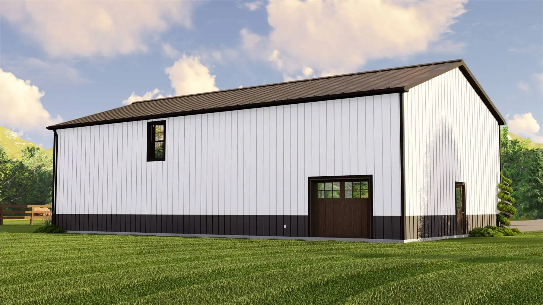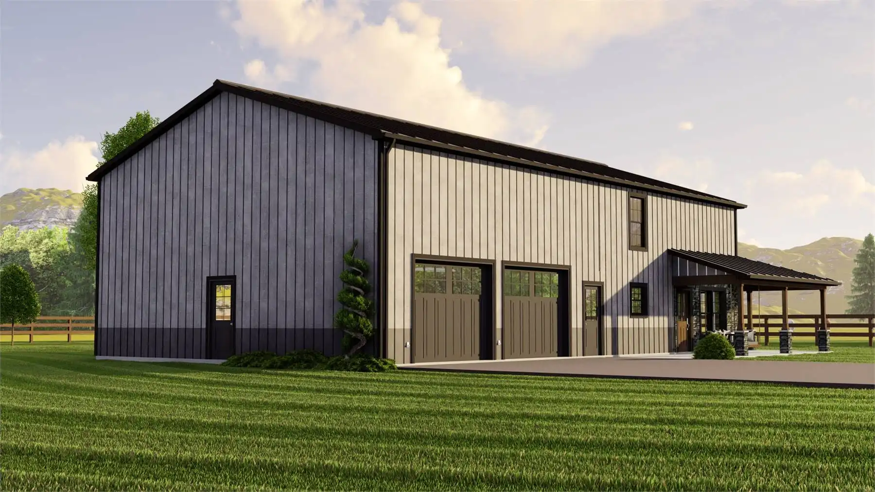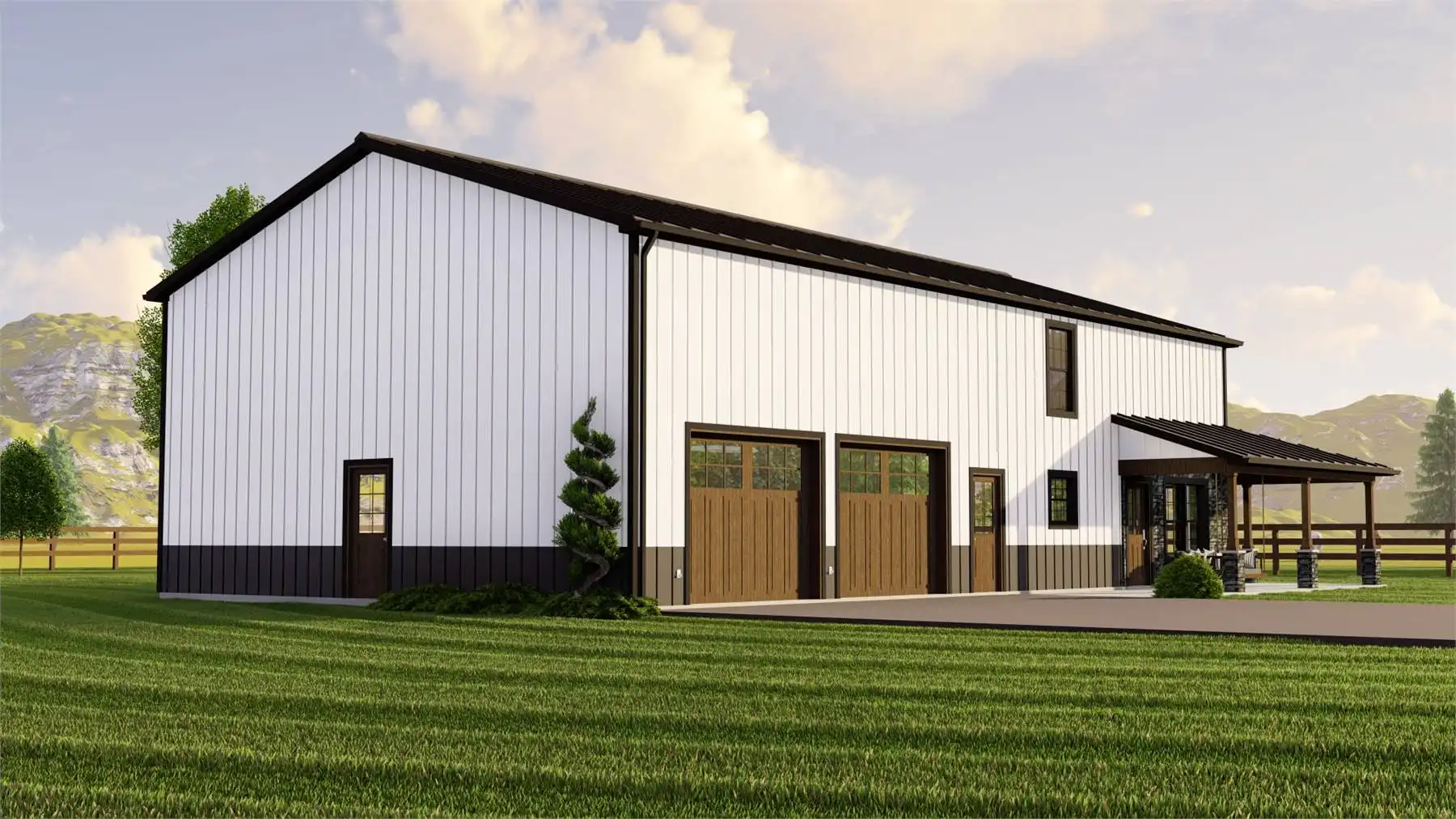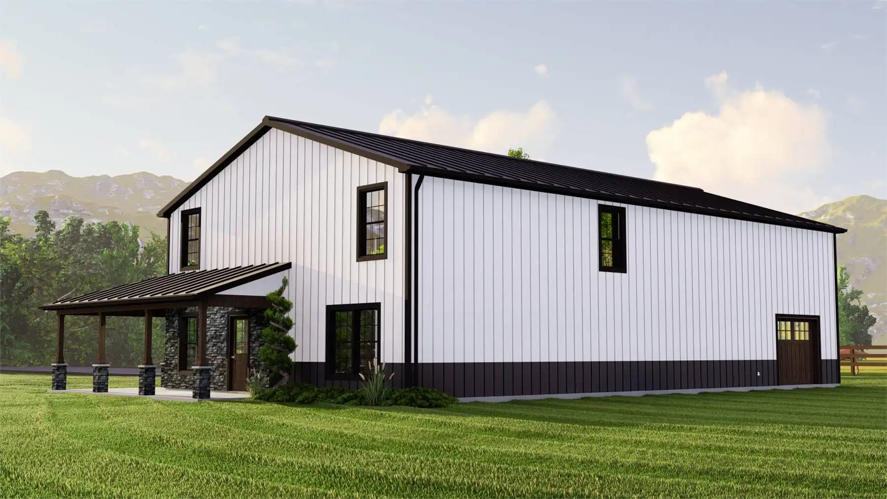House Plan 11123 is an affordable family barndominium with 2,160 square feet, four bedrooms, and two-and-a-half bathrooms across two stories. The main level offers the open-concept kitchen and living area, the three-piece primary suite with a walk-in closet, the laundry room that connects to the mudroom with access to the three-car garage, and the powder room, of course. Upstairs, three bedrooms share a hall bath and plenty of common loft space. Whether your kids want to use this area for homework or play, they'll appreciate the flexibility!