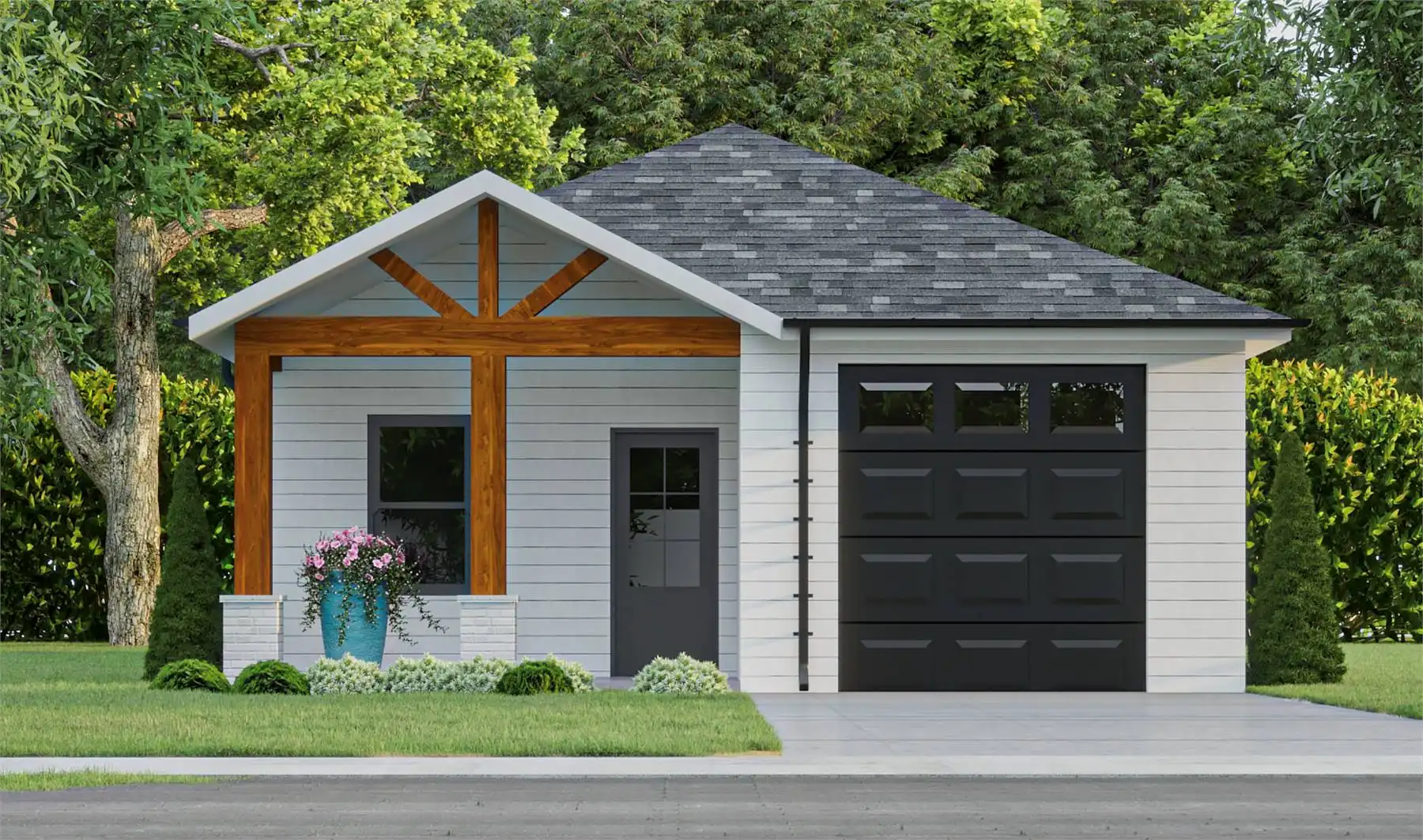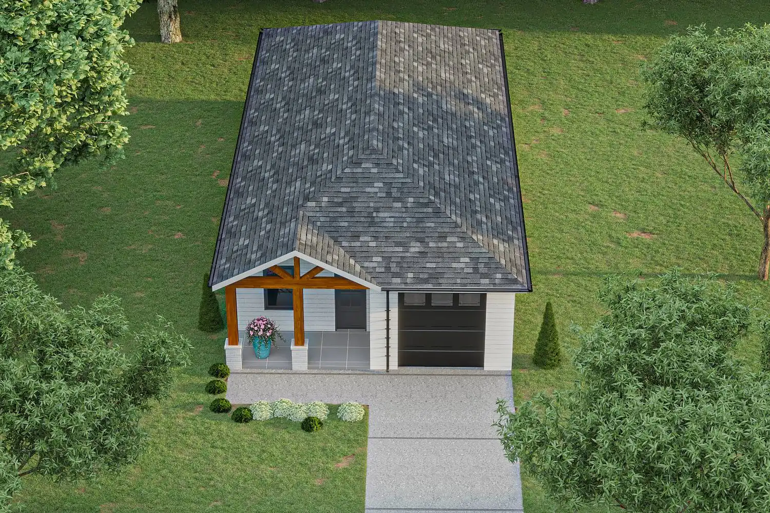 Perfect for efficient living, this 1,018-square-foot ranch features 2 bedrooms, 2 bathrooms, and a 1-car garage. From the covered front porch, step into the foyer where a front study offers a quiet work space. The central open floor plan includes an L-shaped kitchen with island seating and pantry, a dining area, and a bright living room that opens to a covered patio for outdoor enjoyment. Two bedrooms with ample closet space and two full baths are positioned on the left side of the home, creating a comfortable private wing. The garage is situated at the front for everyday convenience.