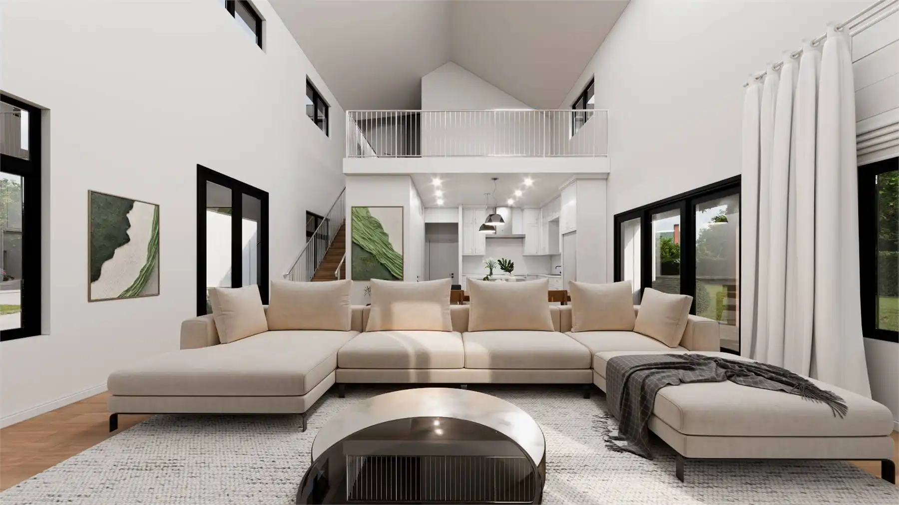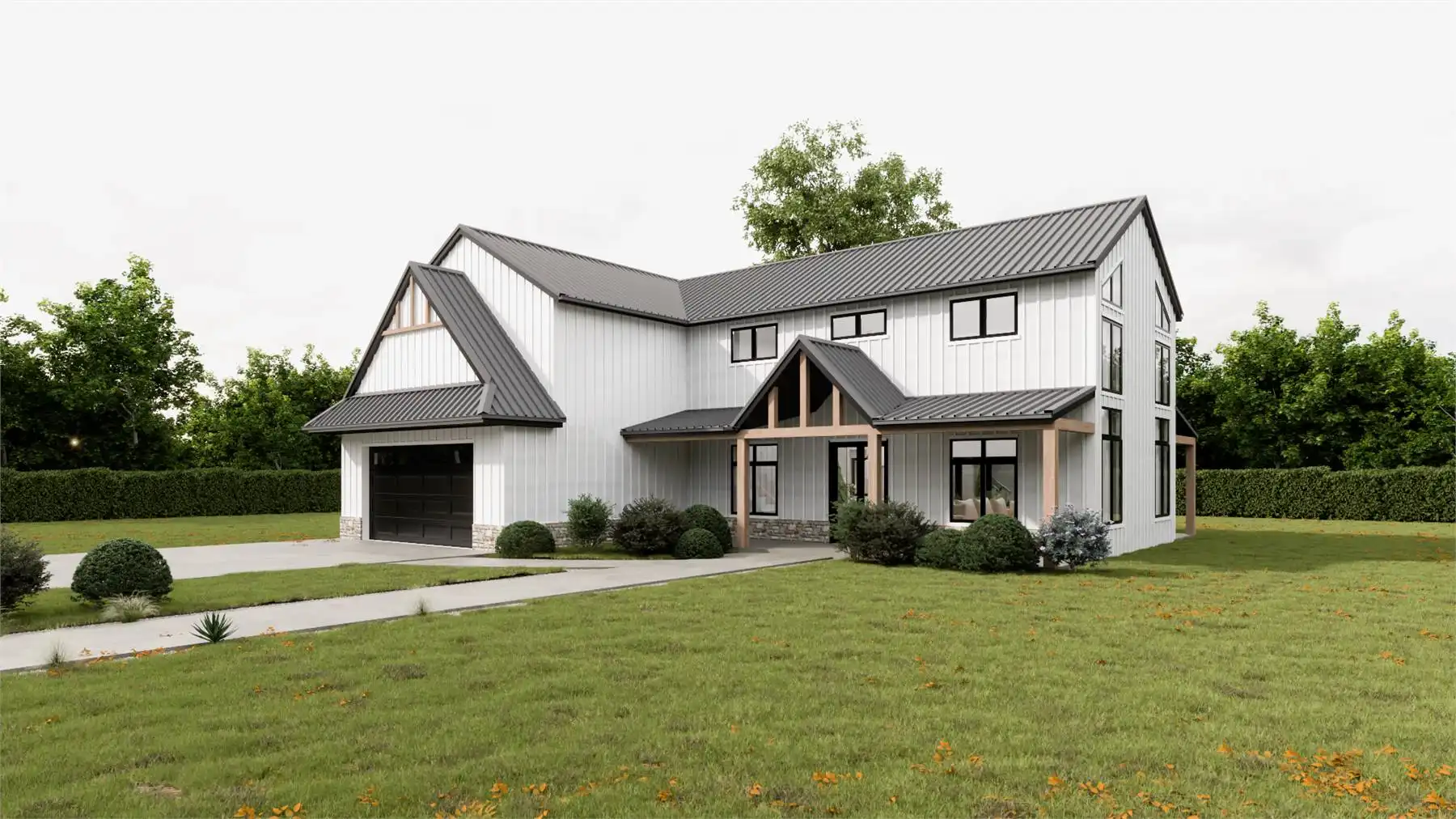 This 2,587-square-foot barndominium design combines rustic charm with modern comfort, featuring 4 bedrooms, 3.5 bathrooms, and a 2-car garage. A wide covered porch leads into the open living area with a fireplace and access to the rear covered patio. The dining space and L-shaped kitchen with a central island and pantry make entertaining effortless. The main floor primary suite offers a soaking tub and generous walk-in closet. Upstairs, a loft and media/game room are surrounded by three bedrooms and two full baths. A mudroom off the garage keeps daily life organized.