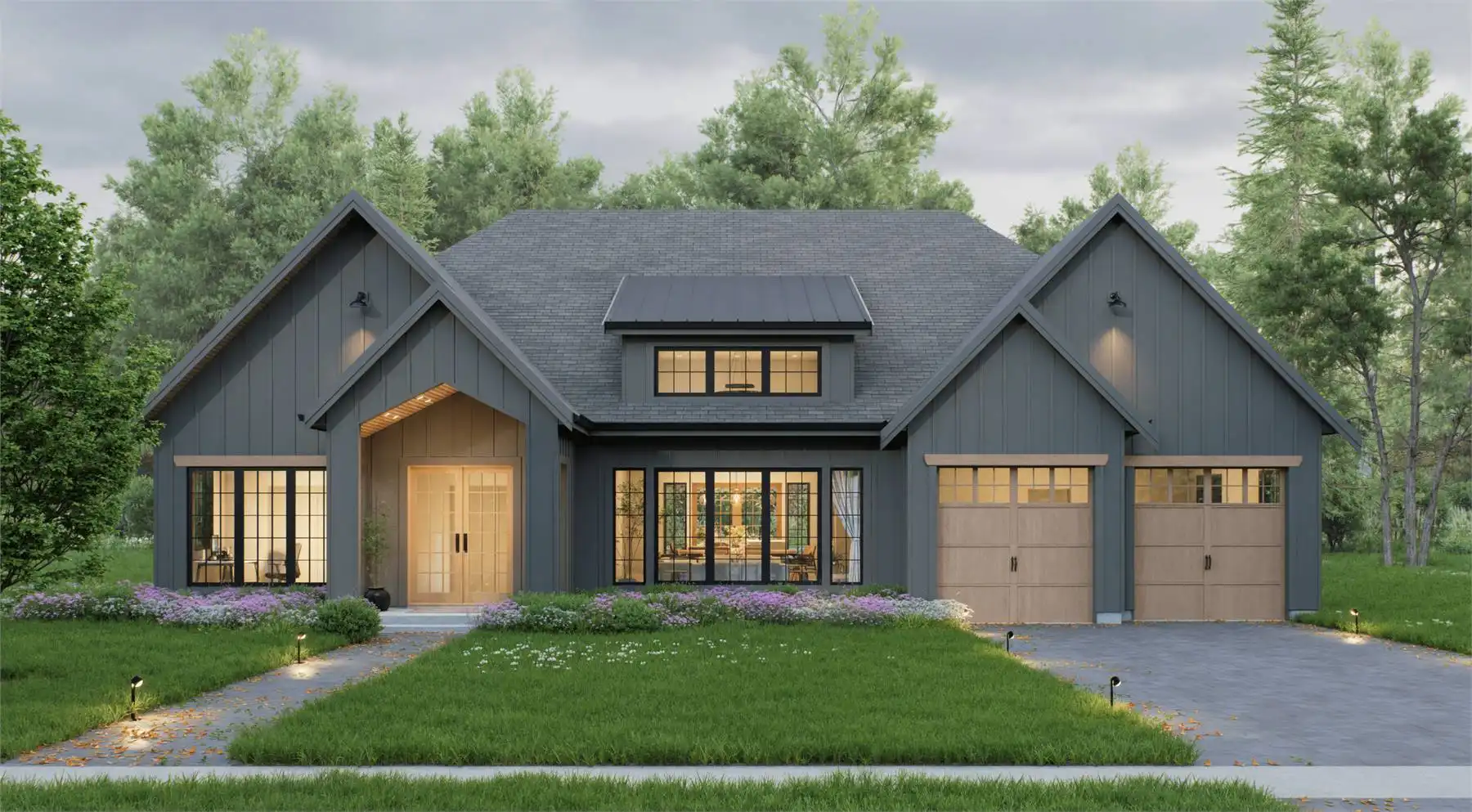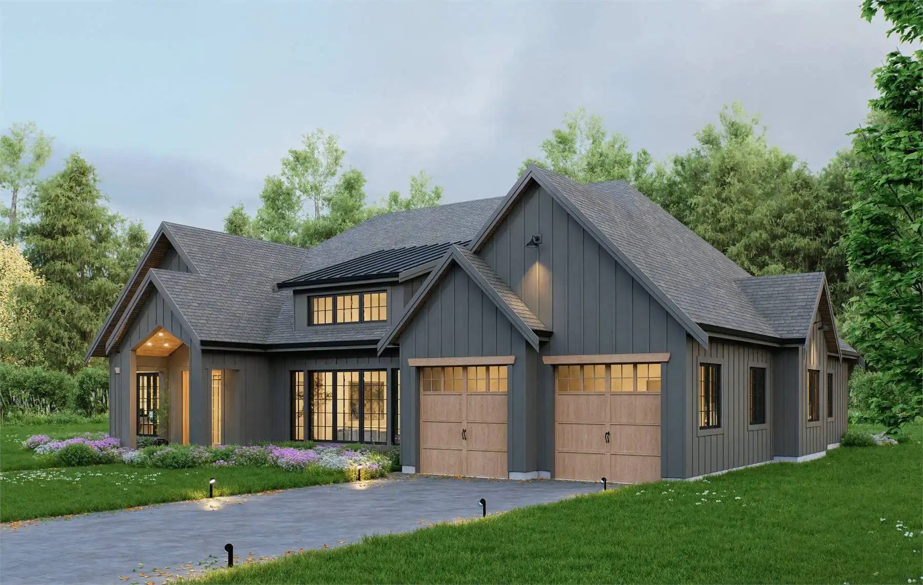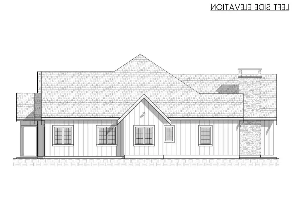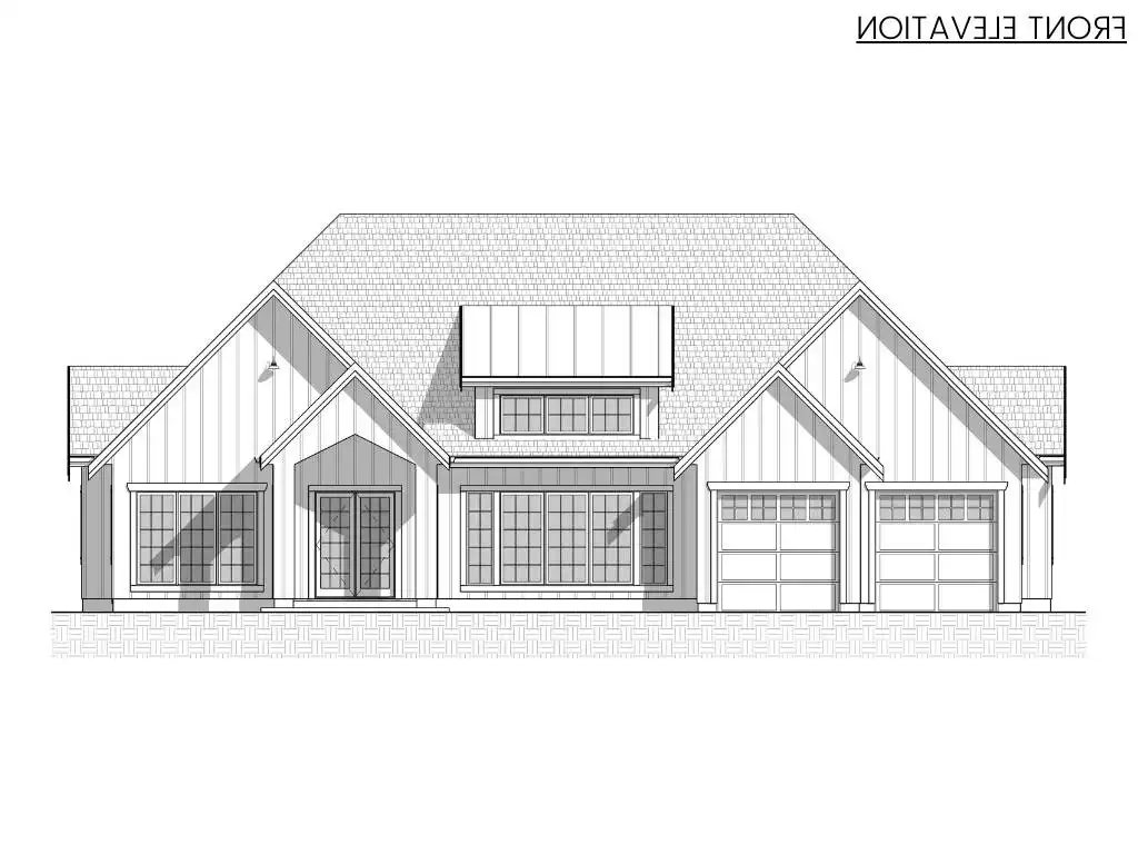 The right side of the home includes two bedrooms, each with its own ensuite bathroom, offering privacy for family and guests. The primary suite is set apart on the left side, featuring a spacious ensuite and a walk-in closet. Additional conveniences include a laundry room and a mudroom with direct access to the 2-car garage and kitchen. This plan blends elegance, functionality, and comfort for today’s lifestyles.
