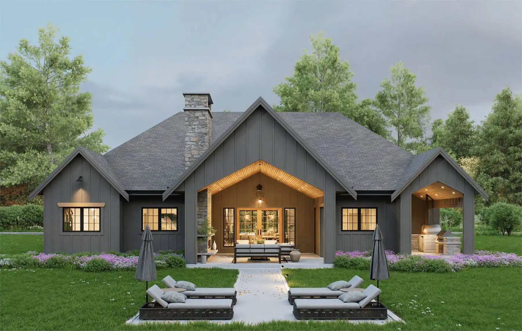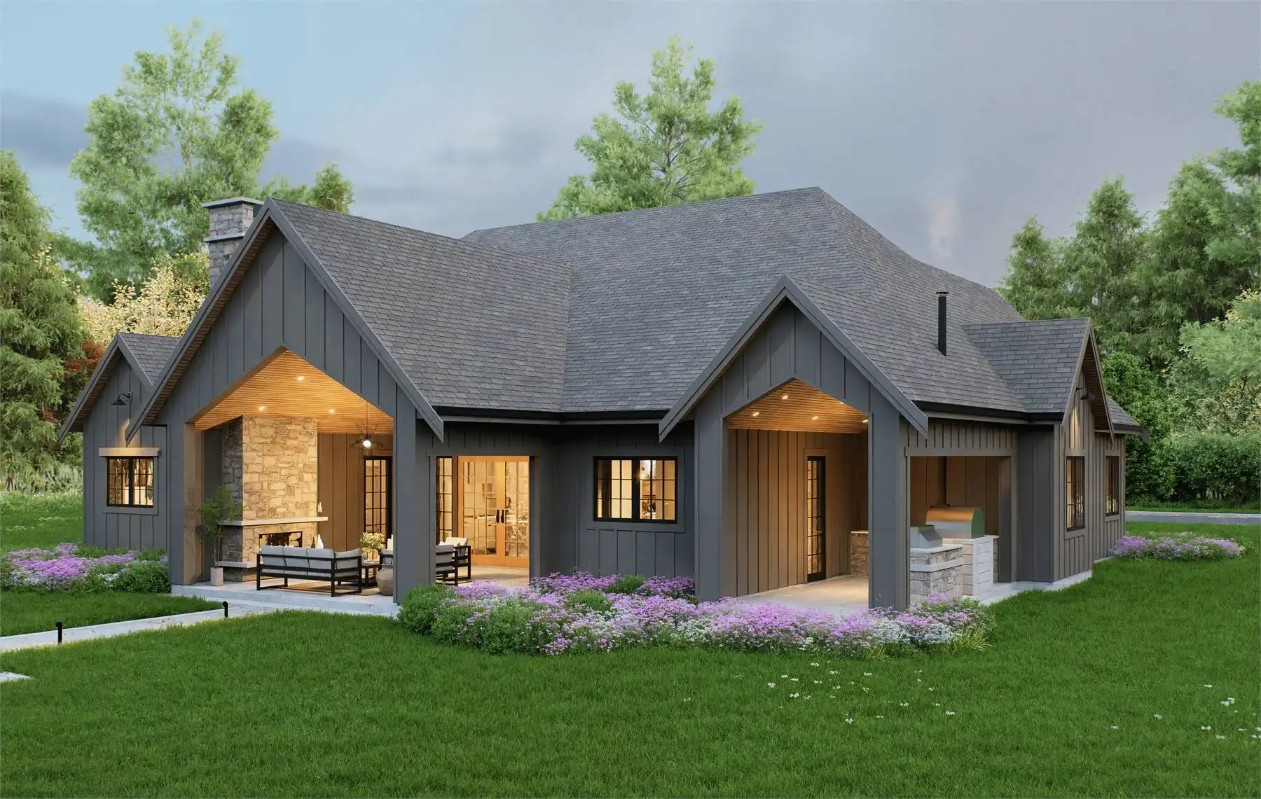 House Plan 11148 is a thoughtfully designed 2,692 square foot ranch-style home with a layout that balances privacy and open living. The vaulted foyer welcomes you inside, where a private office sits to the right, ideal for focused work. To the left, the open floor plan stretches through the heart of the home, showcasing a bright great room with a fireplace, a dining area, and a large kitchen with a breakfast nook. The adjoining prep kitchen opens directly to the grilling patio, while the vaulted rear patio with its own fireplace is perfect for year-round outdoor living.