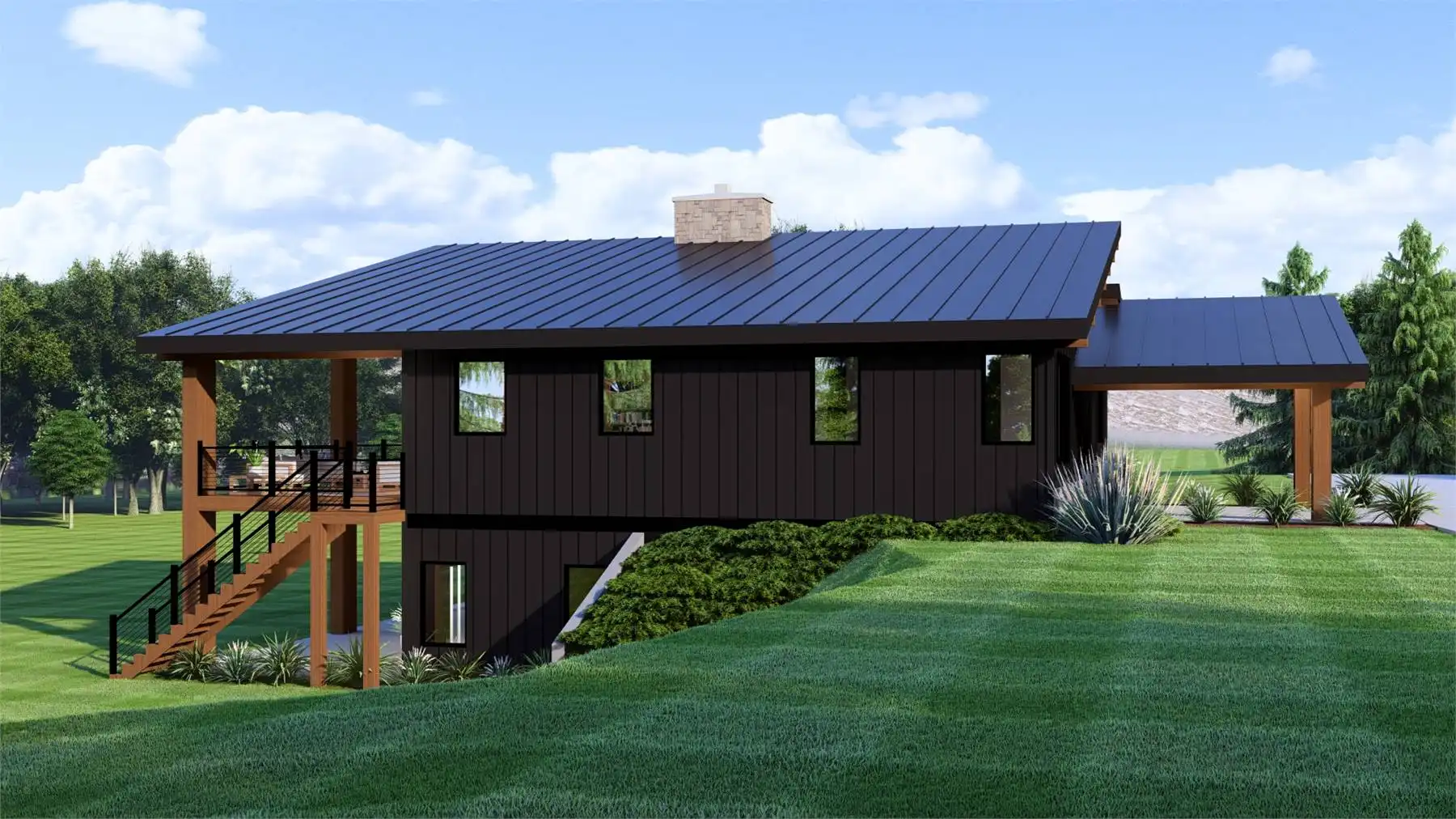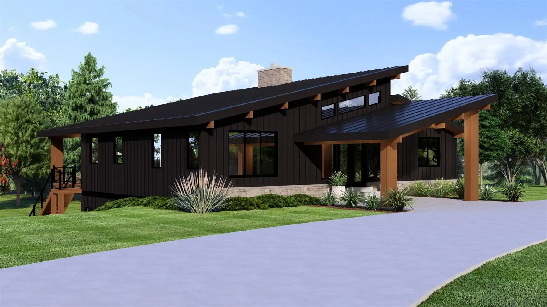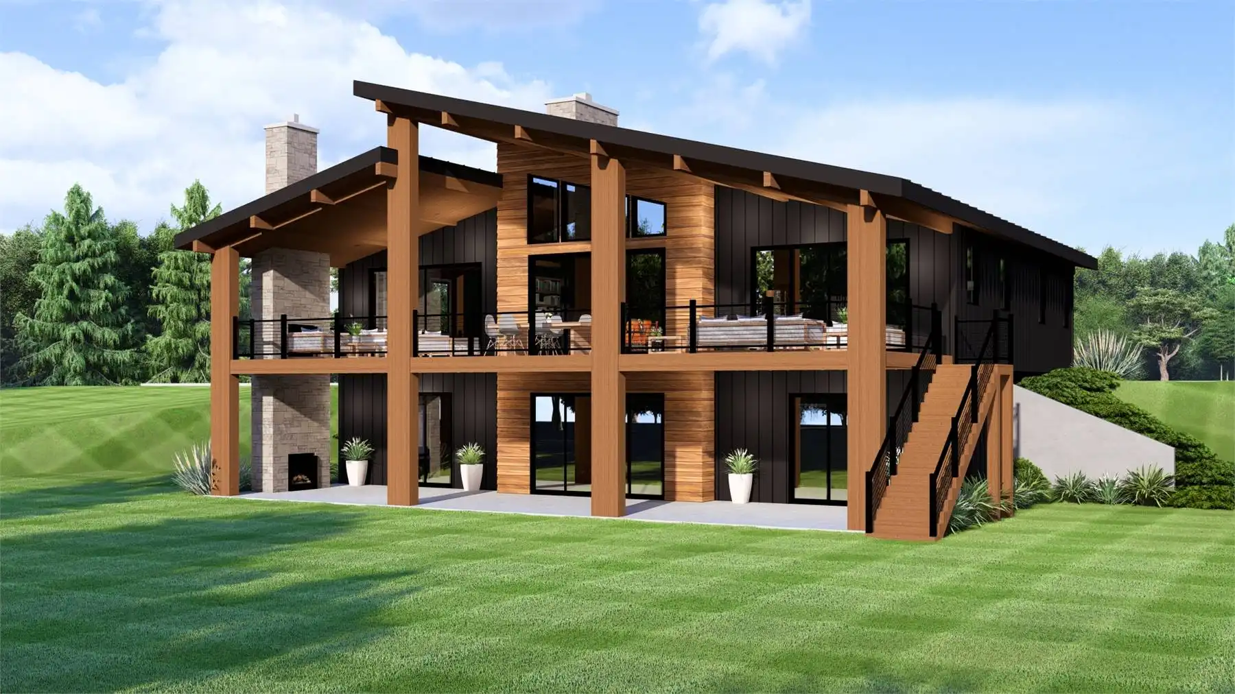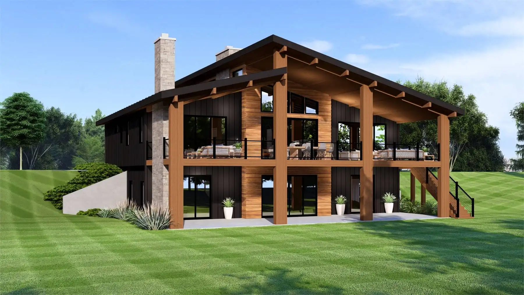 House Plan 11152 combines contemporary design with warm mountain style in a versatile one-story layout. The main level features a great room with soaring sloped ceilings, a cozy fireplace, and walls of windows that open to a full-length covered deck. The kitchen is designed for entertaining with a generous island and walk-in pantry, while the dining area provides direct outdoor access. The primary suite includes a spa-inspired bath and walk-in closet, while two additional bedrooms and a shared bath complete the first floor. The optional lower level doubles the living space with an exercise room, media room, guest suite, and storage. With outdoor living front and back plus open interior gathering spaces, House Plan 11152 is perfectly suited for sloping lots and scenic views.
