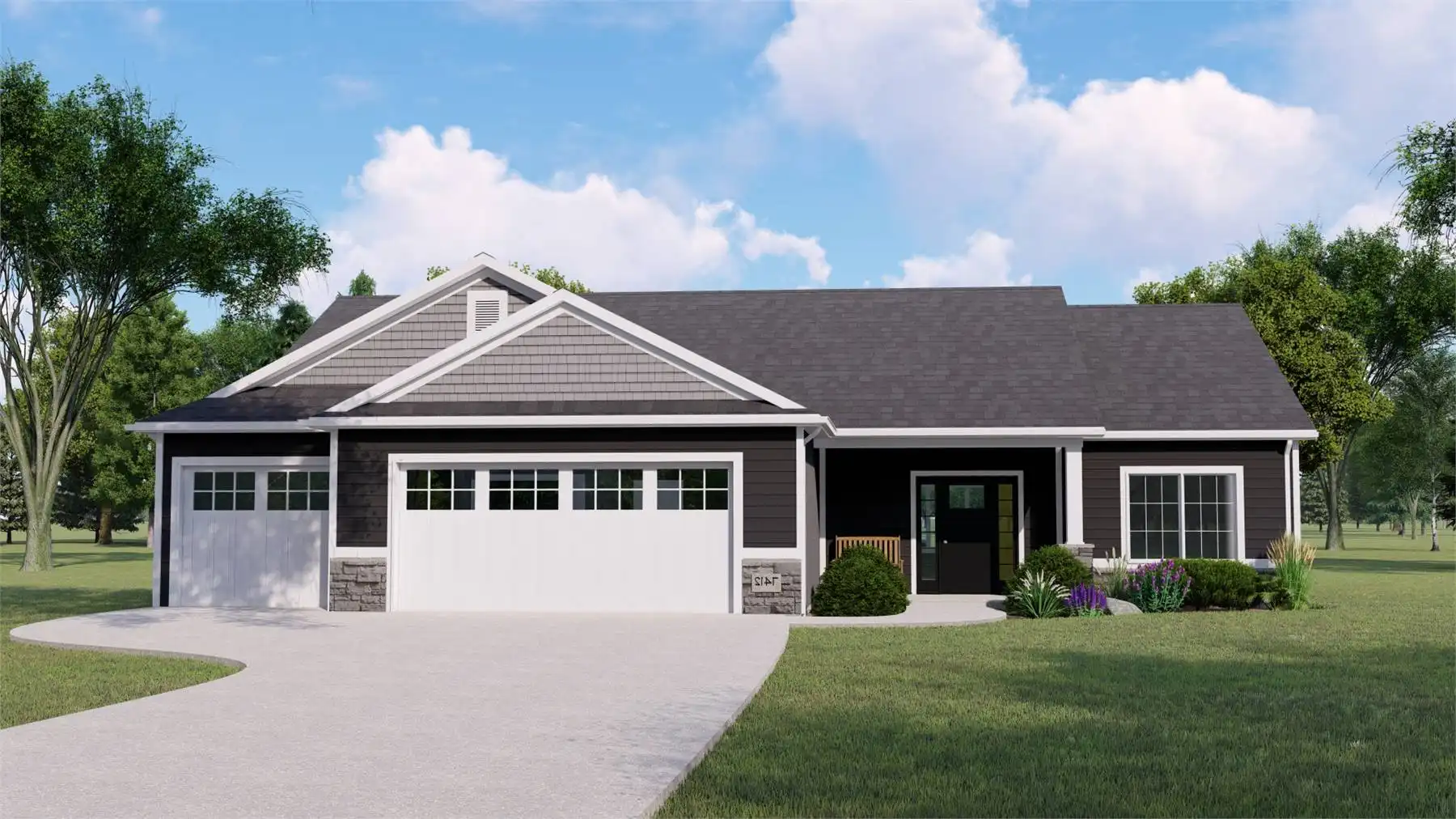 House Plan 11153 is a lovely smaller ranch for a family with a three-car front-entry garage--perfect for those who need some extra space for vehicles! Inside, you'll find 1,630 square feet with three split bedrooms and two bathrooms. The open-concept great room fills out the heart of the home and includes a kitchen with an angled island that looks over the living and dining space. The primary suite is tucked behind the garage, near the laundry/mudroom, and includes a four-piece bath while the bedrooms on the opposite side of the house share a hall bath.