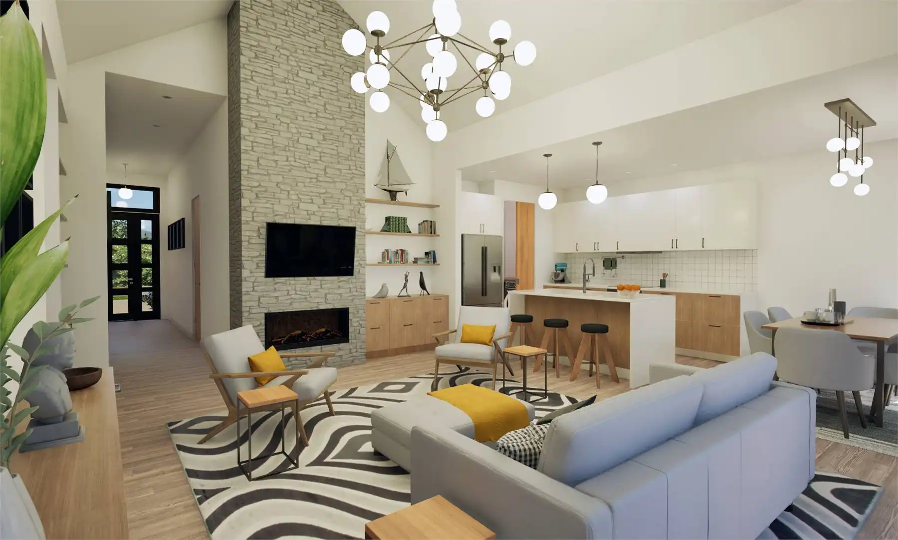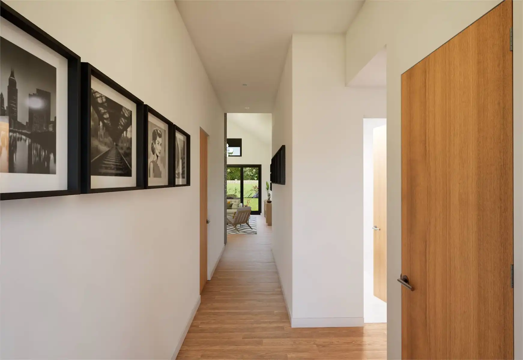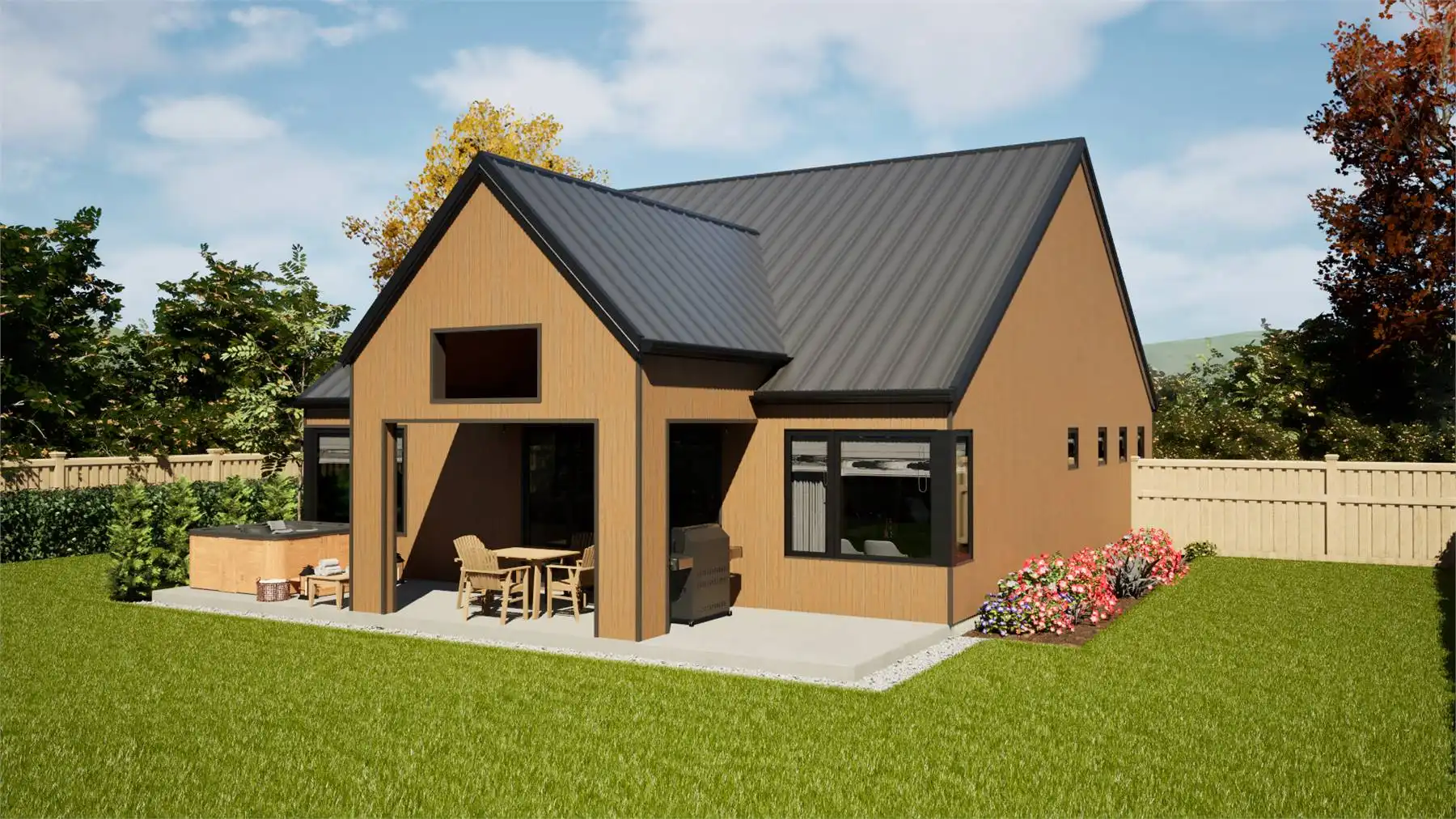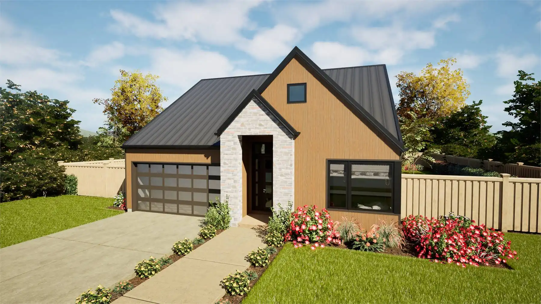 House Plan 11162 is a lovely little transitional home of Scandinavian inspiration. It offers 1,393 square feet with three bedrooms and two bathrooms on one story as well as a two-car garage for parking flexibility. The layout places two bedrooms and a hall bath off the foyer, the four-piece primary suite behind that, and the open-concept great room with a vaulted ceiling and an island kitchen behind the garage. The laundry and a pantry are conveniently consolidated off the kitchen while the back porch continues the vaulted ceiling of the great room for amazing ambiance!