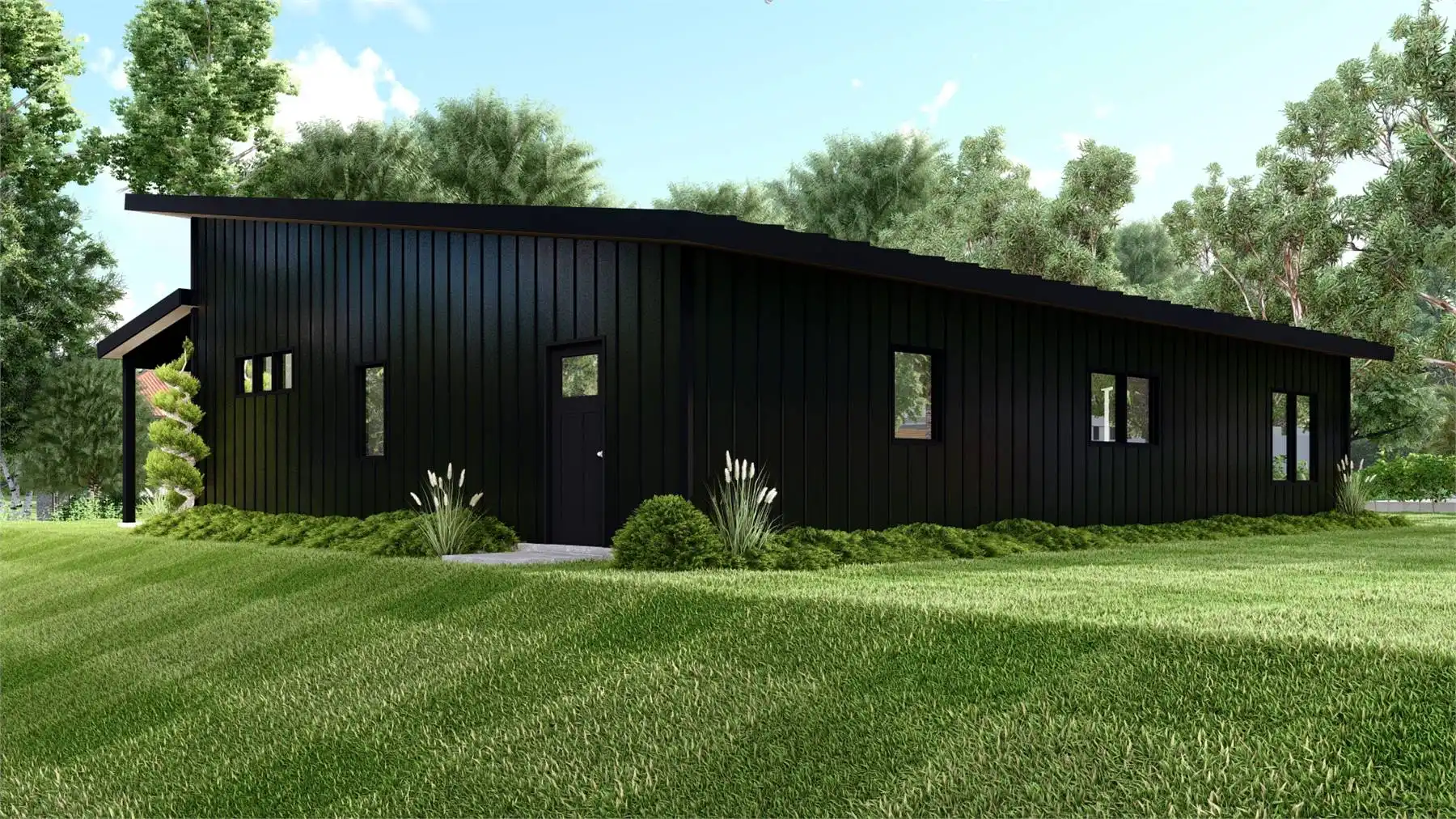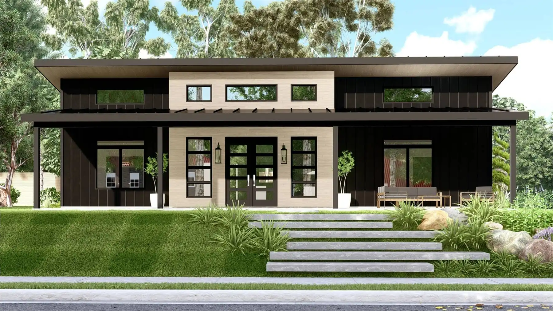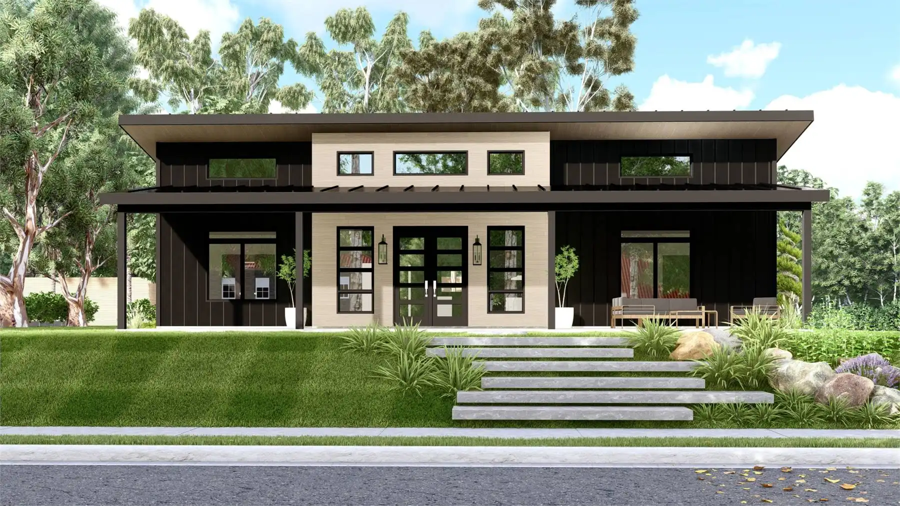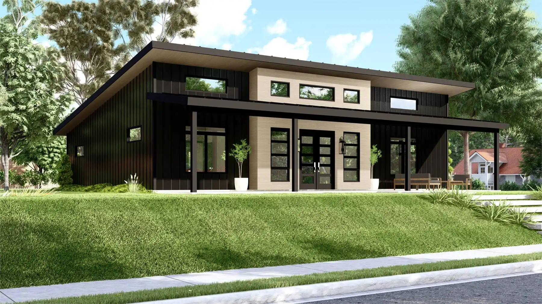House Plan 11165 is a gorgeous little contemporary home with sleek style and 1,838 square feet, three bedrooms, and two bathrooms in a split layout. The great room has a sloped ceiling and clerestory windows over the living area with a fireplace. The dining and U-shaped island kitchen are placed in back. Check out that massive laundry/mudroom, too! The primary suite on one side has a four-piece bath and a walk-in closet while bedrooms on the opposite side of the house share a hall bath.