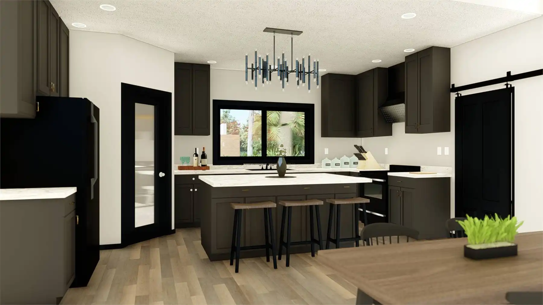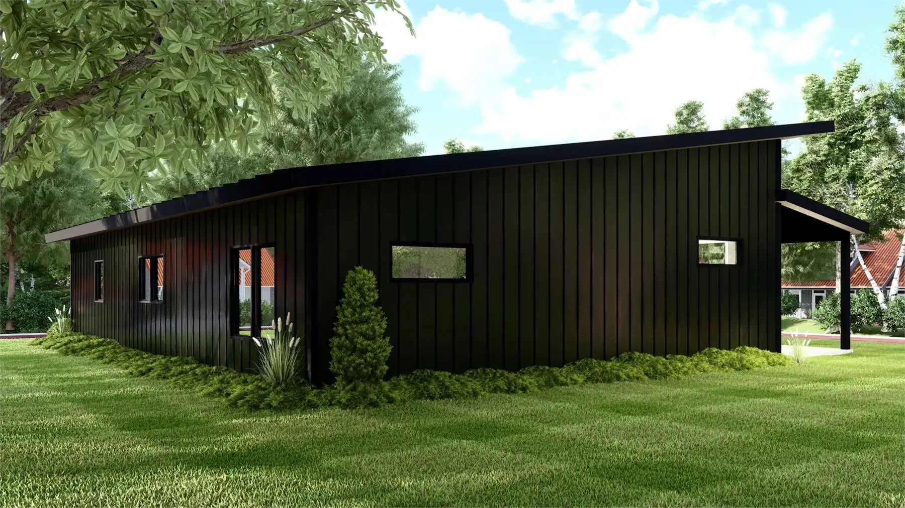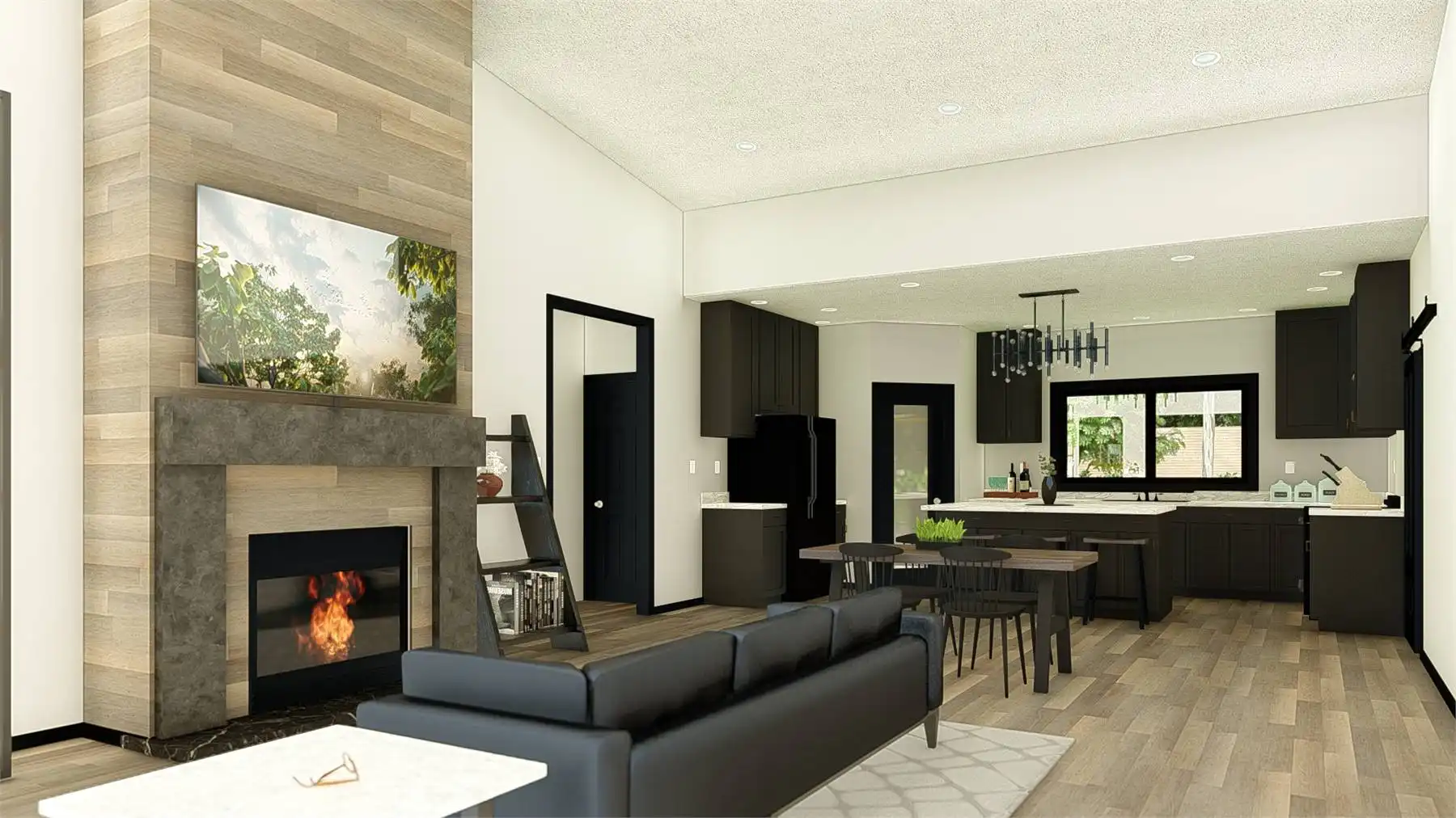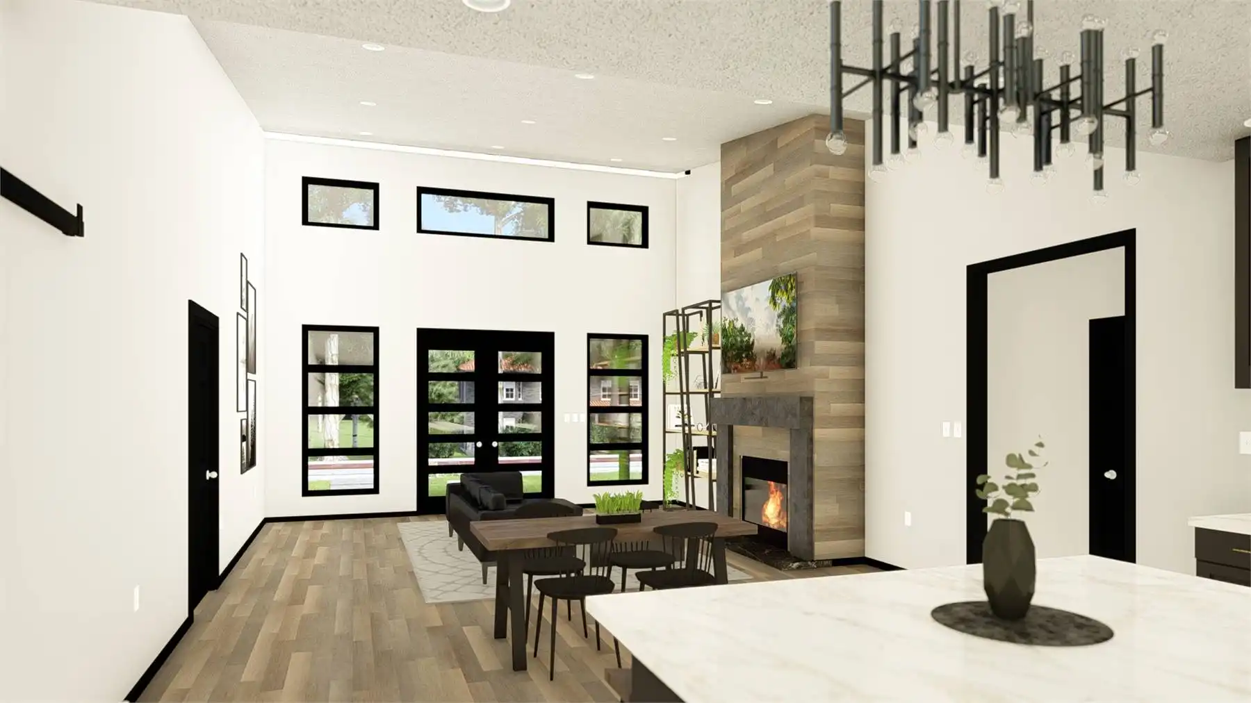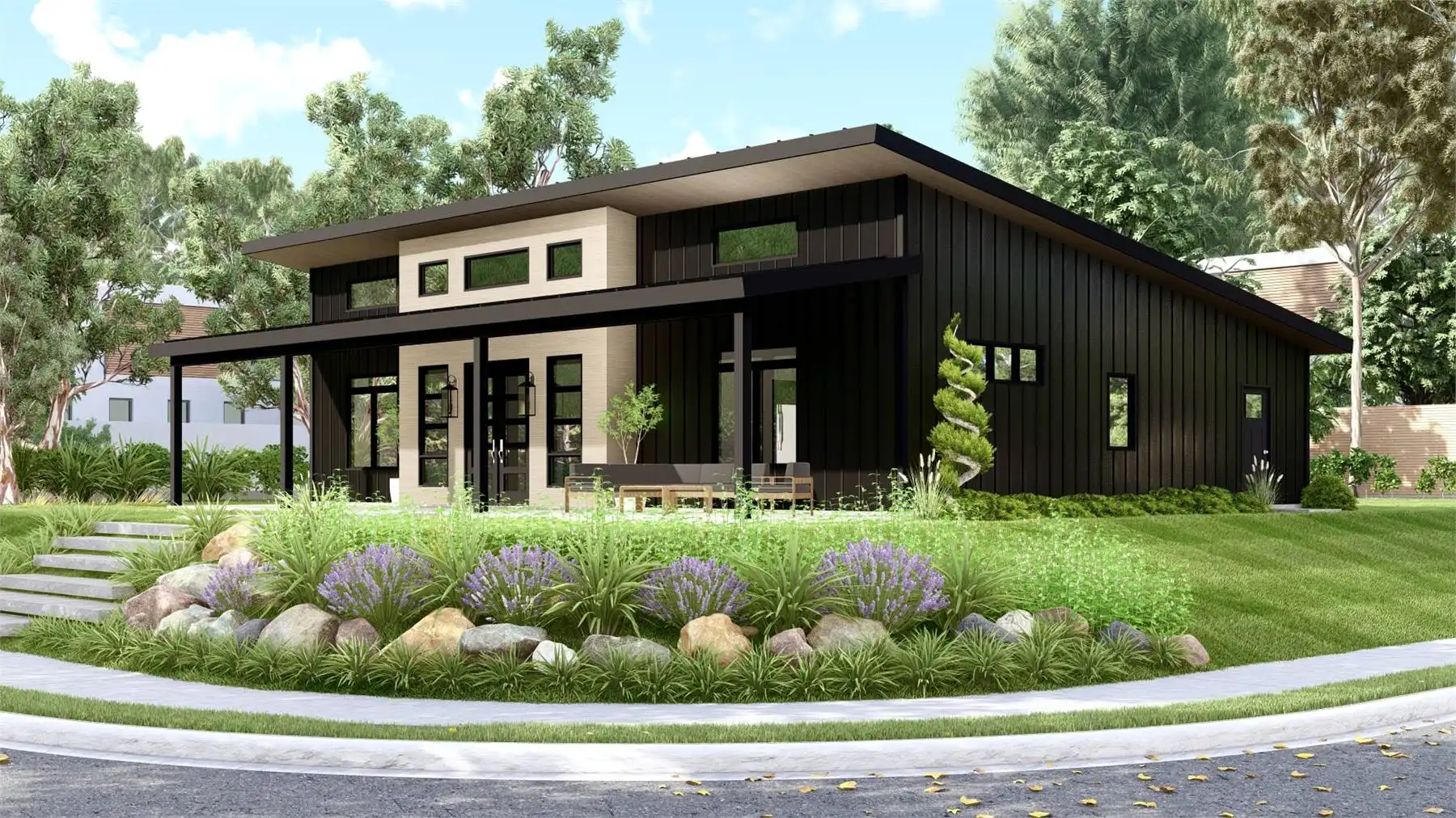 House Plan 11165 is a gorgeous little contemporary home with sleek style and 1,838 square feet, three bedrooms, and two bathrooms in a split layout. The great room has a sloped ceiling and clerestory windows over the living area with a fireplace. The dining and U-shaped island kitchen are placed in back. Check out that massive laundry/mudroom, too! The primary suite on one side has a four-piece bath and a walk-in closet while bedrooms on the opposite side of the house share a hall bath.