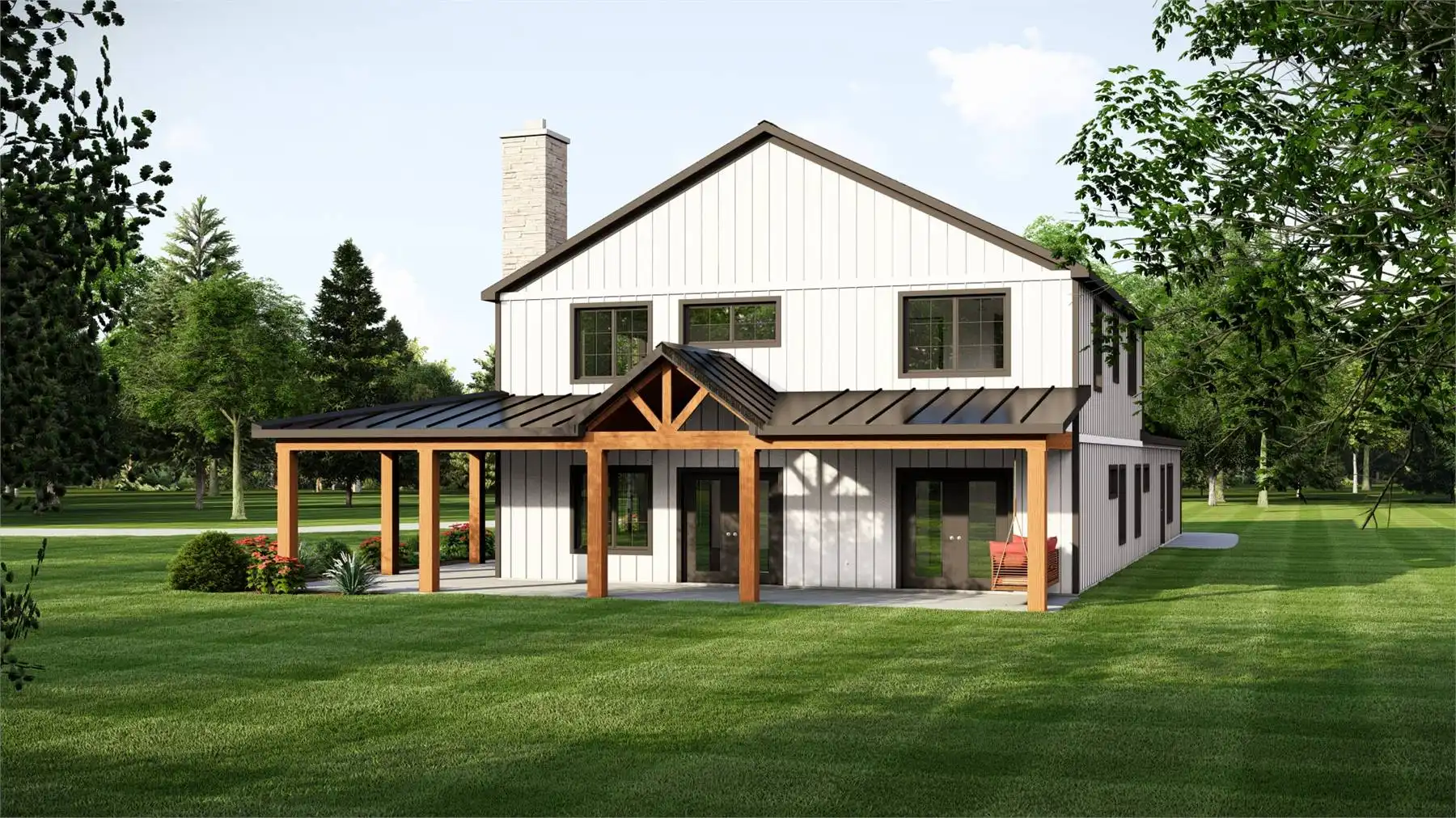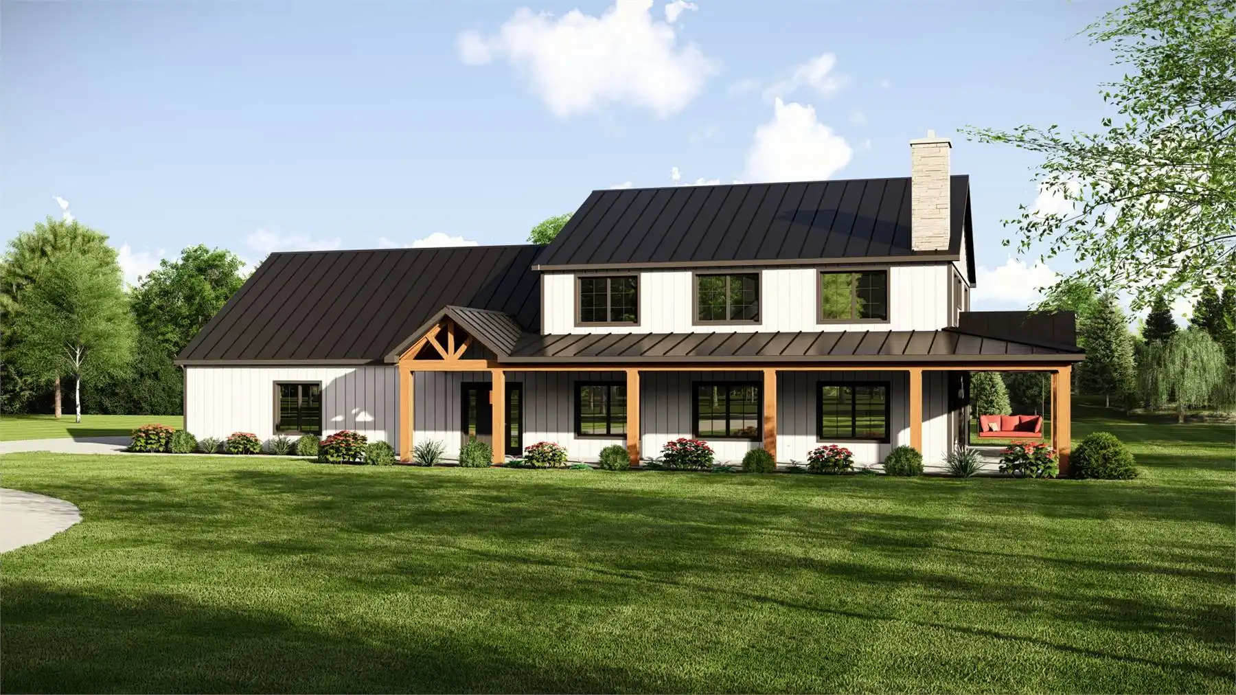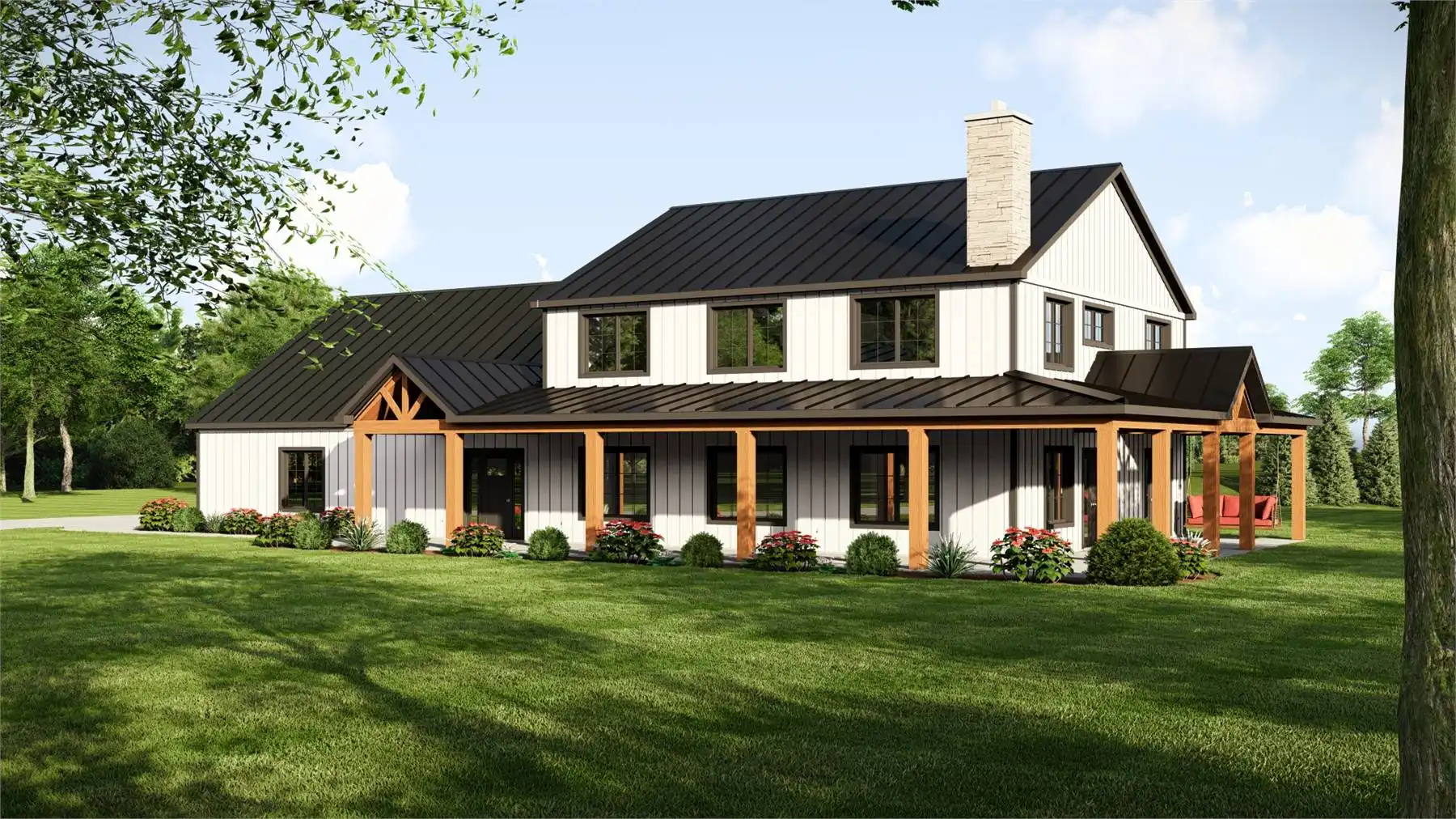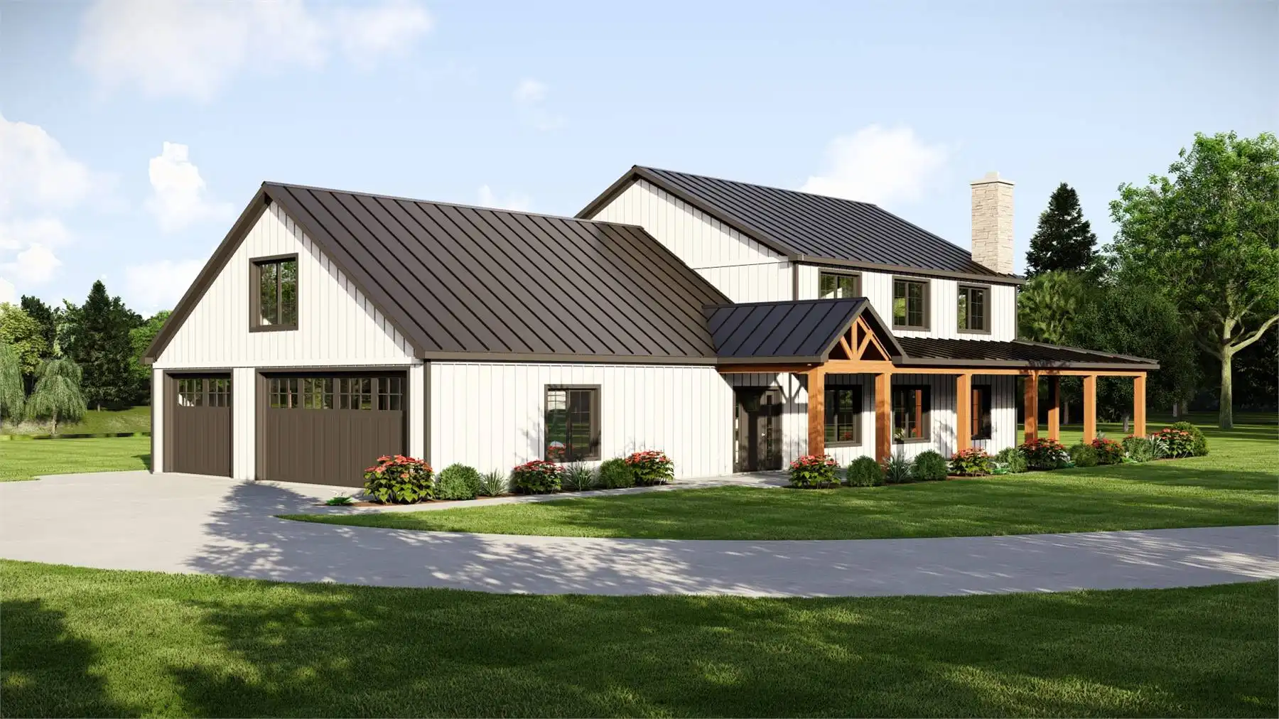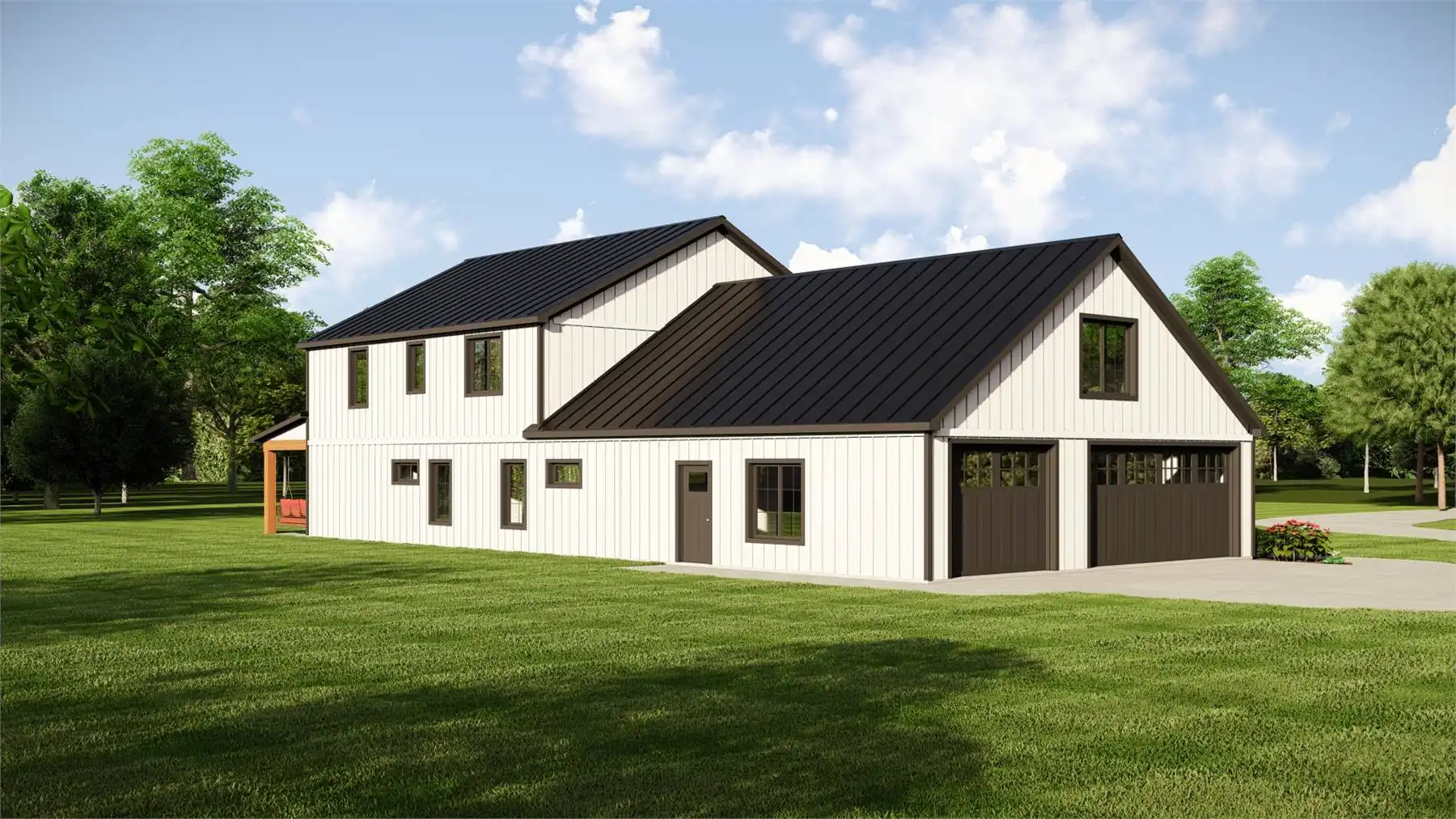 Plan 11167 captures everything homeowners love about a barndominium with modern farmhouse appeal. This 2,743-square-foot design features five bedrooms, three bathrooms, and endless spaces that blend style with functionality. The exterior showcases a generous wraparound porch, while inside, the two-story great room welcomes you with bright, open living. The dining area and expansive island kitchen create the perfect setting for gatherings, with room to seat family and friends.