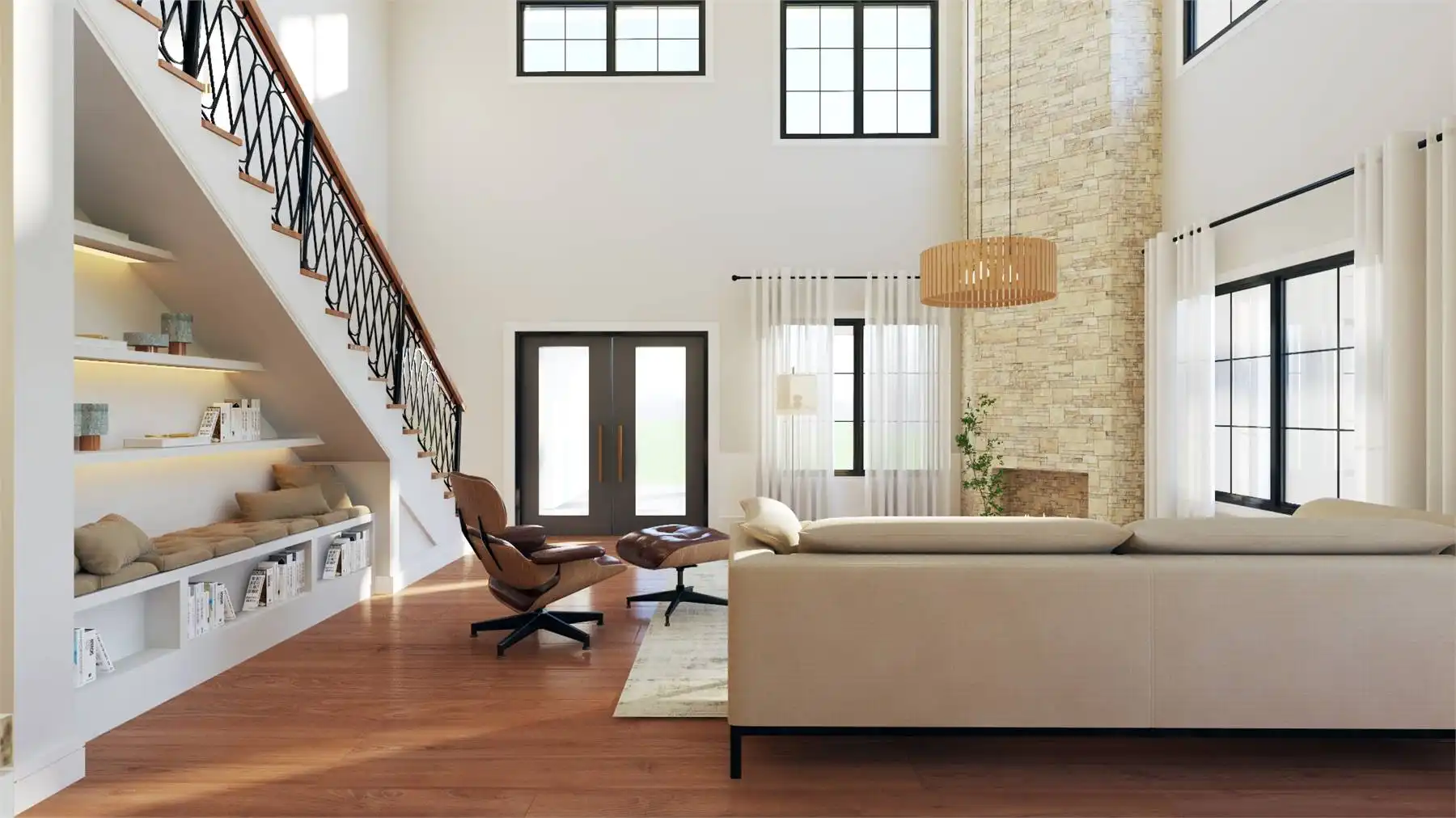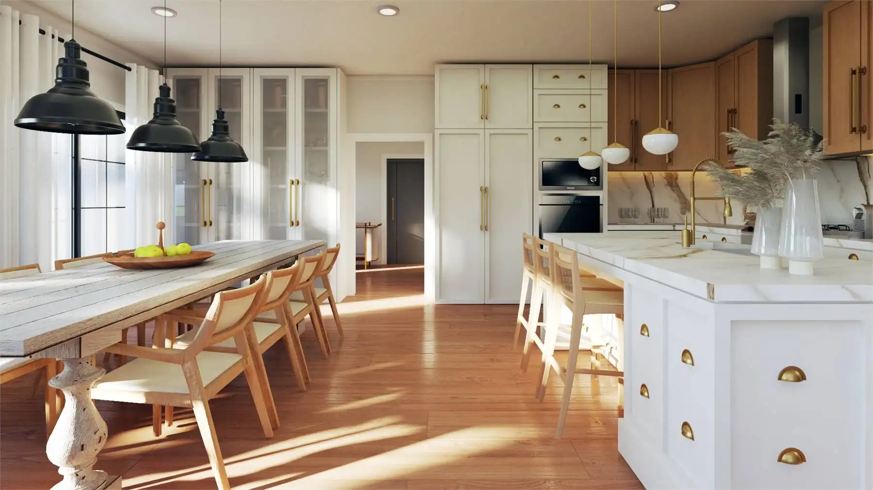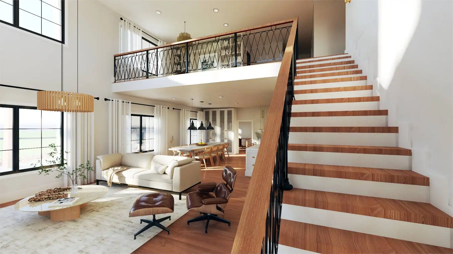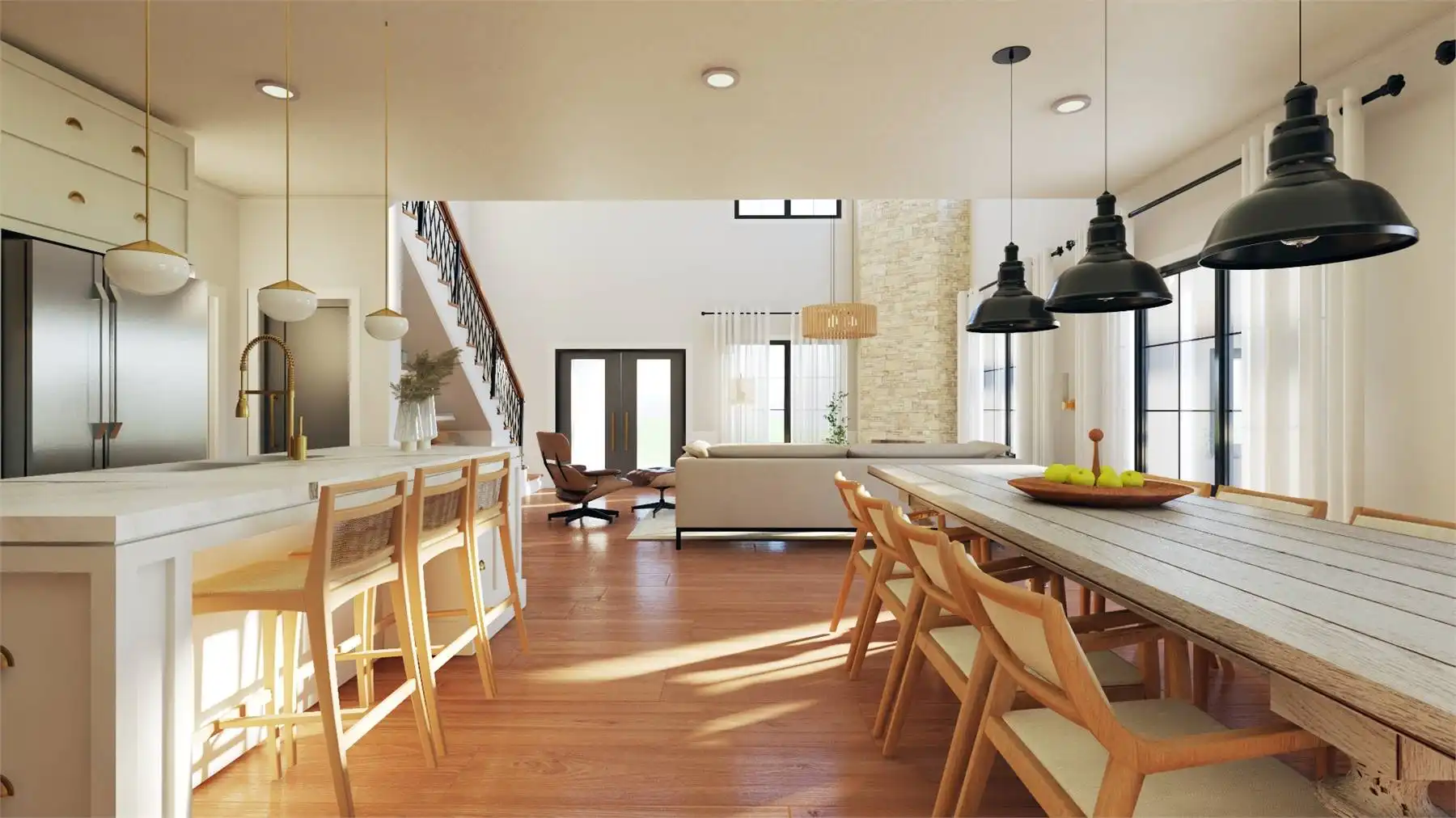 Plan 11167 captures everything homeowners love about a barndominium with modern farmhouse appeal. This 2,743-square-foot design features five bedrooms, three bathrooms, and endless spaces that blend style with functionality. The exterior showcases a generous wraparound porch, while inside, the two-story great room welcomes you with bright, open living. The dining area and expansive island kitchen create the perfect setting for gatherings, with room to seat family and friends.
